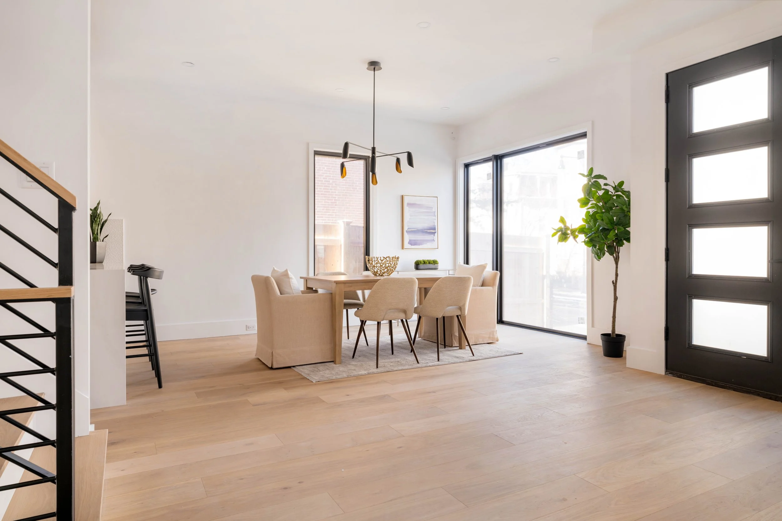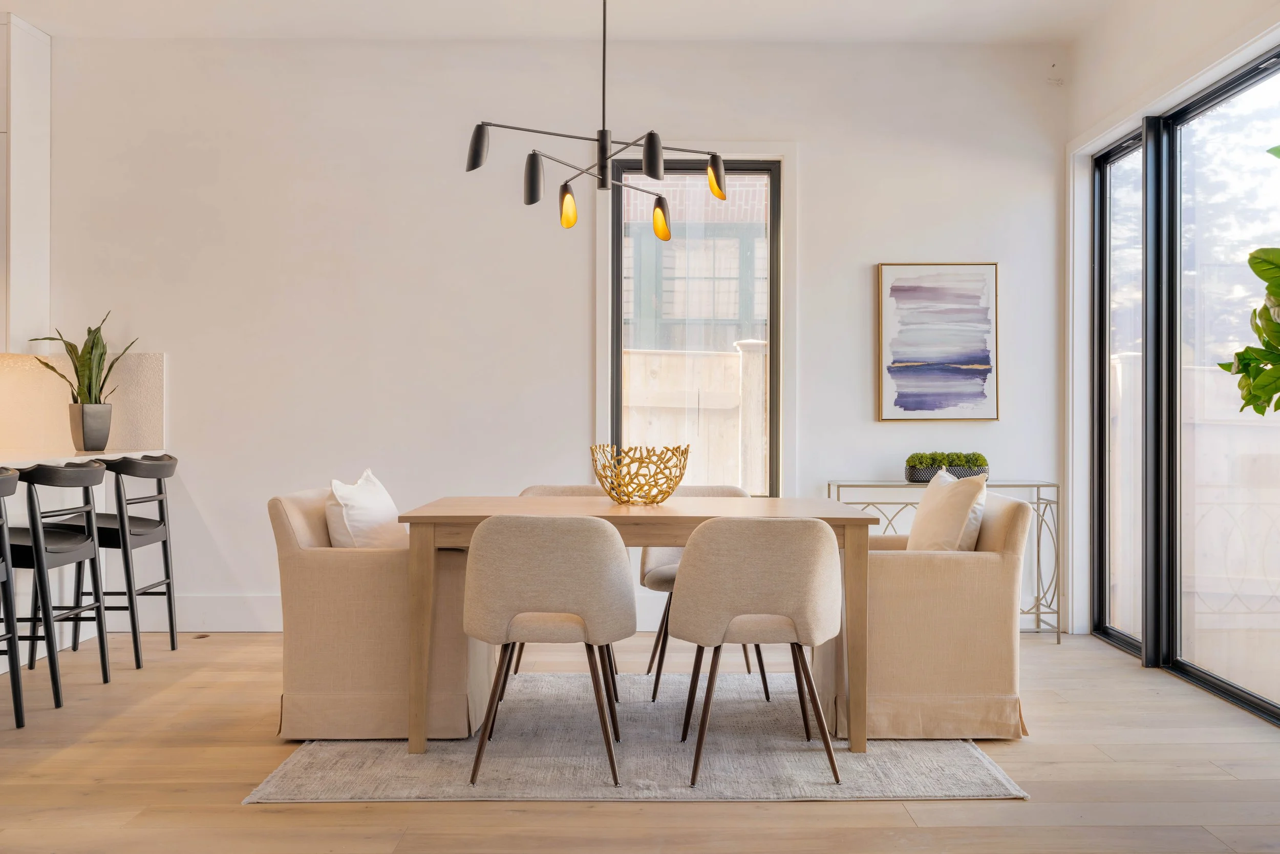 The dining area, illuminated by natural light from oversized windows and a black chandelier with gold finishes, is thoughtfully integrated into the open-concept layout, providing an effortless connection to the kitchen and living spaces.