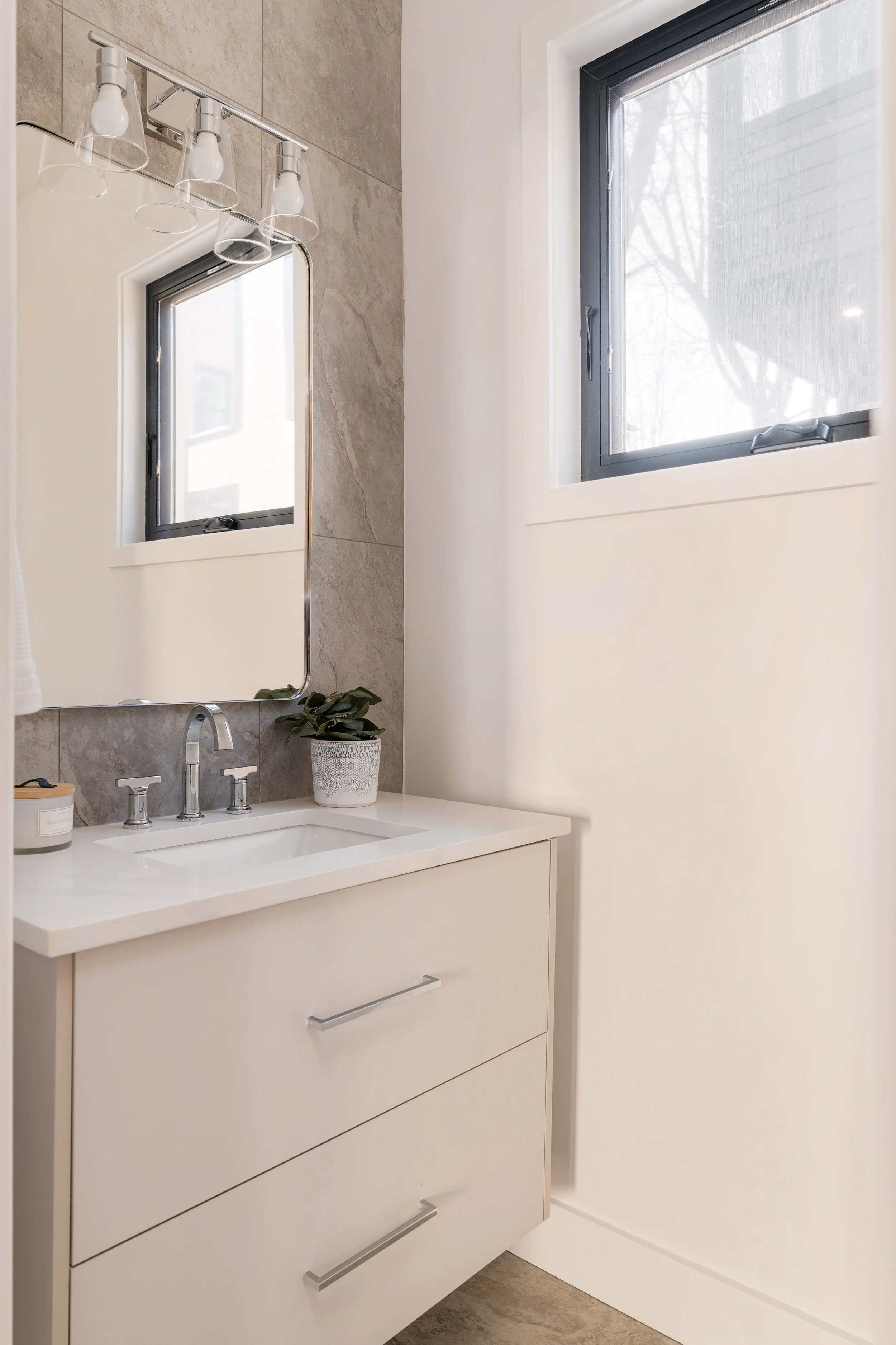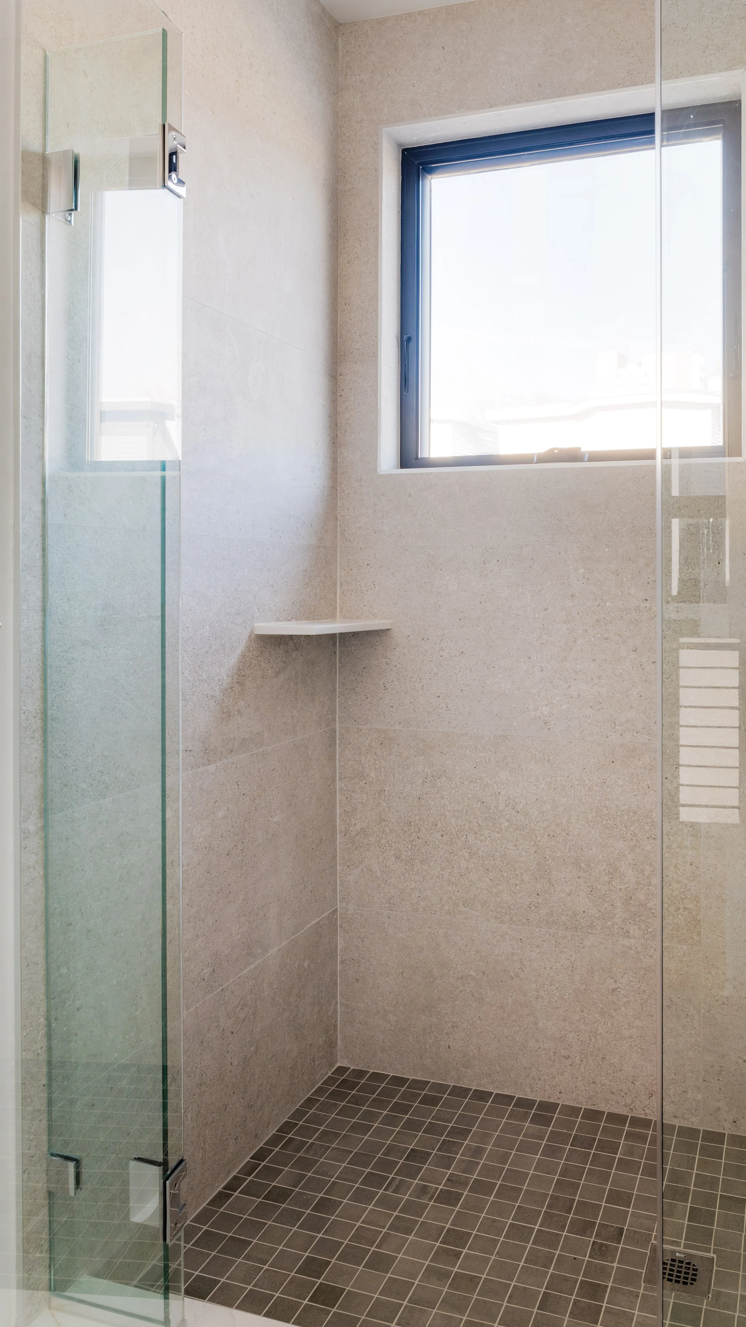 The full bathroom features an elegantly finished shower with a full-height tile surround, and a sleek vanity with quartz countertops and ample storage space.