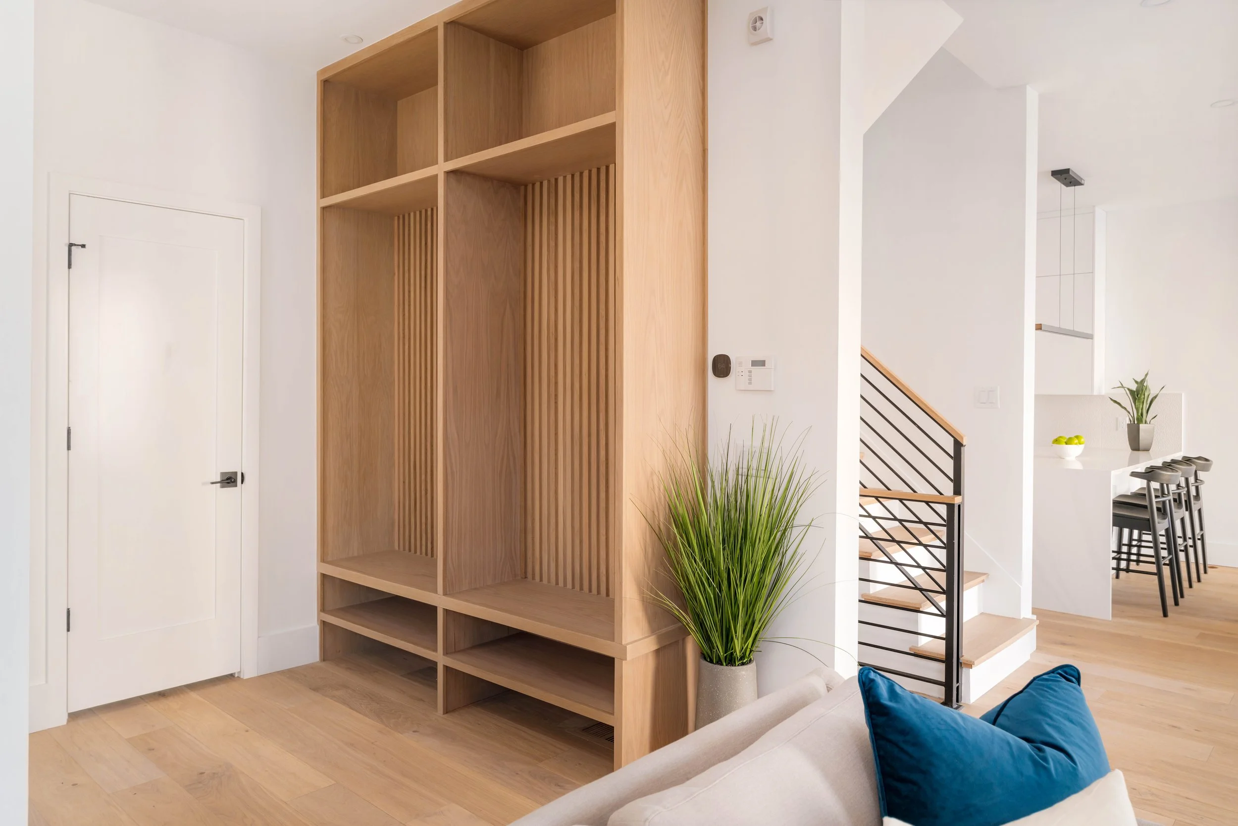 A mudroom with custom built-in storage is adjacent to a chic powder room, adding functional charm to round out this level.