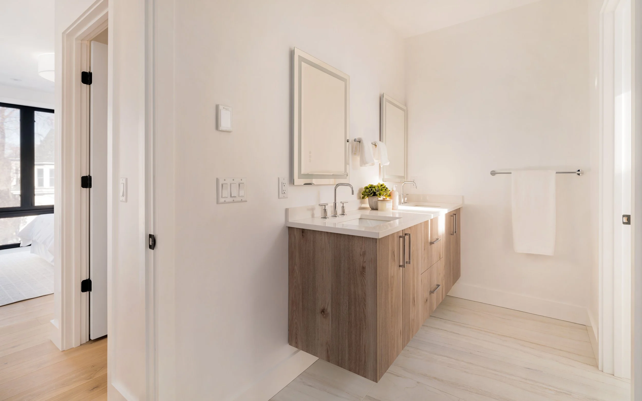 The primary suite is thoughtfully designed with comfort and functionality in mind. The bedroom features a custom walk-in closet with ample shelving and storage space. Off of that you will find the ensuite bathroom, which showcases radiant electric heated floors, a sleek double vanity backlit with LED lighting, and a frameless glass-enclosed shower equipped with both a handheld and a rain showerhead. Modern finishes and attention to detail elevate the space into a serene and relaxing escape.