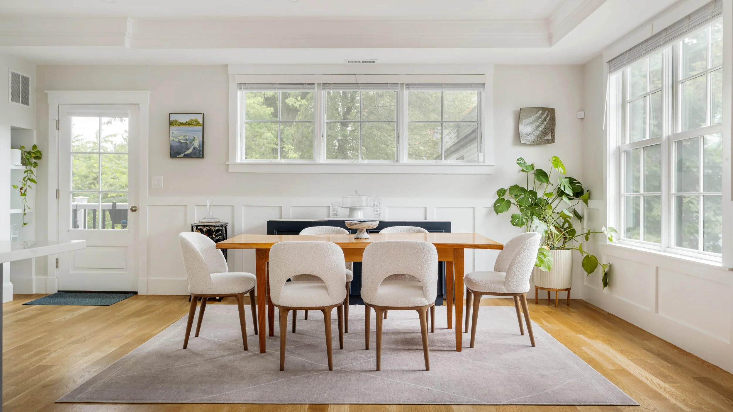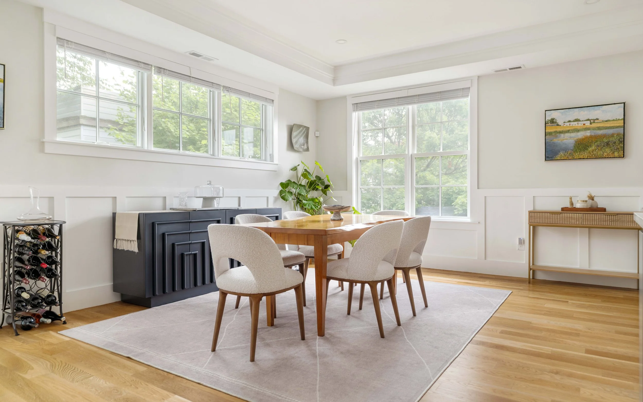 Adjacent to the kitchen is the spacious dining room complete with custom wall-paneling, large windows, a custom built-in, and direct access to the exclusive back deck.