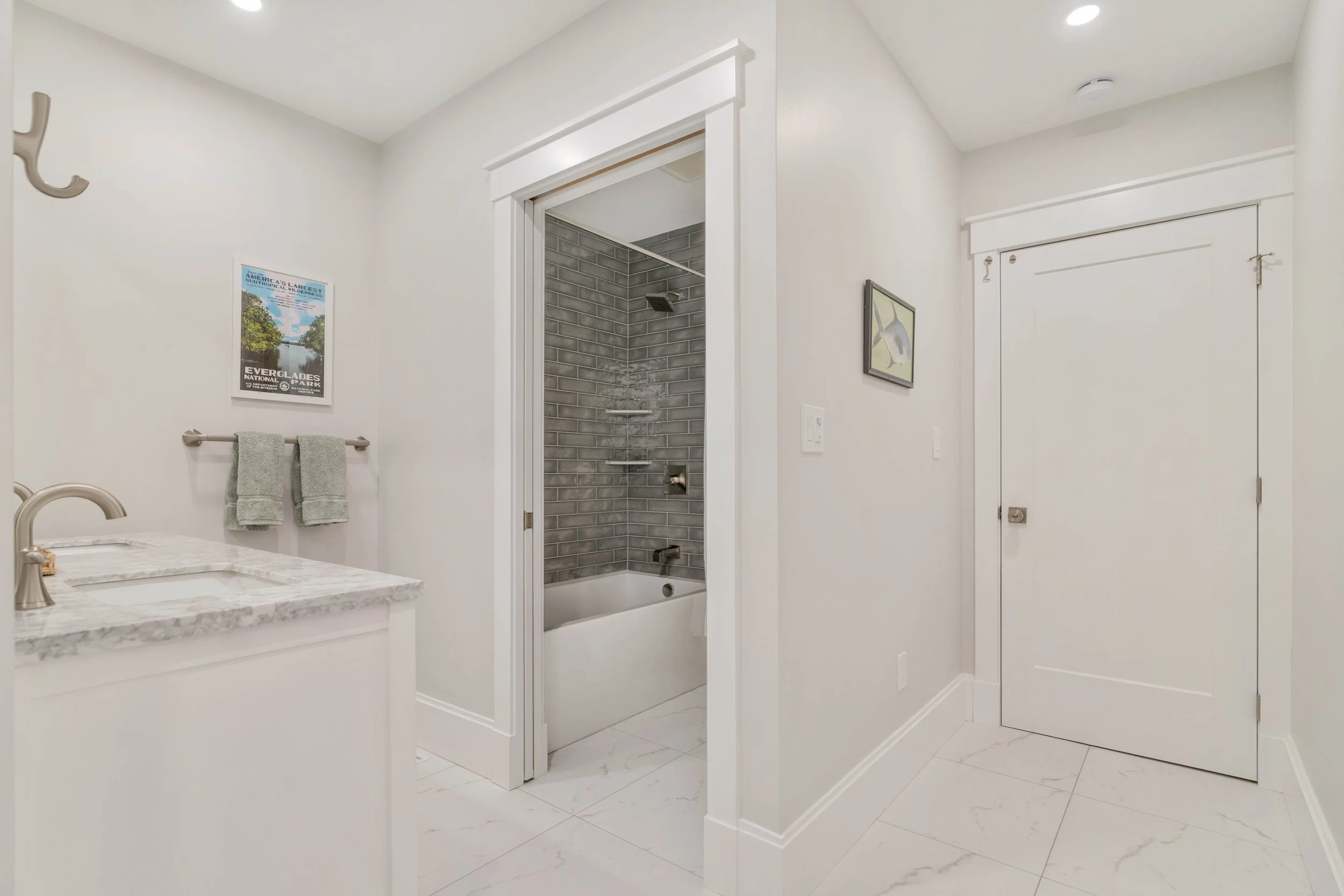 Two generous bedrooms, that face the front of the house, are equipped with spacious double-door closets with motion lights and are connected by a shared bathroom featuring a contemporary dual-vanity and a separate tub/shower and toilet closet accessed through a pocket door.