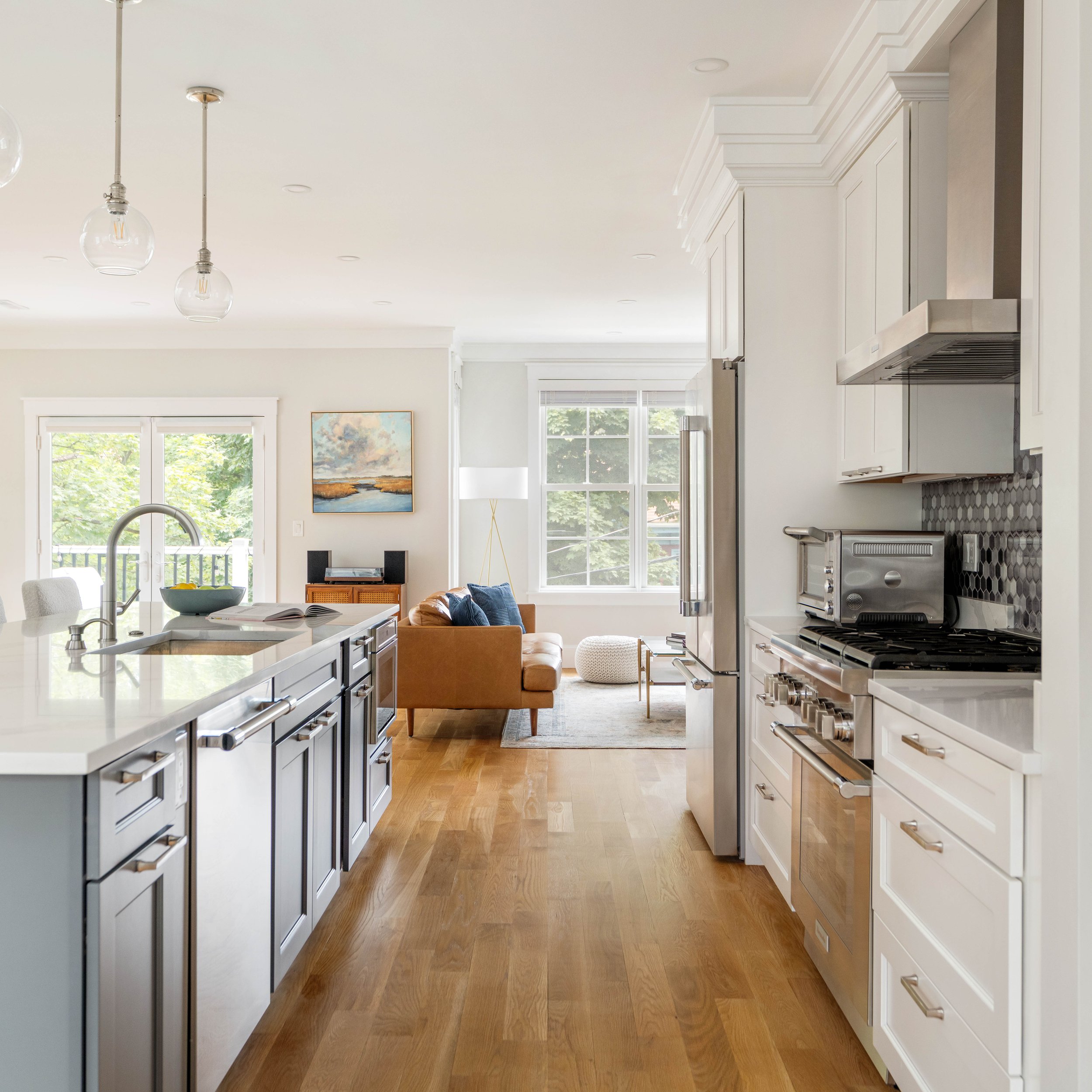 Enter the home through a private entrance and walk up a wide set of genuine white oak hardwood stairs to the main floor. You are immediately greeted by a stunning open-concept living, kitchen and dining space that features 8’11” ceilings, custom crown molding and millwork, recessed lighting, and plenty of natural light.