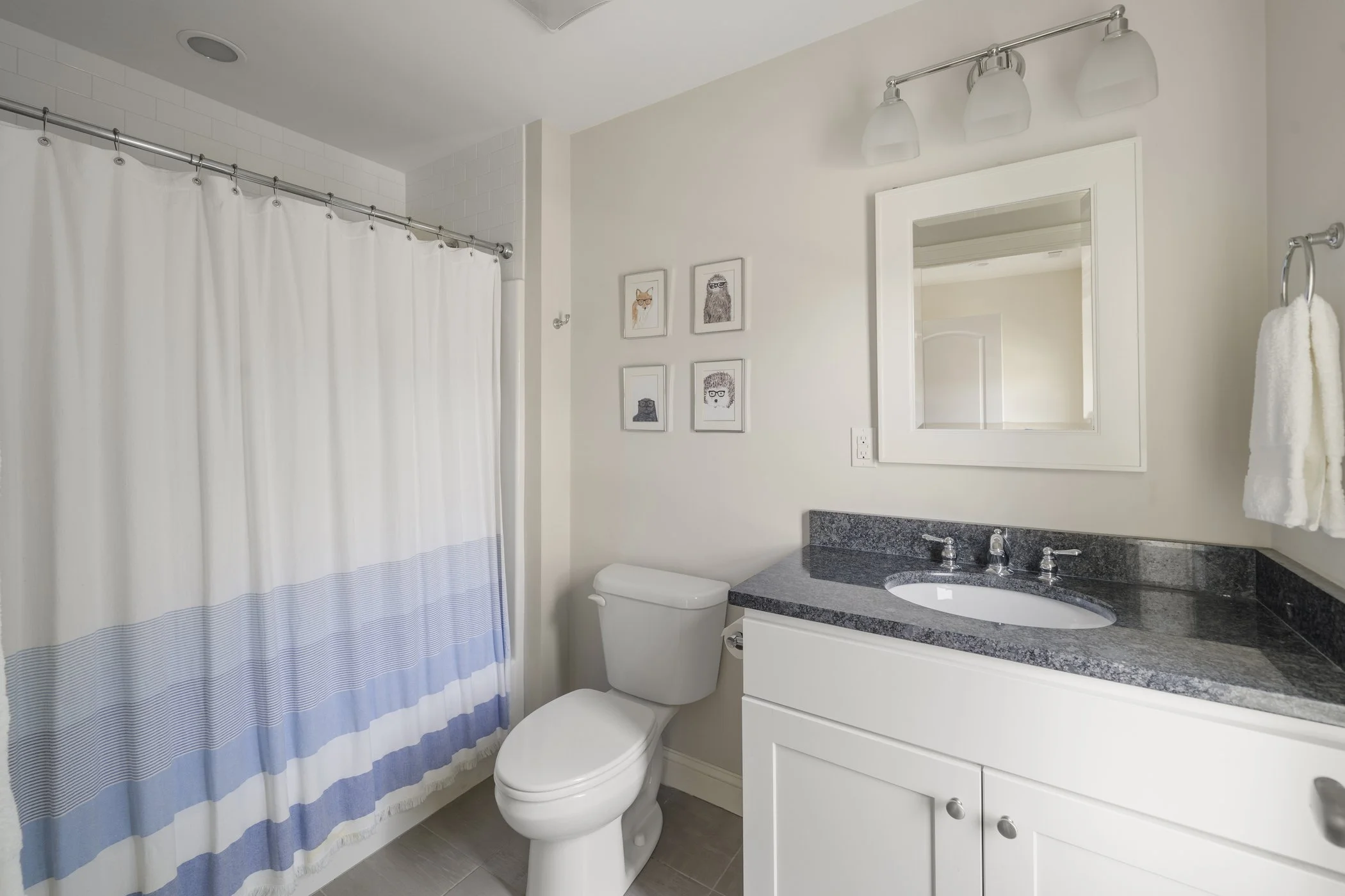 Rounding out the first floor is a conveniently located half bathroom, situated next to the laundry room, and features a white and grey tiled floor, along with a vanity offering black granite countertops and built-in storage.