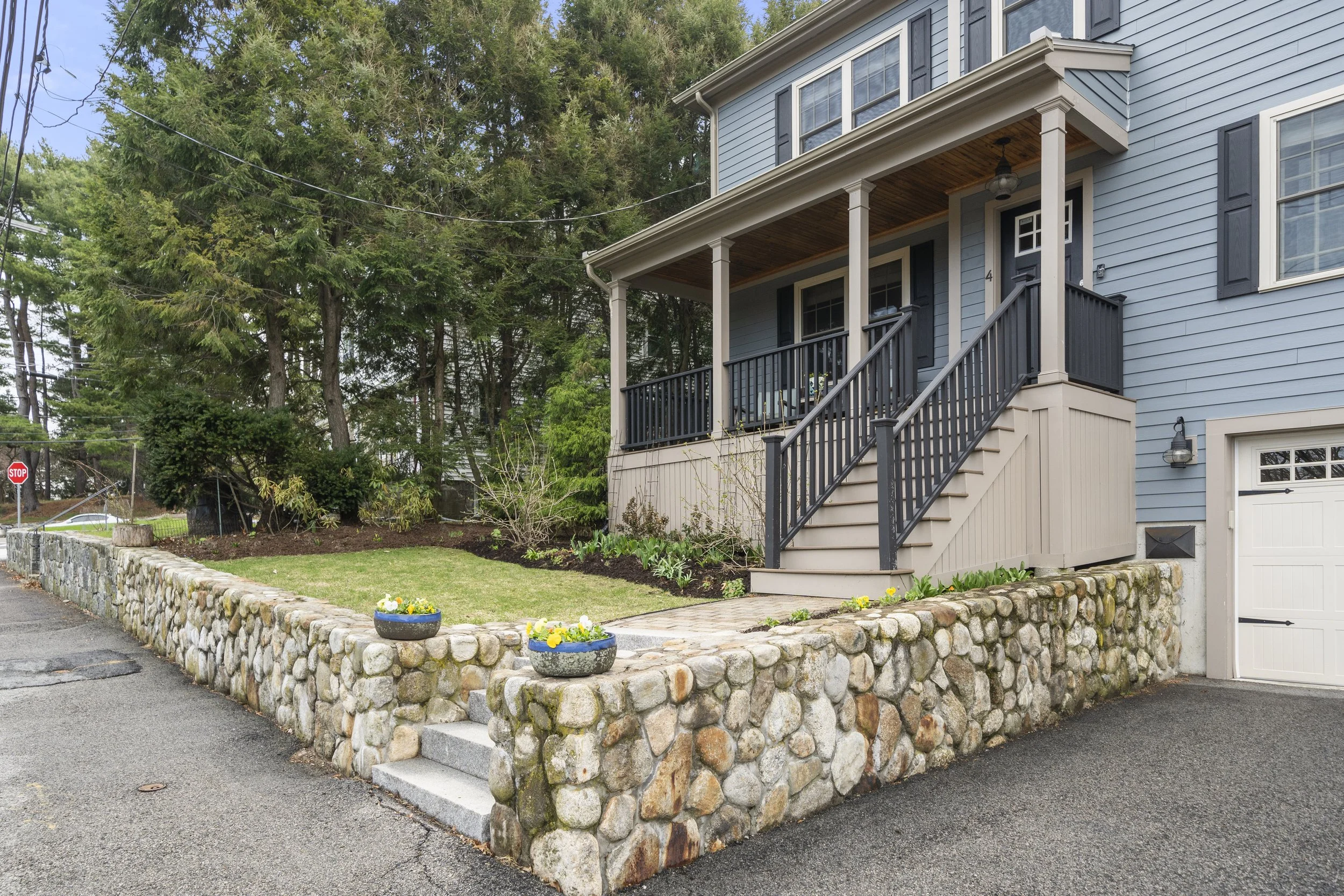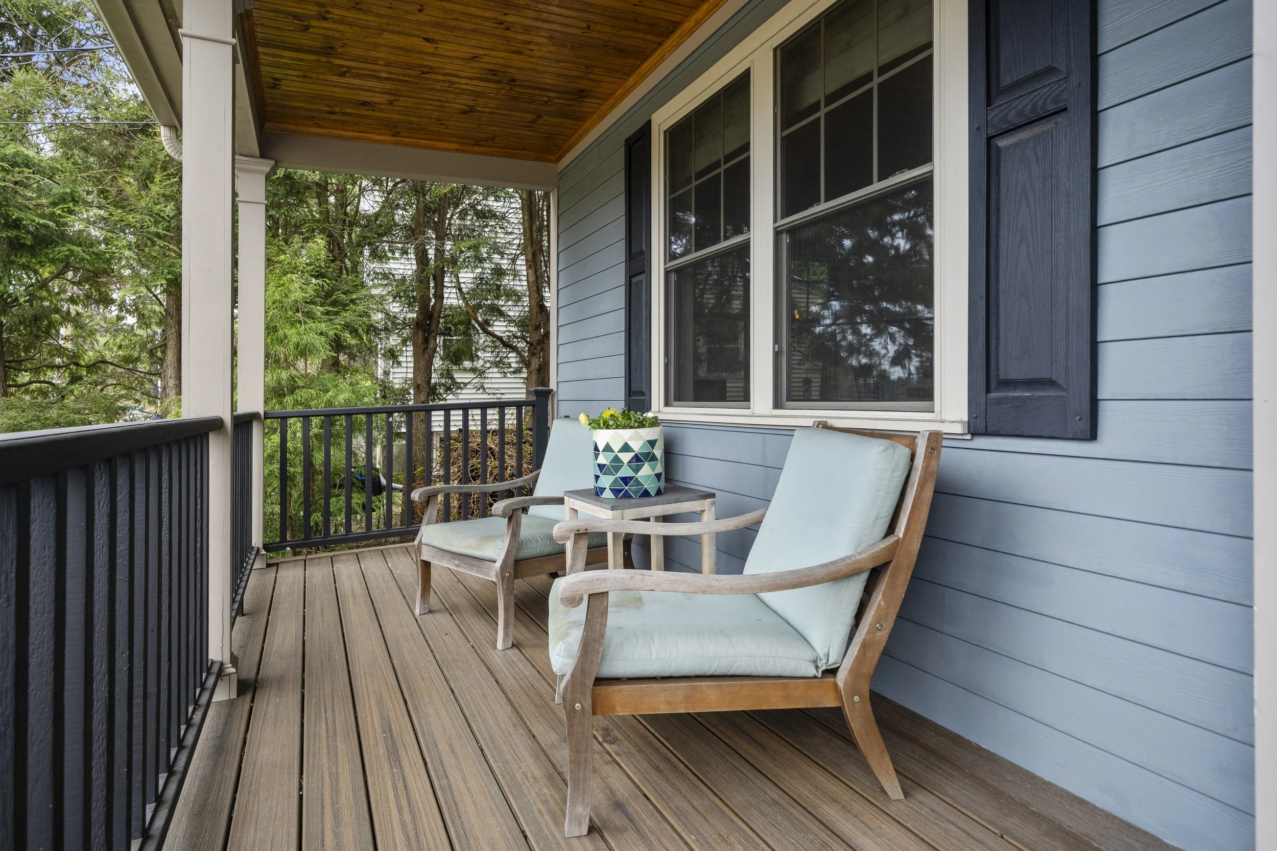 Front yard: A stone wall adds a welcoming touch to the front yard, creating a defined perimeter around the yard and front steps. The Trex deck outside the front door can easily accommodate two Adirondack chairs and a table.