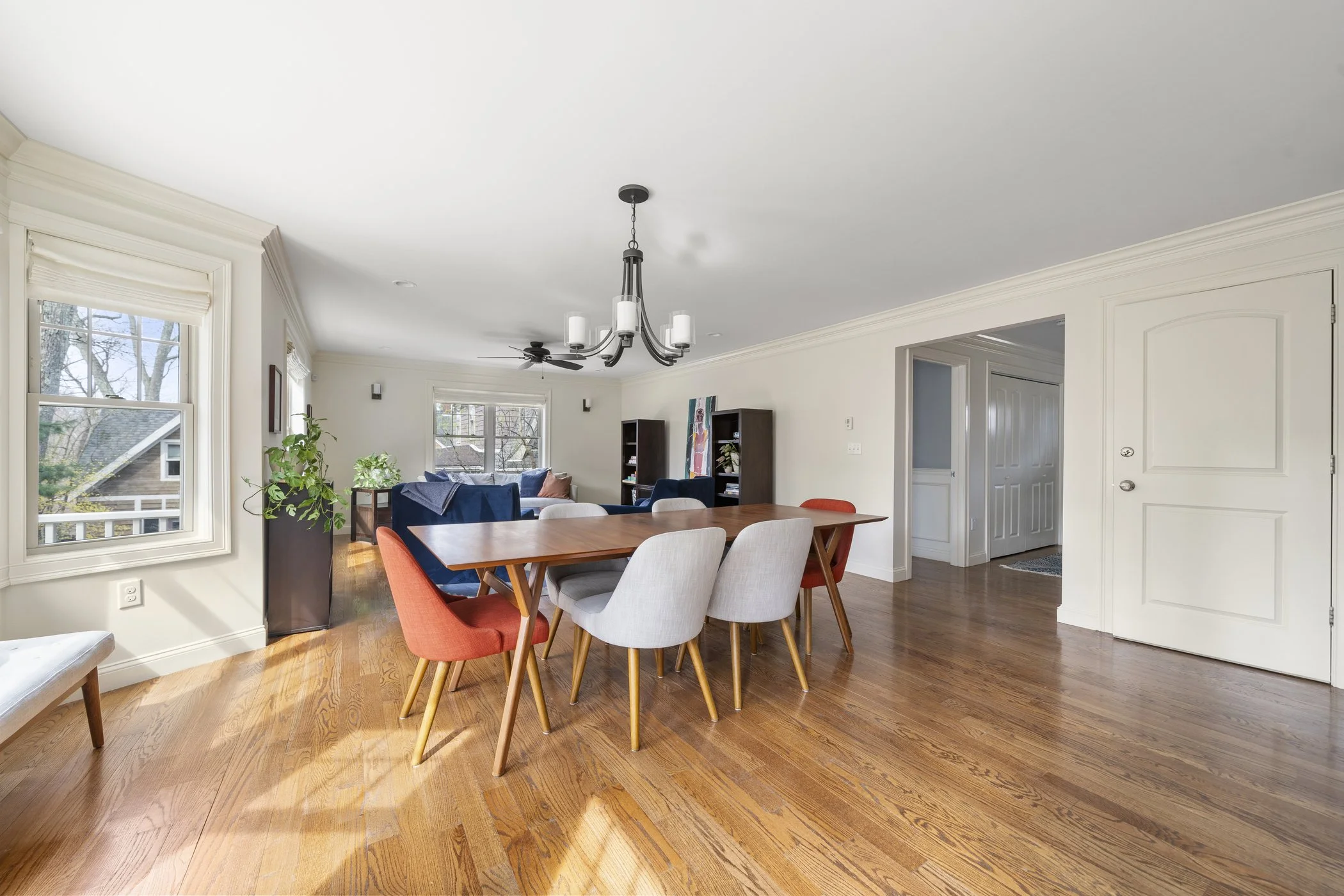 The formal dining room features a candle-style chandelier and ample space for a table that comfortably seats ten. Perfect for entertaining, it's conveniently situated between the family room, kitchen, and half bath, and opens seamlessly onto the deck and backyard.