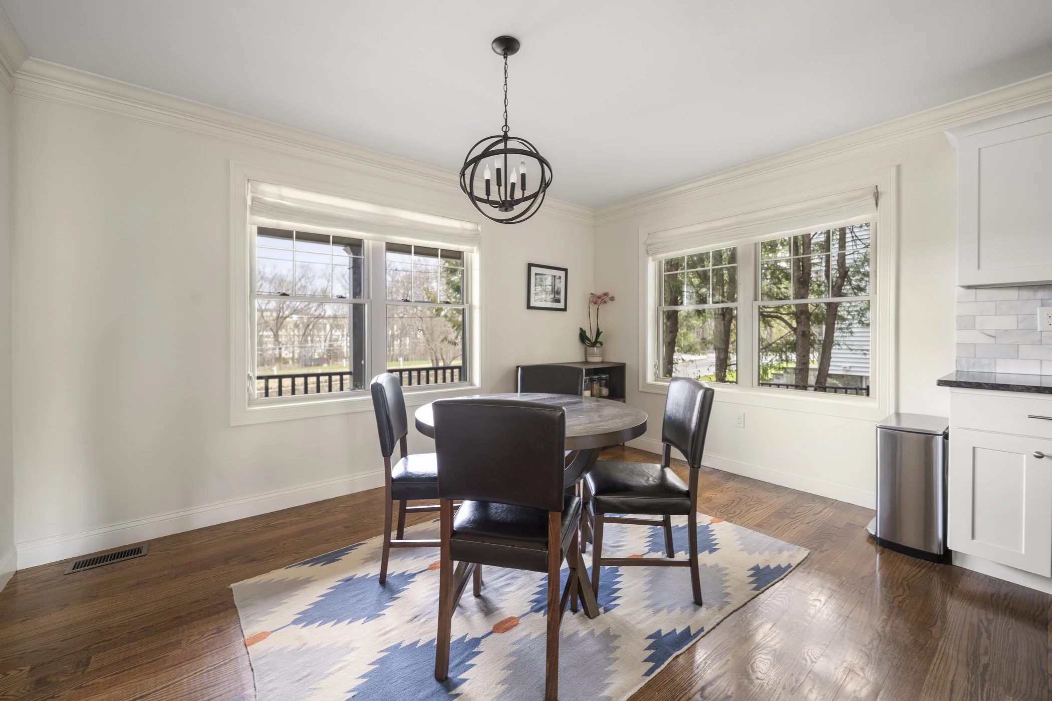 The well-equipped classic kitchen features striking black granite countertops, crisp white wooden cabinets, and newer stainless steel appliances—including a refrigerator, gas range, stove, dishwasher, microwave, sink with garbage disposal, and a beverage fridge. A multicolored, grey and white Carrera marble tile backsplash adds warmth. For seating, the kitchen offers a spacious island with room for three chairs, as well as a cozy breakfast nook that comfortably fits a table for four. The space is beautifully lit by several black-finished pendant lights over the island and sink, recessed lighting, as well as a charming candlestick-style chandelier in the nook.