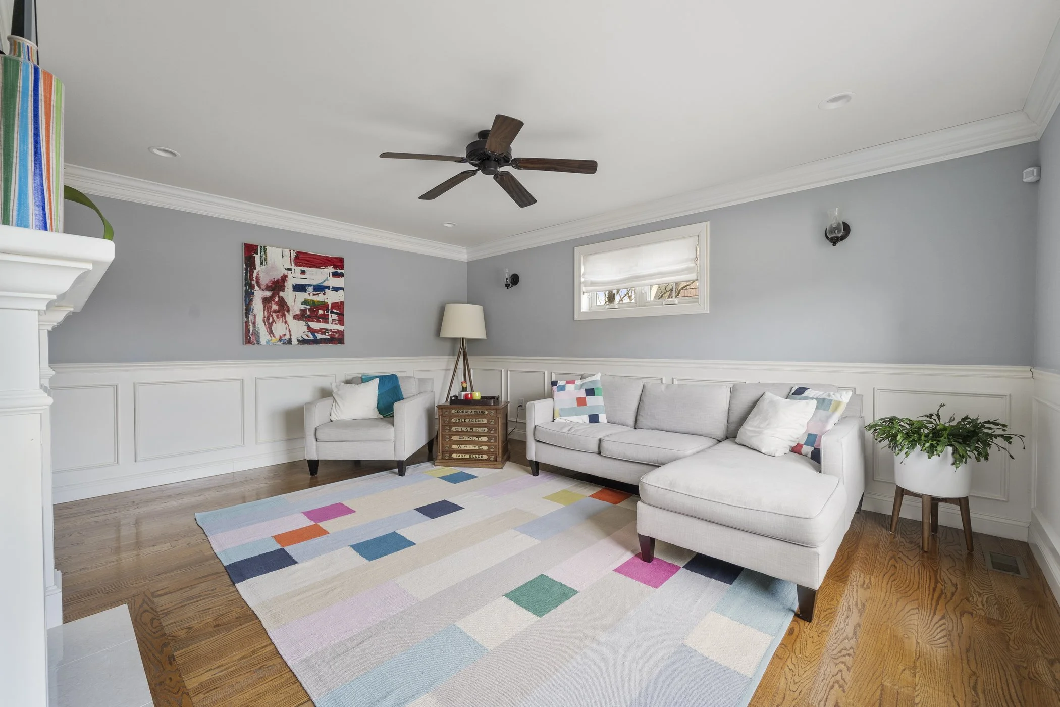 The spacious family room sits just off the dining area and is filled with natural light from four windows, each outfitted with white Roman shades. Candle-style sconces—matching the dining room chandelier—add a visually-pleasing touch, while a wooden ceiling fan offers both comfort and function.