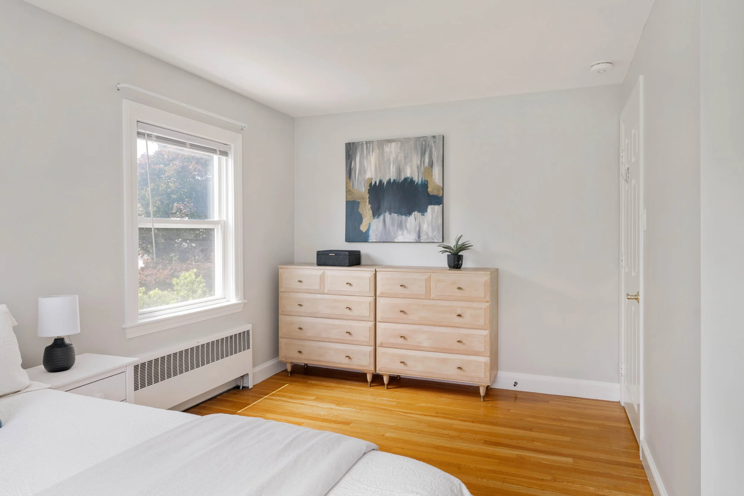 The gracious and private primary bedroom sits in the rear corner of the home, with room to spare for a sitting area or additional furnishings. Two windows allow for beautiful natural light. A spacious closet finishes off this space.
