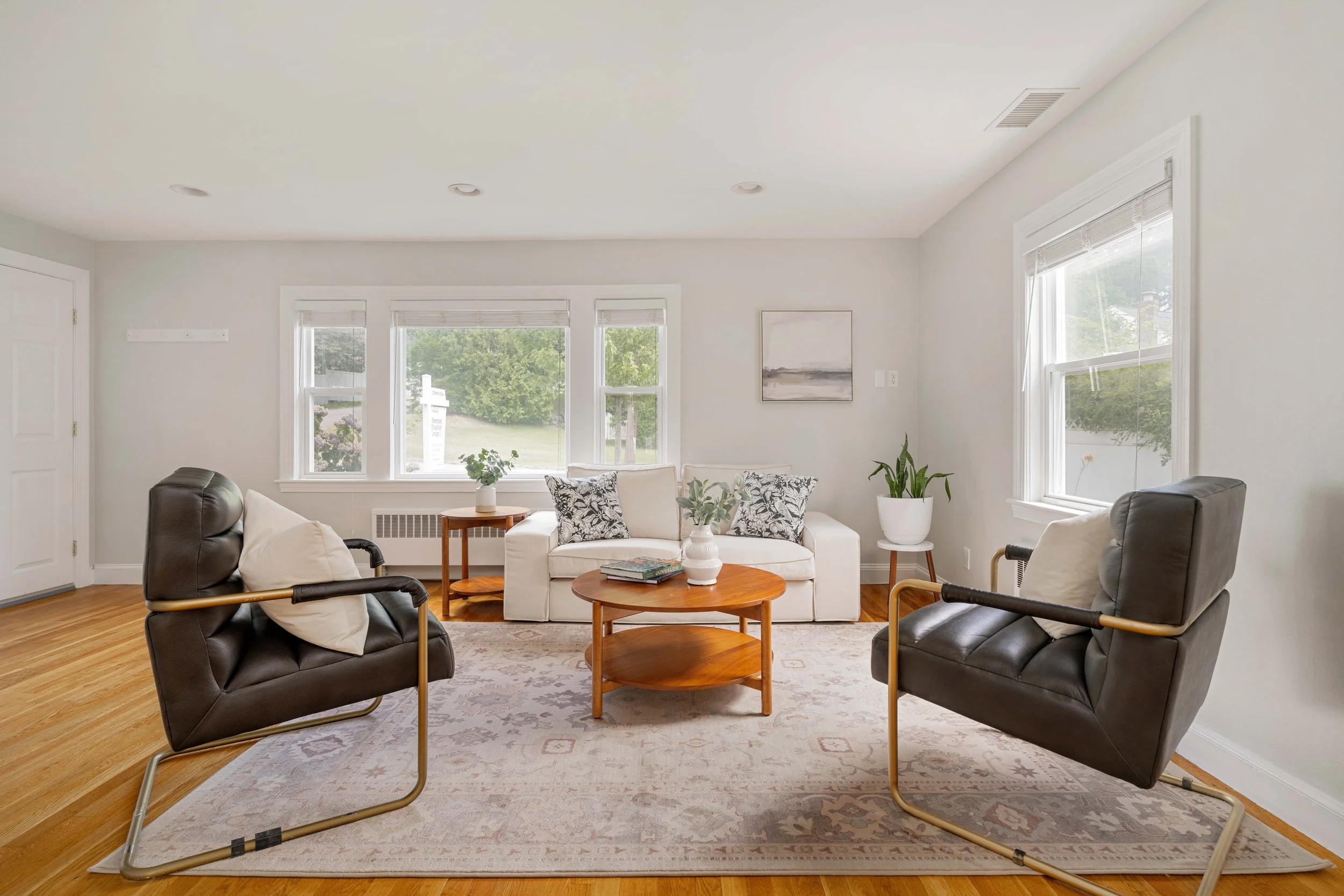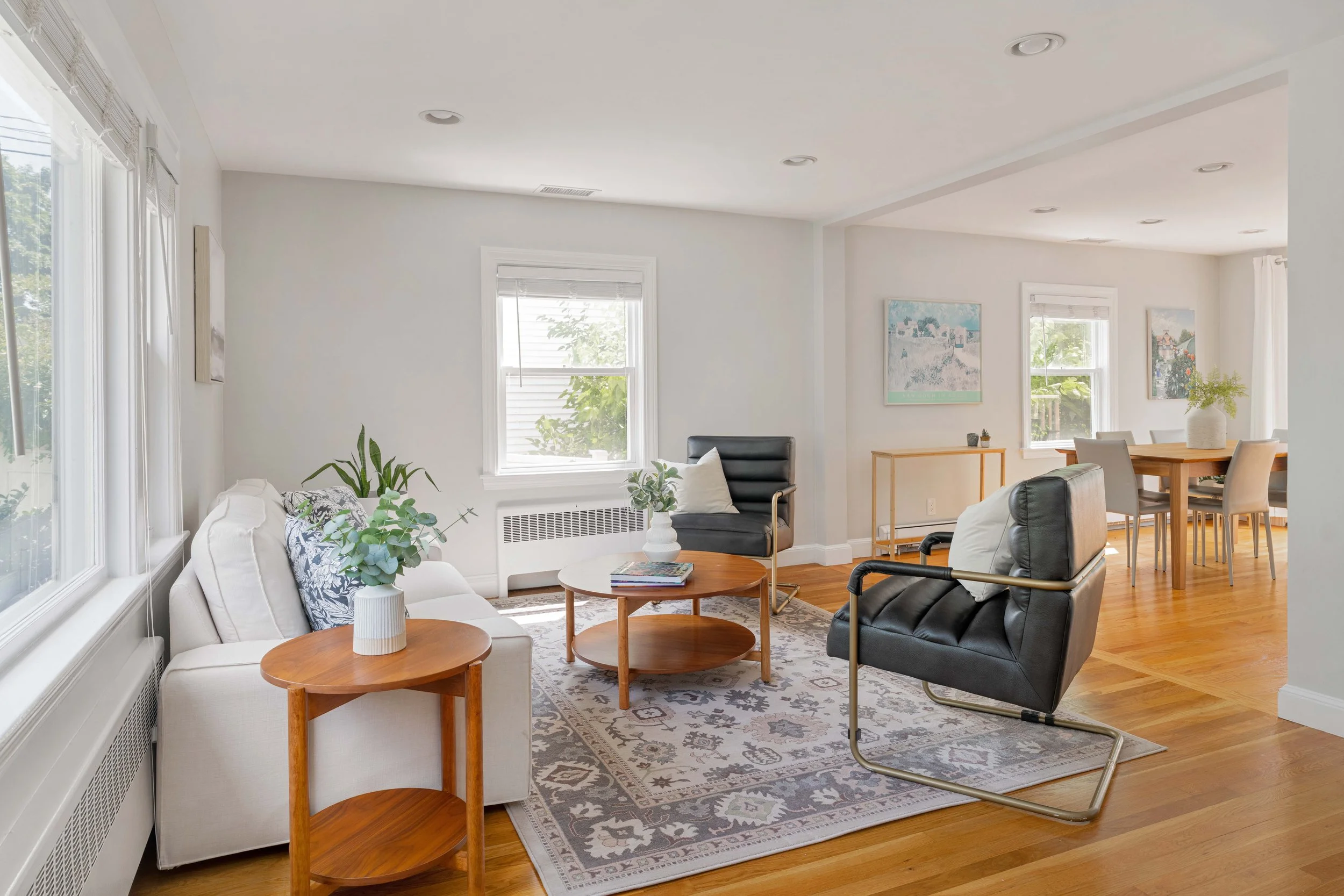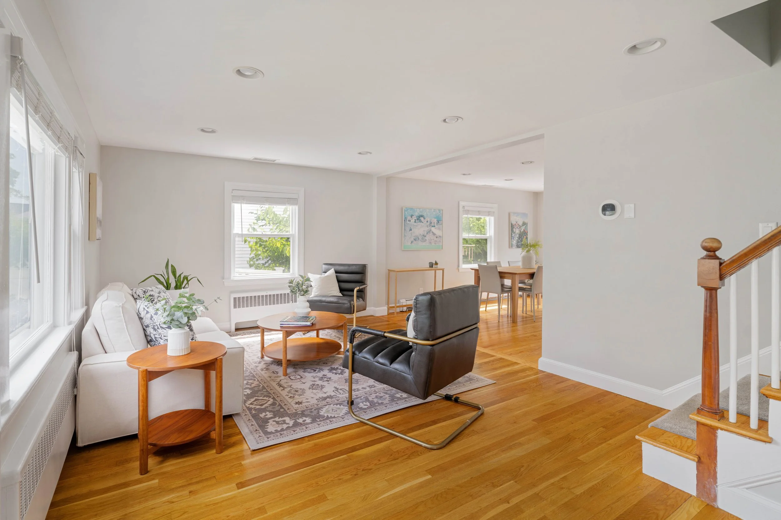The spacious living room boasts 4 large windows and ample space for bookcases, consoles, and entertaining.