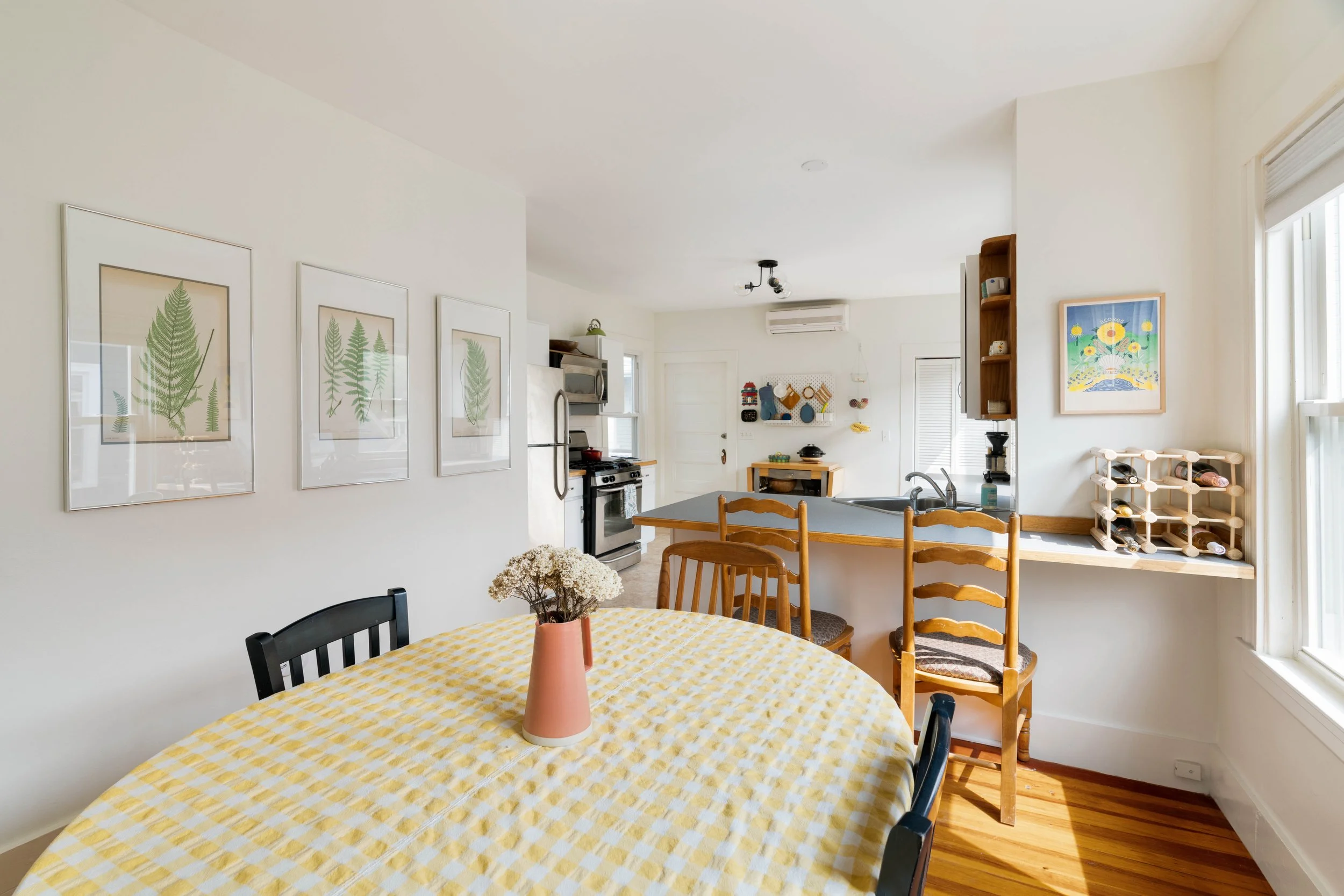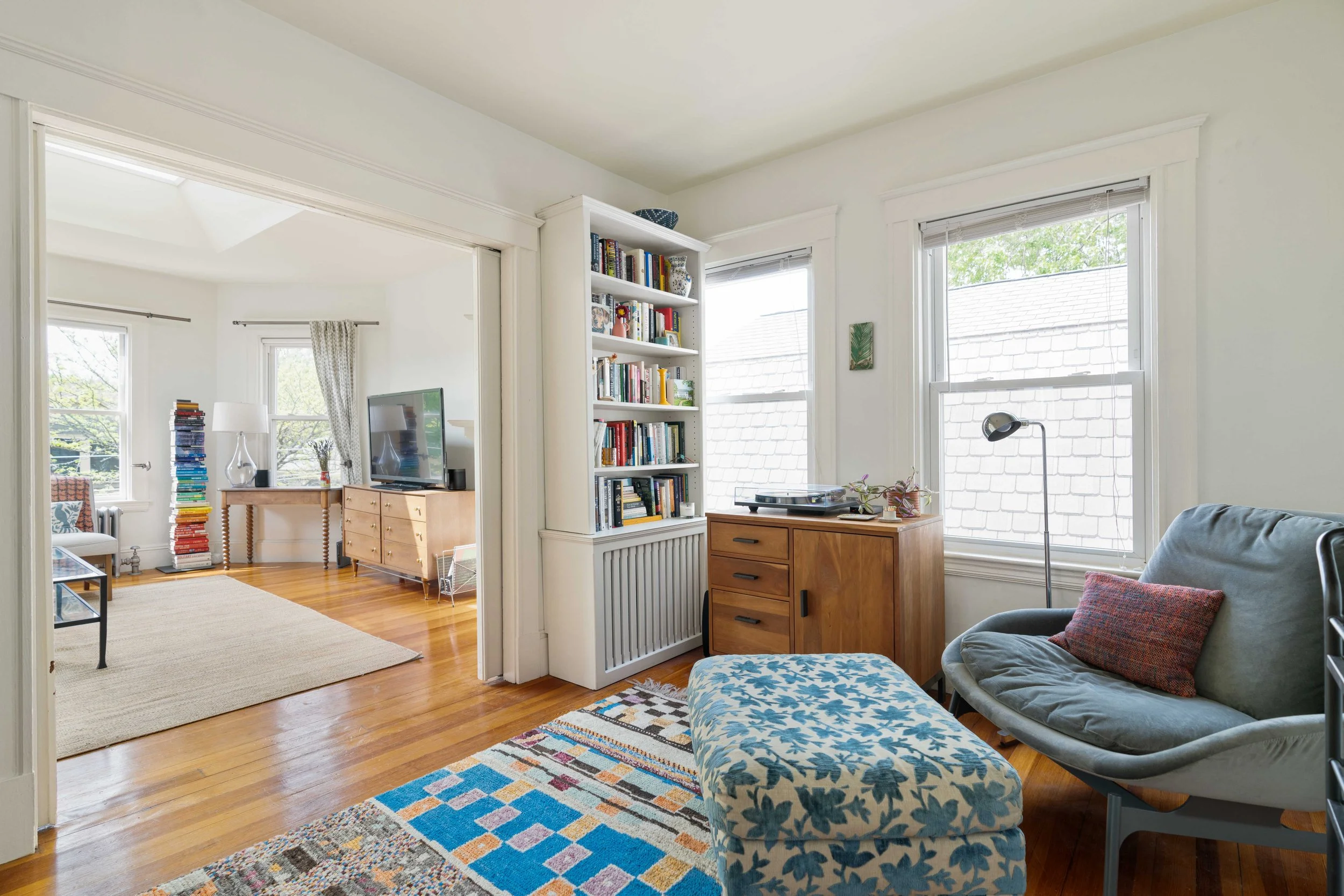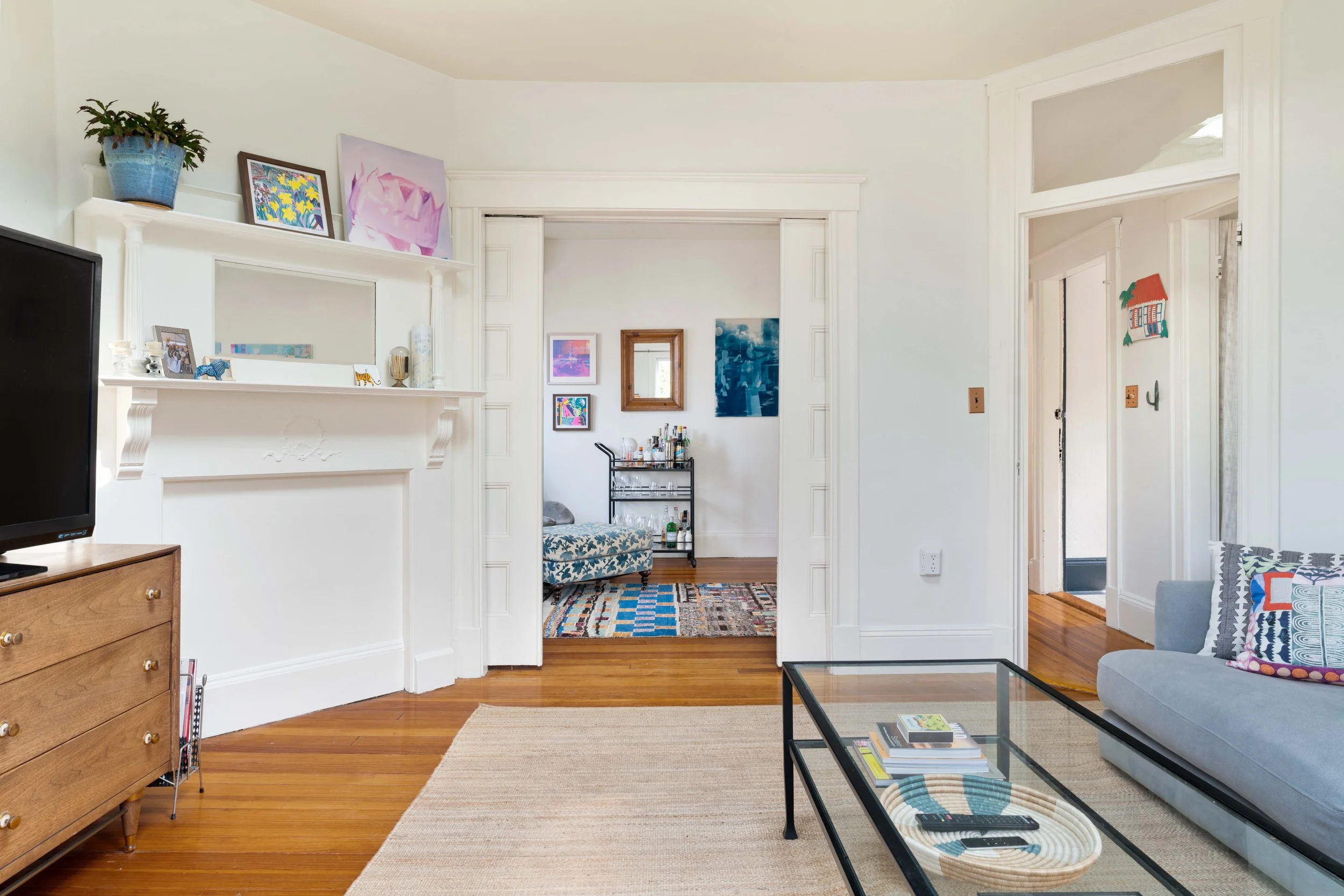 Connected to the living room by functioning pocket doors is a flexible room perfect as an extension of the living room, a bedroom, a formal dining room, or office. It is equipped with 2 windows, a mini split, built-in shelving and a closet.