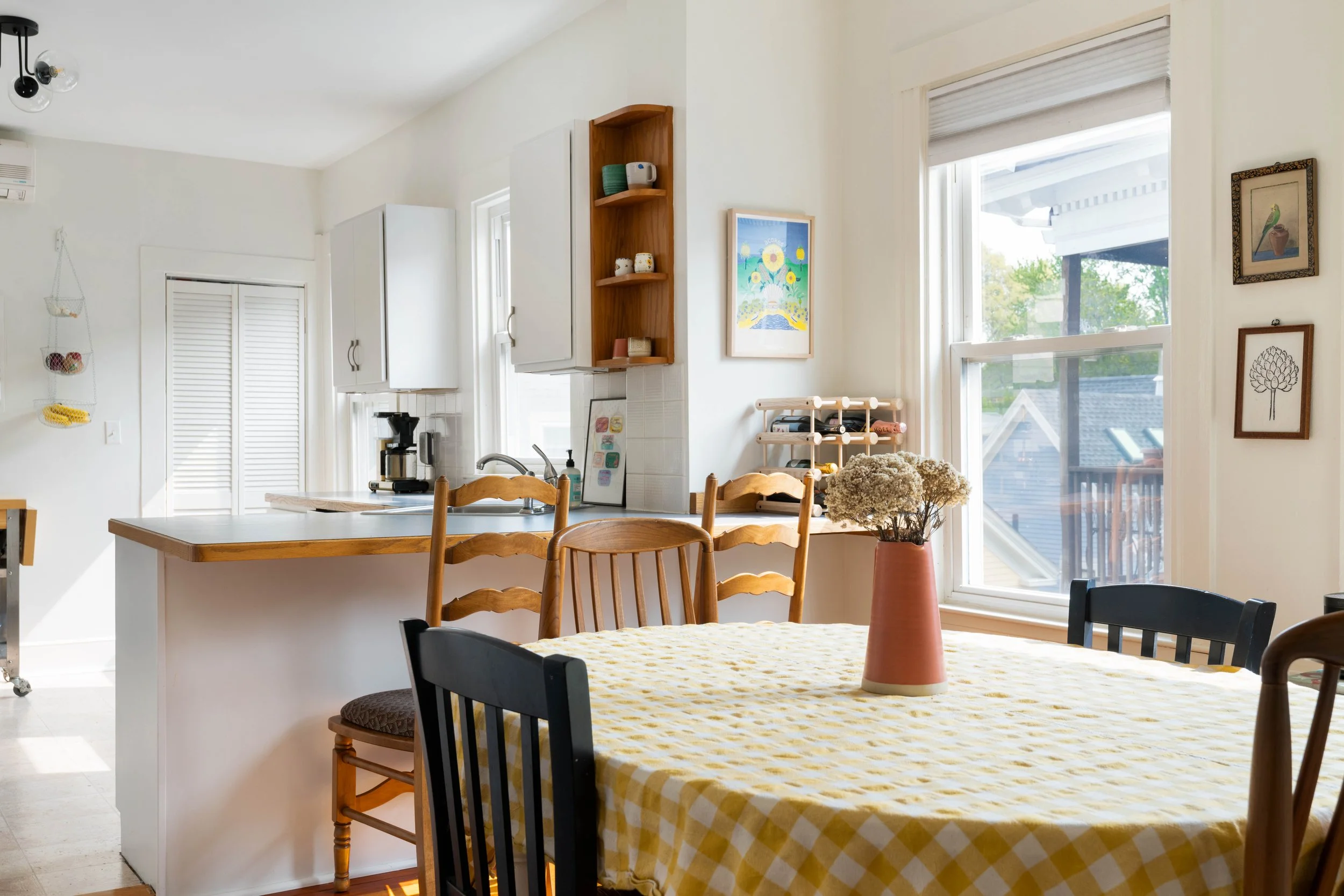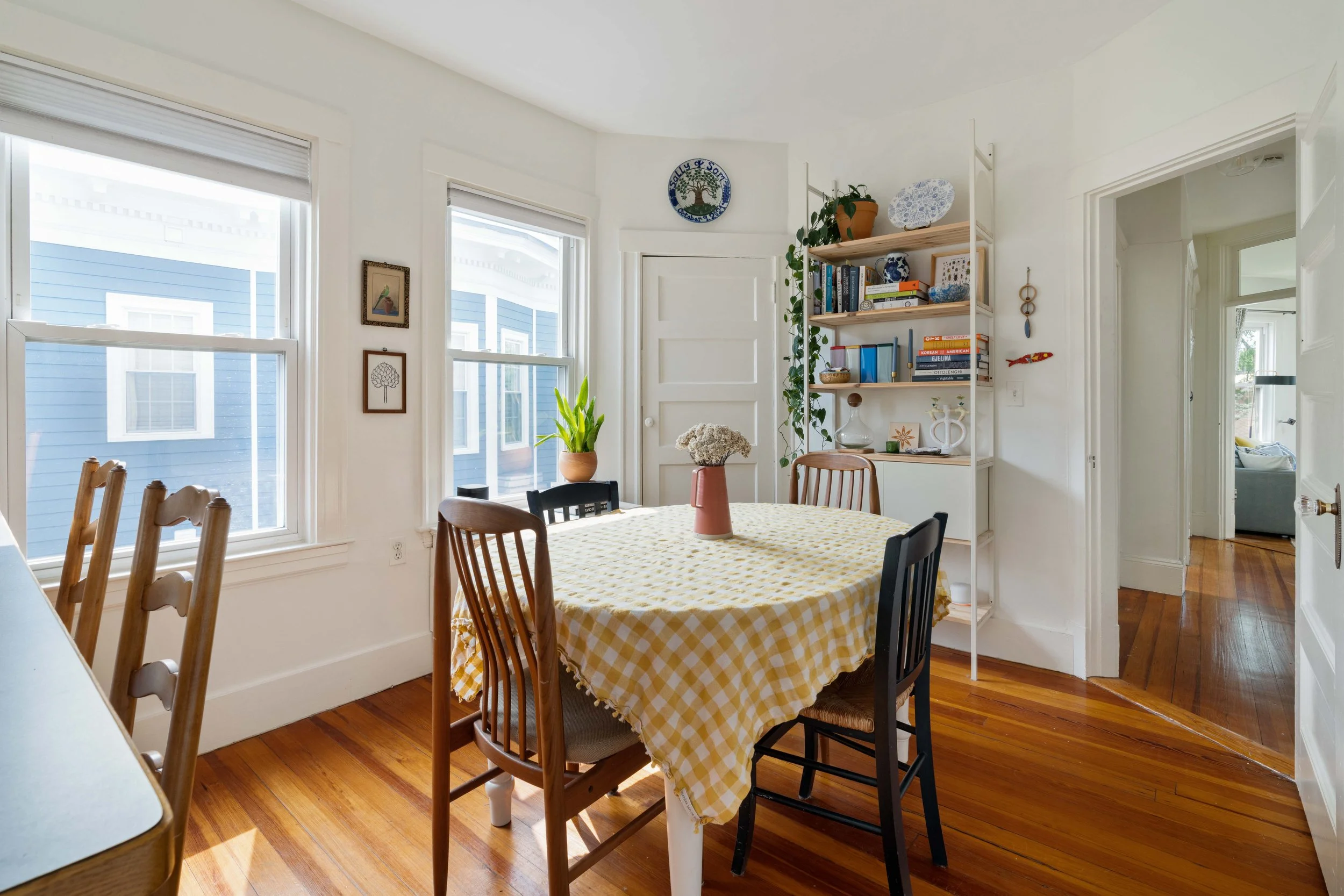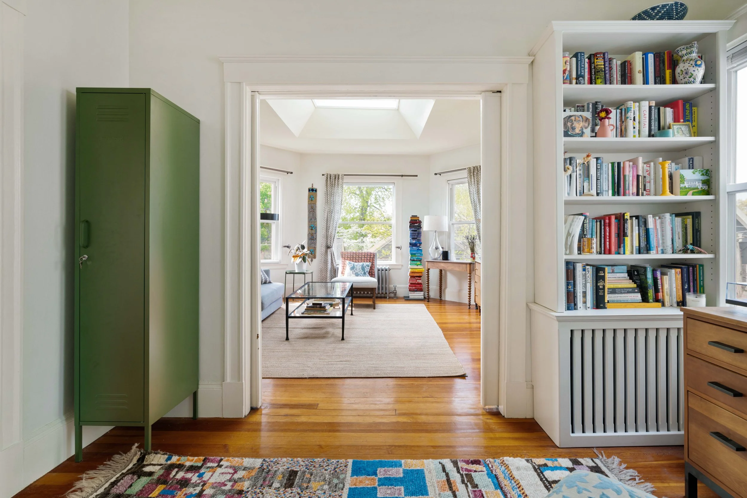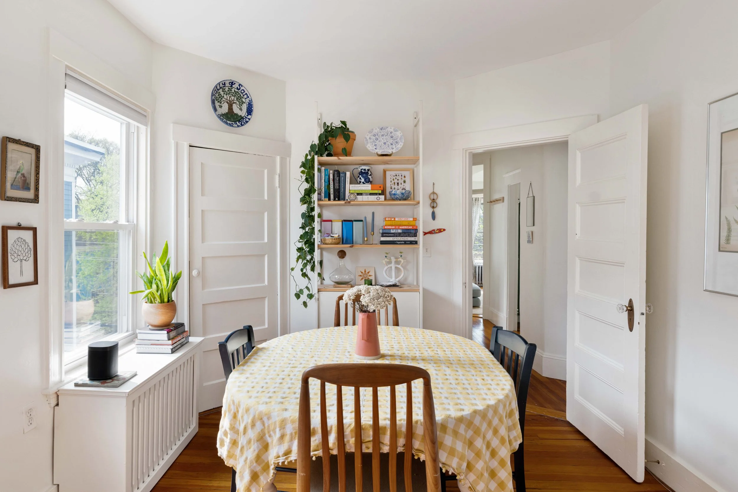 Connected to the living room by functioning pocket doors is a flexible room perfect as an extension of the living room, a bedroom, a formal dining room, or office. It is equipped with 2 windows, a mini split, built-in shelving and a closet.
