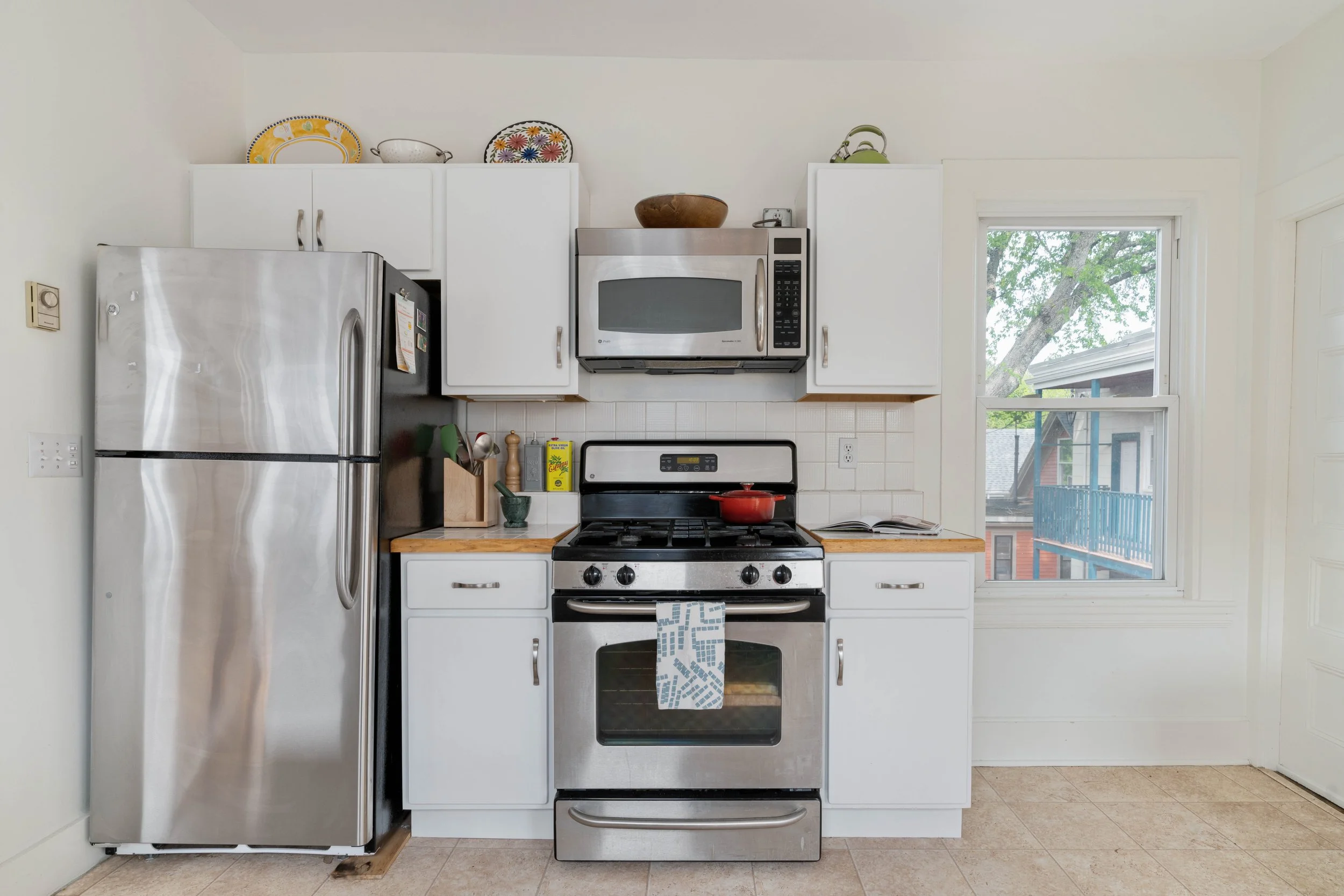 The kitchen has GE stainless steel appliances including: dishwasher, 4-burner gas stove, microwave and refrigerator. White refaced cabinets, plentiful counter space, a mini-split and in-unit laundry completed this space.