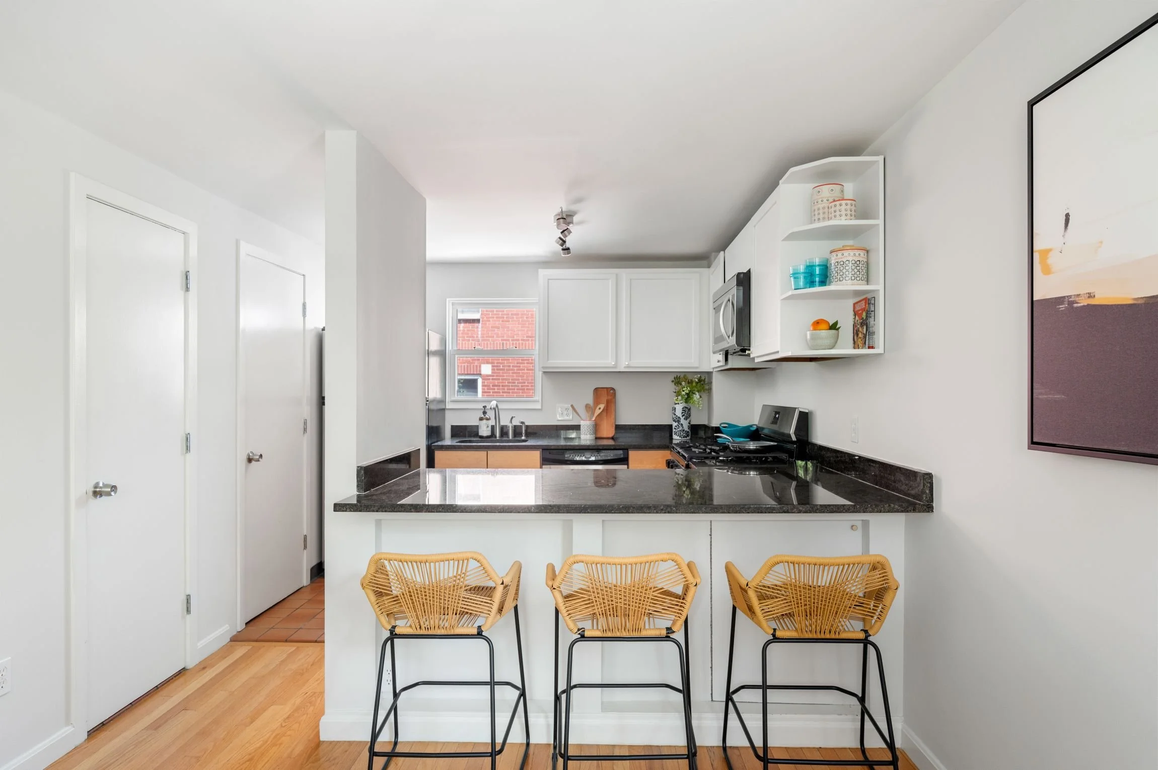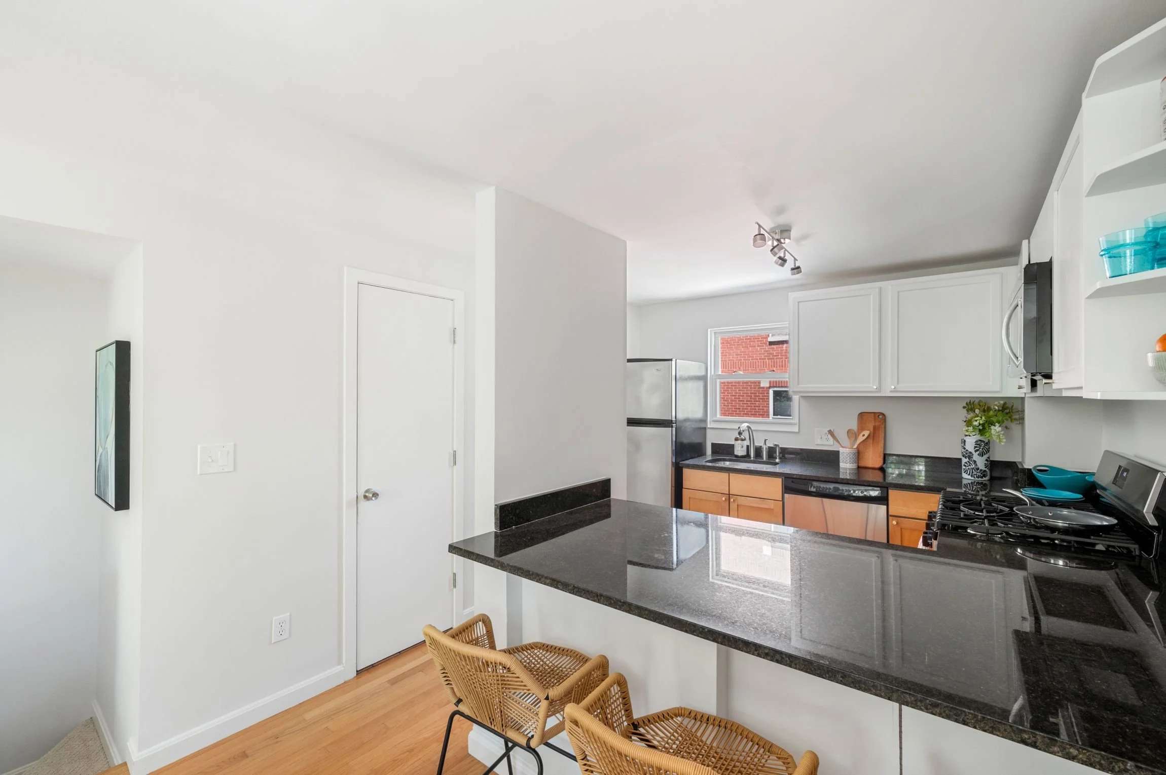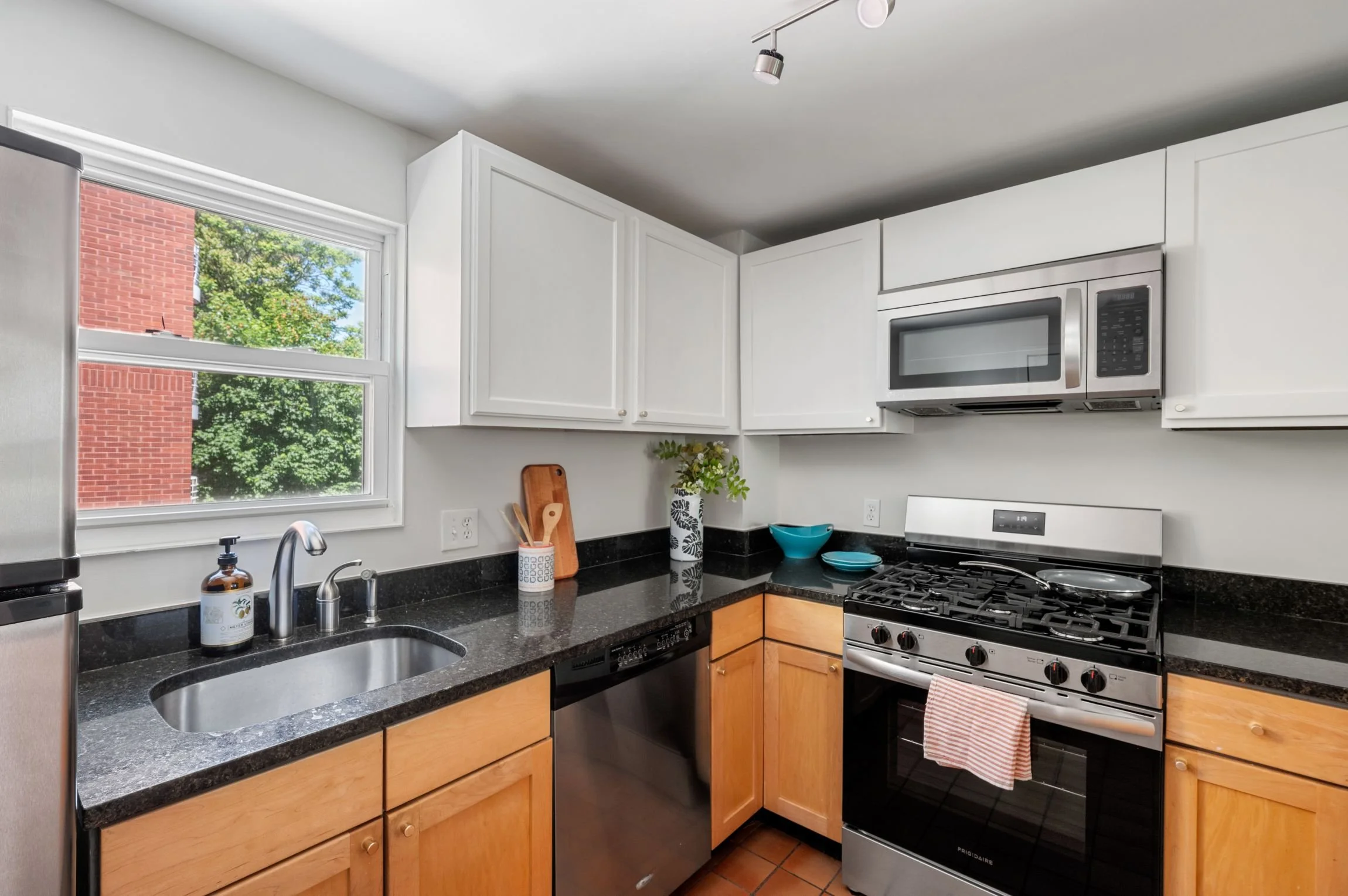 Walking up to the second floor, cooks and hosts will delight in this compact yet very functional kitchen, featuring granite countertops, maple and painted wood cabinets, tiled flooring and a breakfast bar that can comfortably sit three. Stainless steel appliances include a Whirlpool refrigerator and dishwasher, a Frigidaire gas range, and an LG microwave with a recirculating vent. The window-facing stainless-steel sink has a hand sprayer and a garbage disposal.