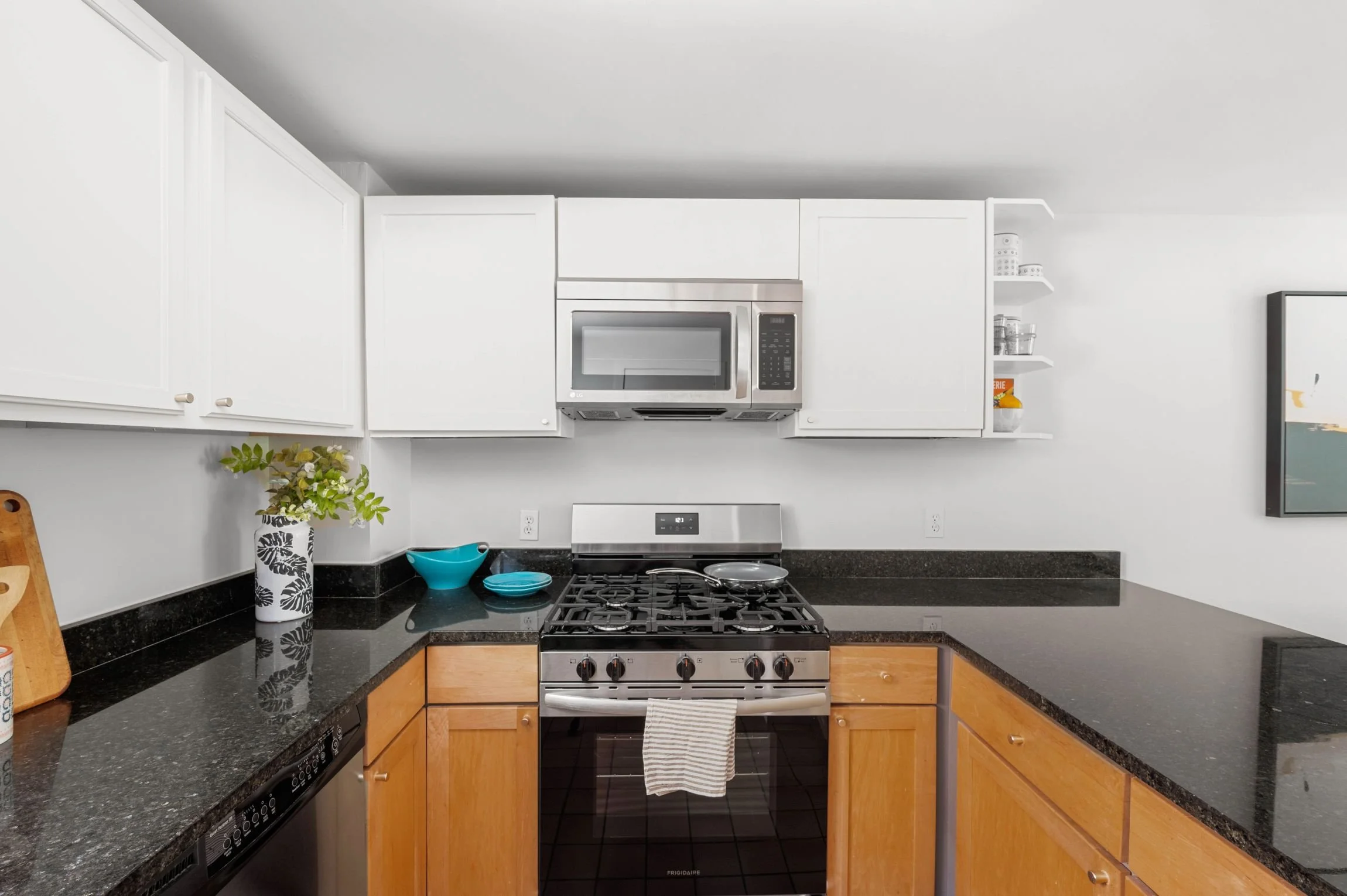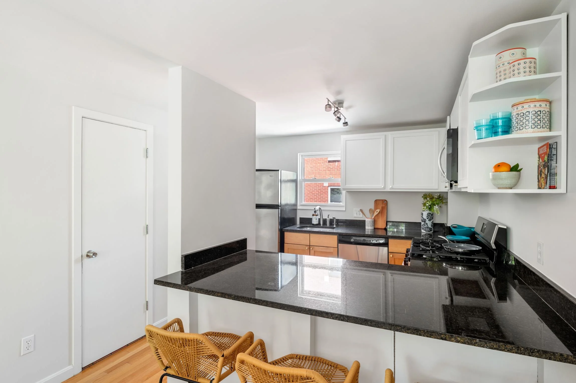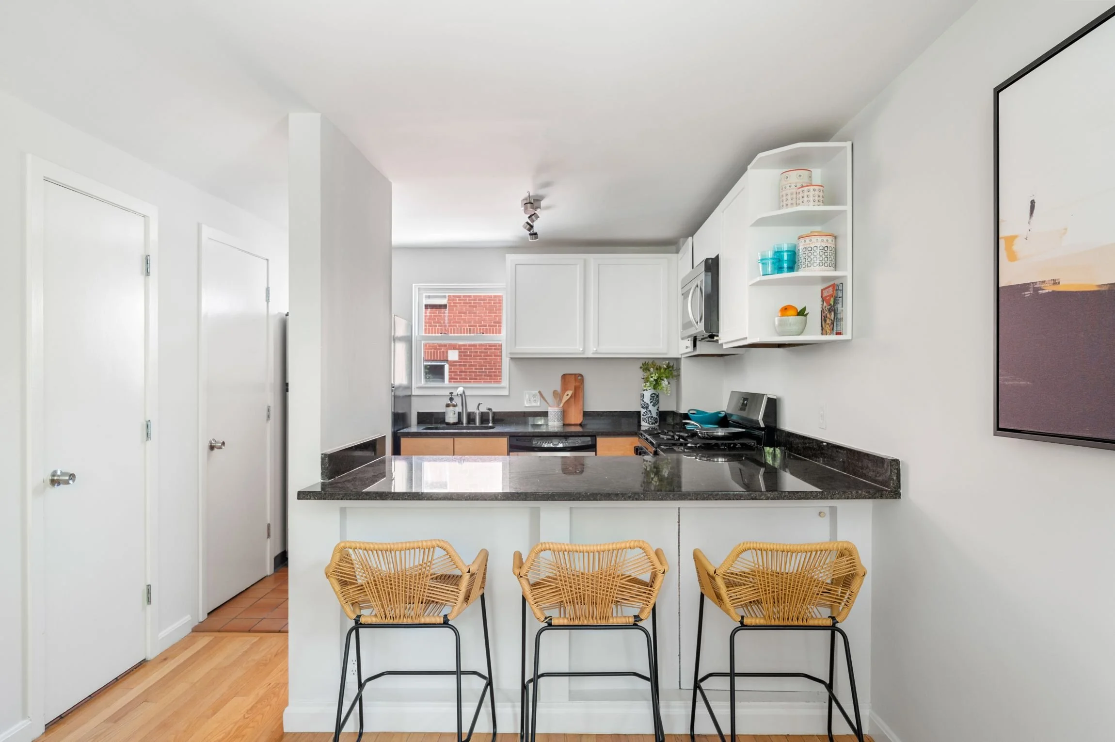 Walking up to the second floor, cooks and hosts will delight in this compact yet very functional kitchen, featuring granite countertops, maple and painted wood cabinets, tiled flooring and a breakfast bar that can comfortably sit three. Stainless steel appliances include a Whirlpool refrigerator and dishwasher, a Frigidaire gas range, and an LG microwave with a recirculating vent. The window-facing stainless-steel sink has a hand sprayer and a garbage disposal.