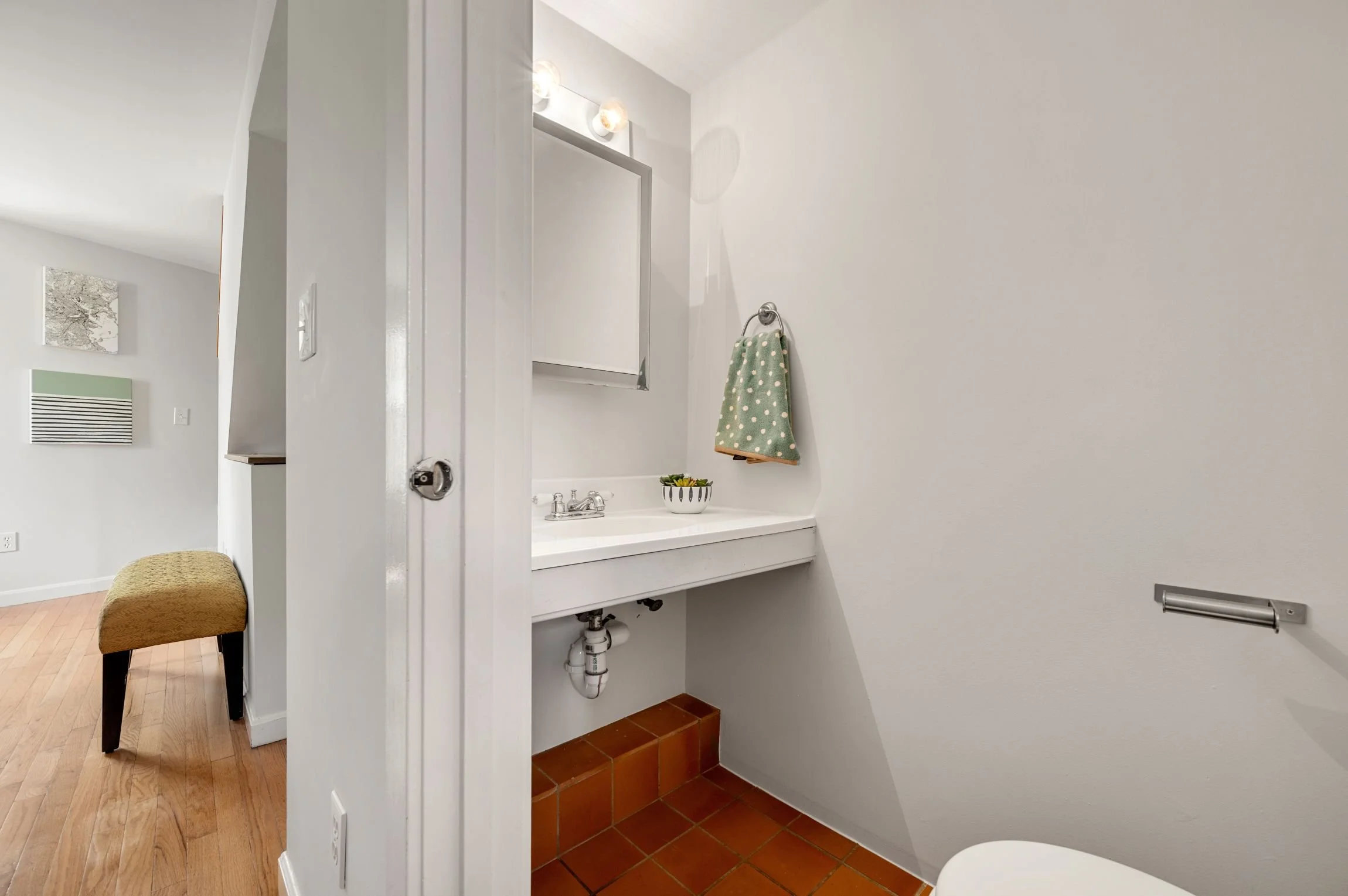 A half bath with a tile floor, floating glass shelf, and a medicine cabinet.