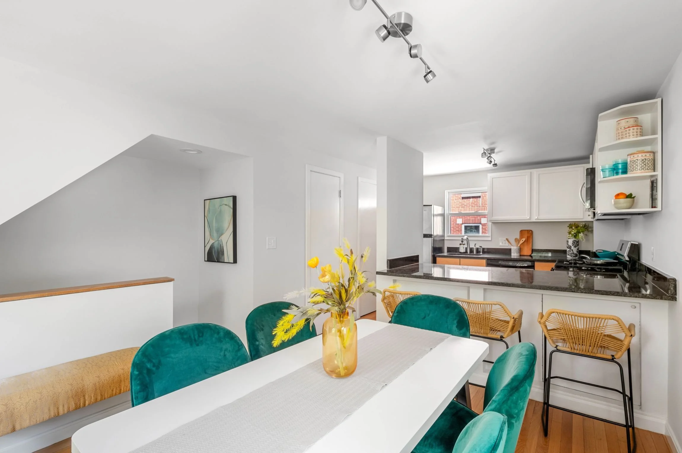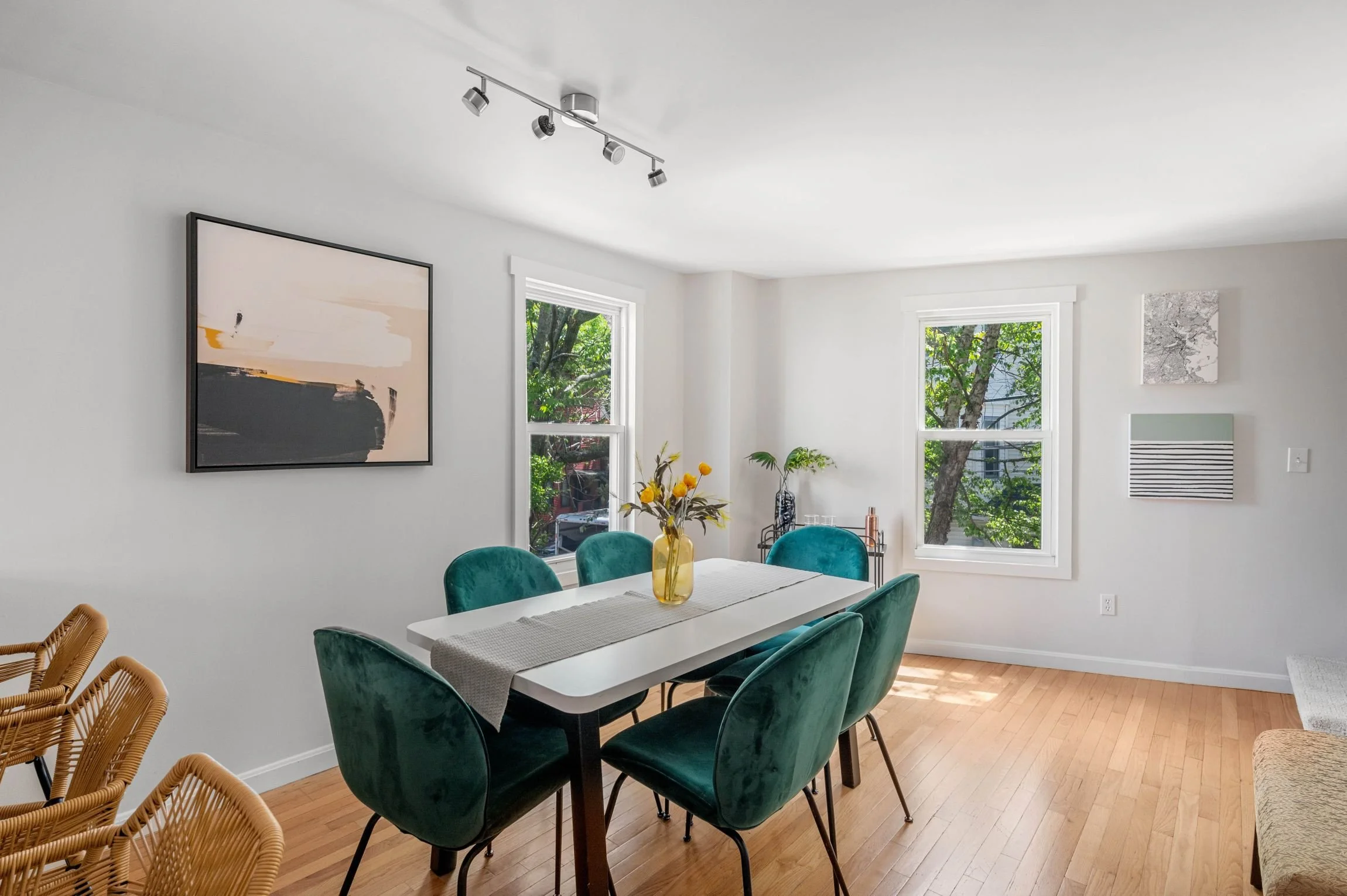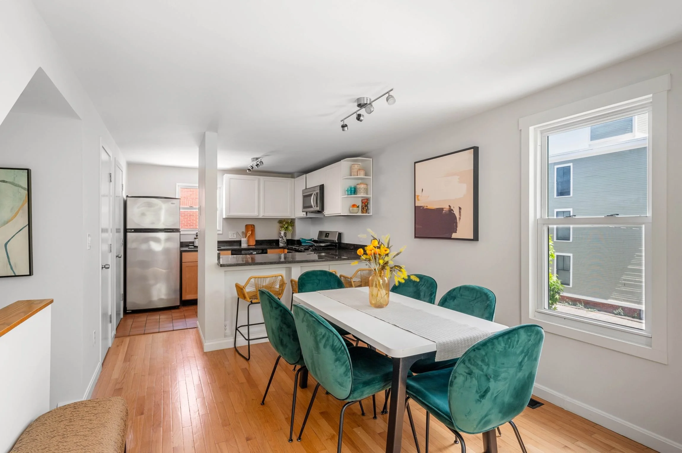 Enjoy a meal with friends and family in the beautiful sun-filled dining room seamlessly connected to the kitchen. This room has two large windows and hardwood floors.