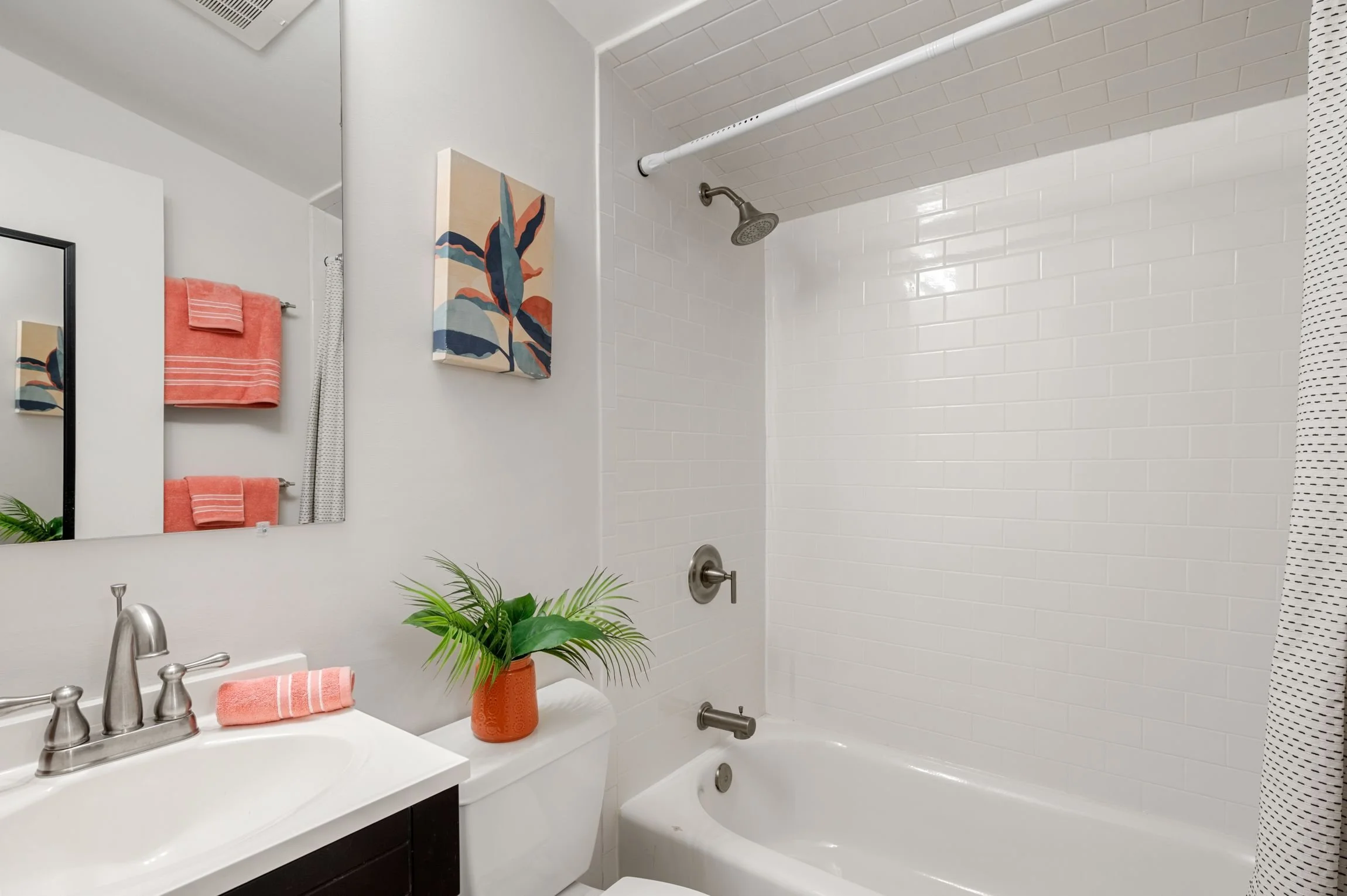 Full bath has a tumbled tile floor, a tub and shower combo with subway tile surround, and a single vanity for storage.