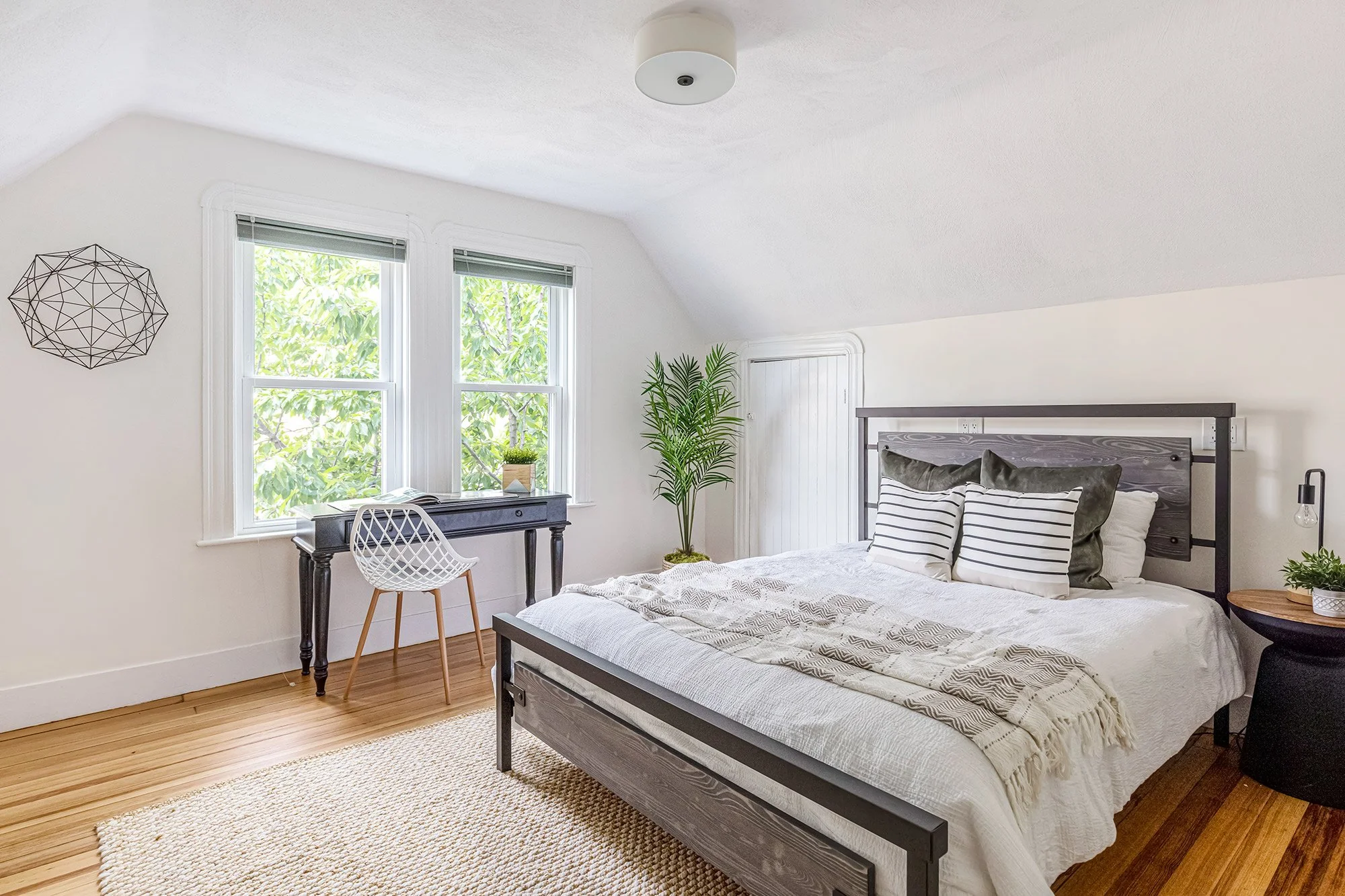 The 1st floor bedroom has windows offering views of the yard and a good-sized closet. The 2nd bedroom is directly above it with a private staircase.