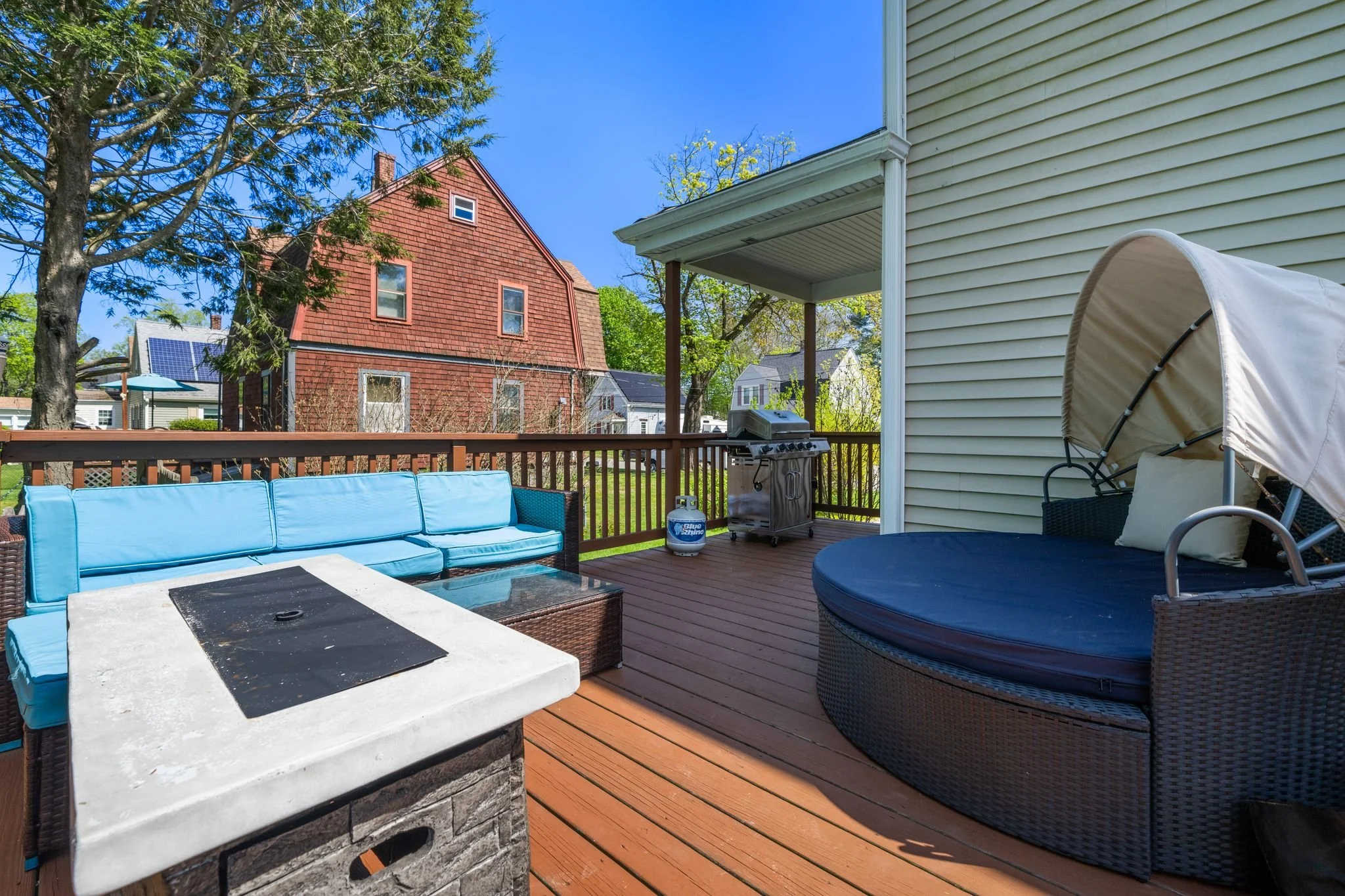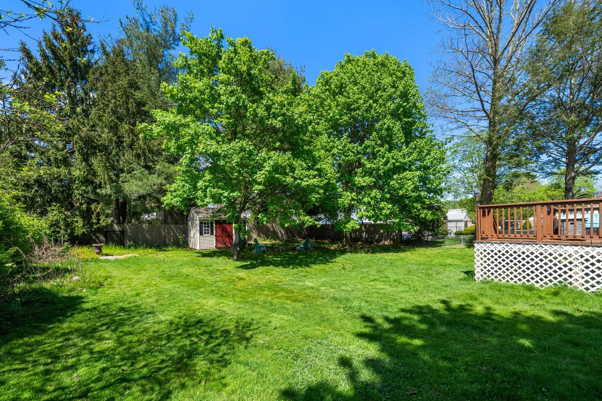 A small hallway at the back of the the kitchen leads to a partially roofed deck opening up to a sizable backyard and access to firepit and storage shed.