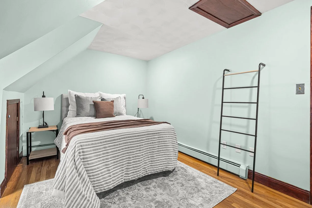 The primary bedroom offers hardwood floors, generous closet space and multiple windows that fill the room with the natural light of top-floor living.