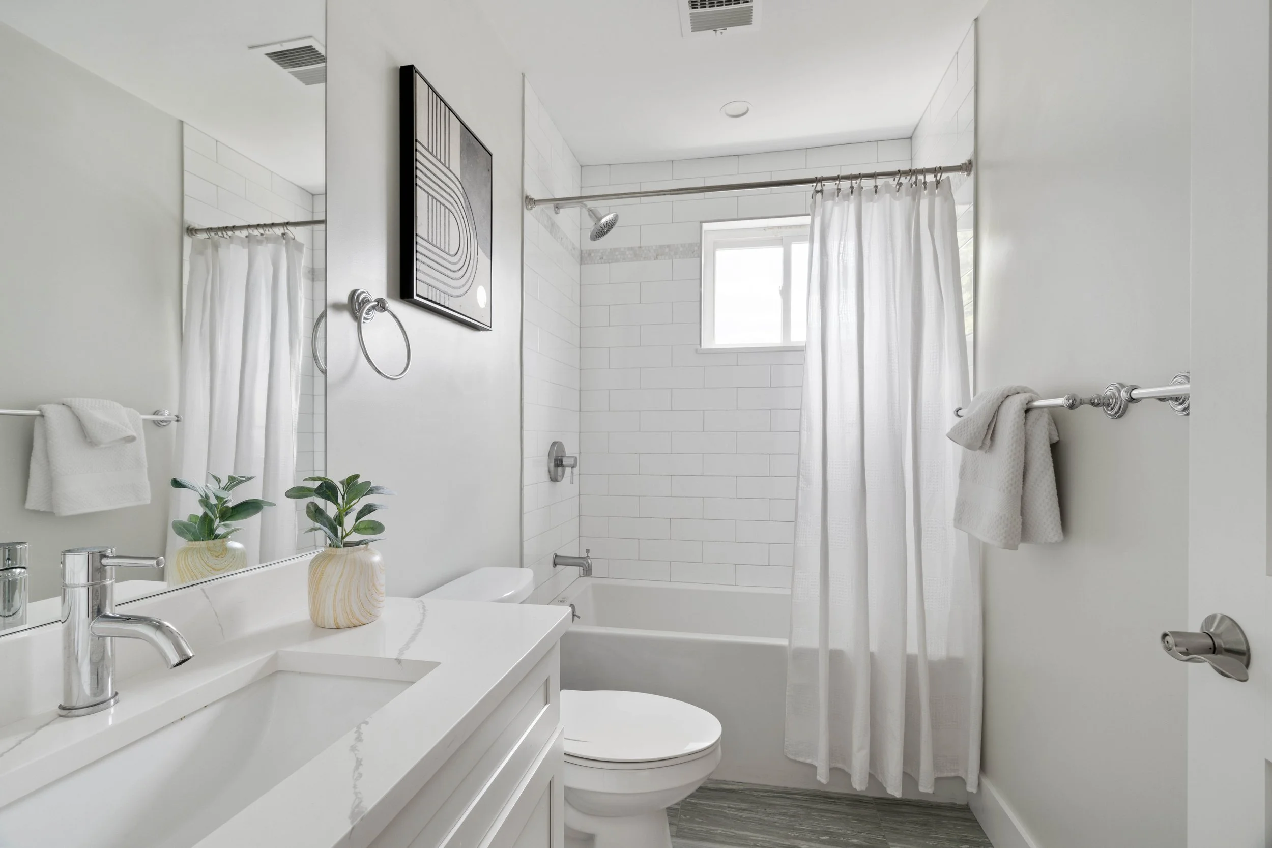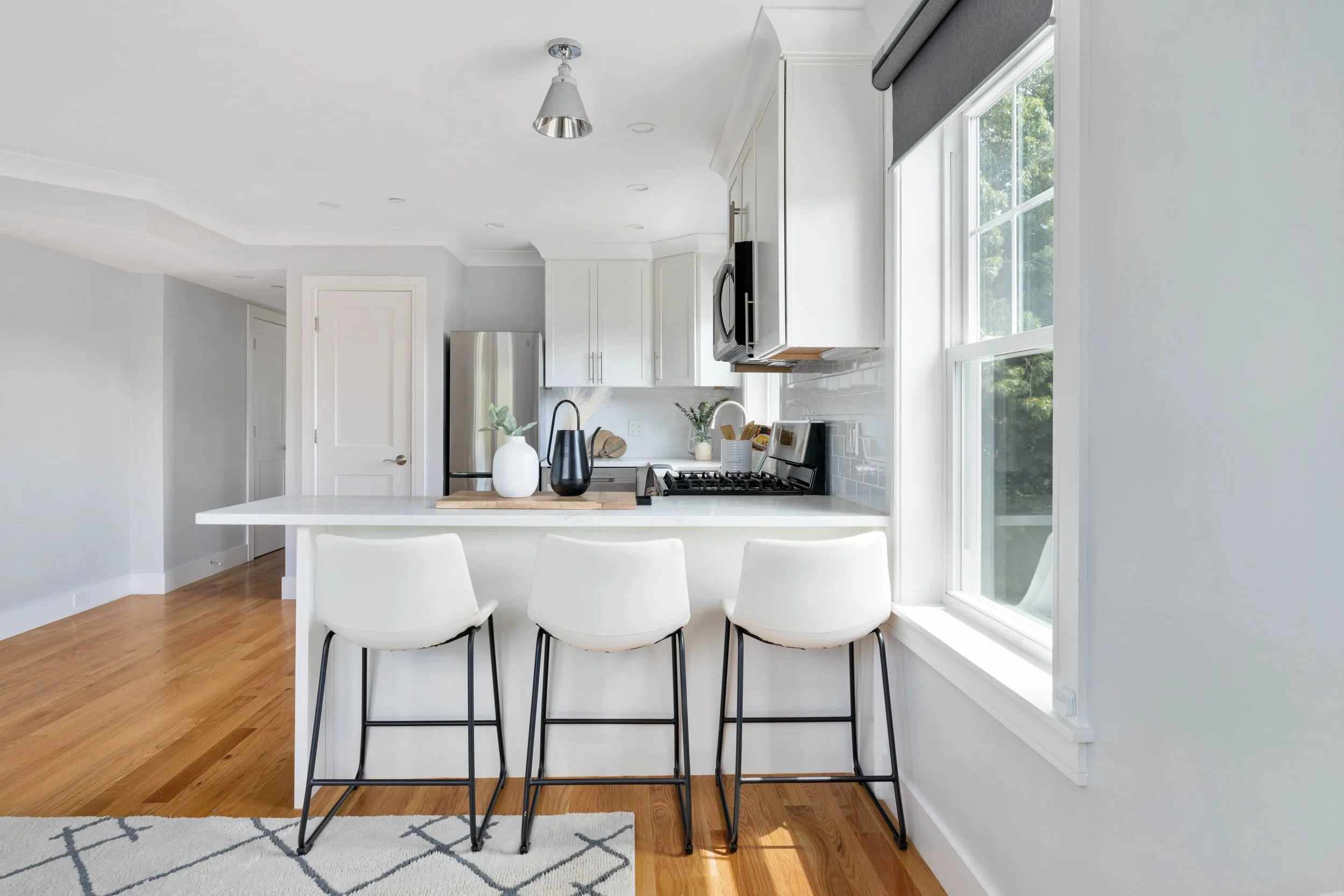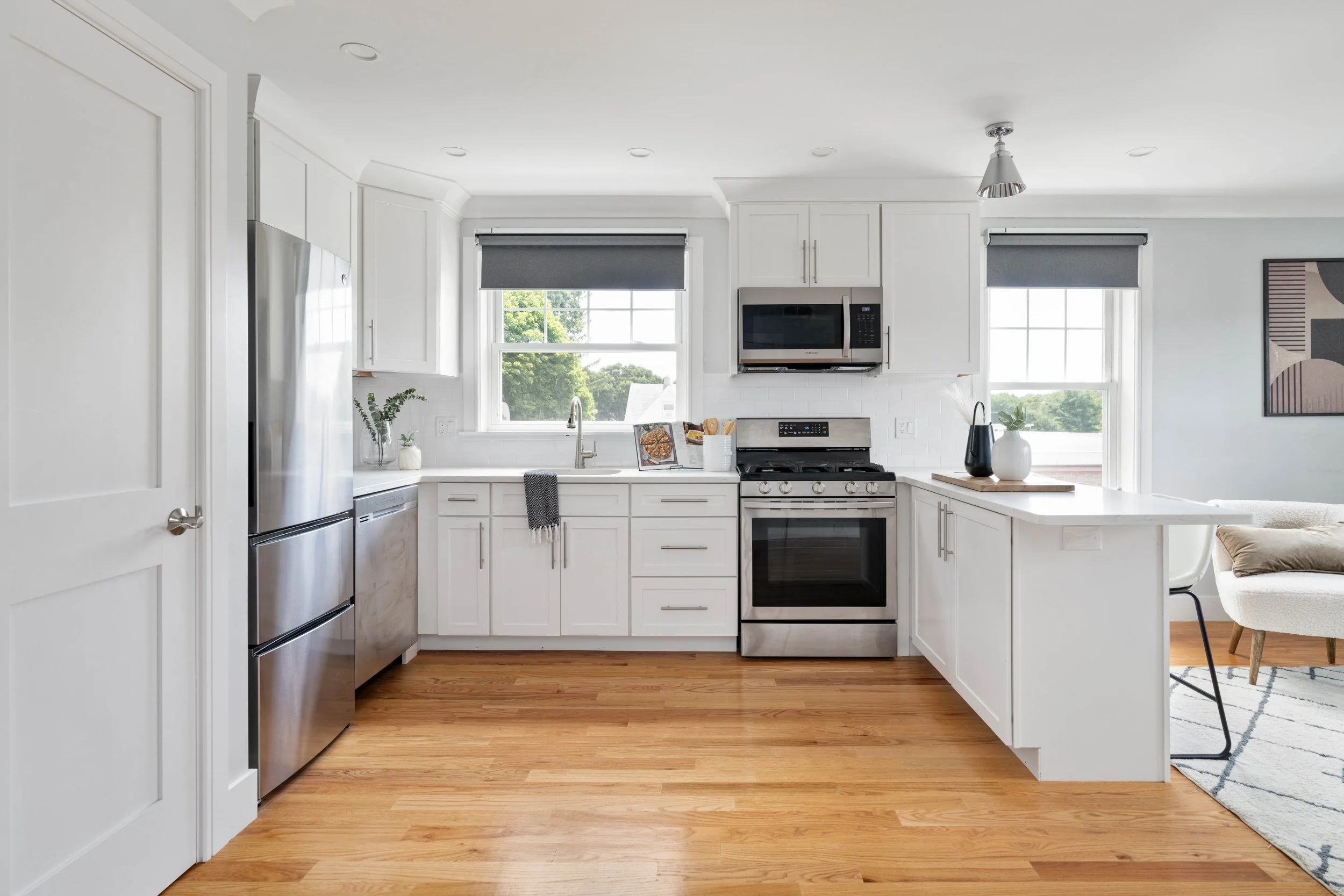The modern kitchen is the focal point of the home with a spacious white quartz peninsula that seats two people comfortably. Cooks will enjoy gleaming quartz countertops throughout, modern white shaker cabinets, and stainless steel appliances including a GE refrigerator, Samsung 5-burner Gas cooktop, Samsung dishwasher, and a Samsung microwave. A light flooded wide window finishes this beautiful and updated kitchen.