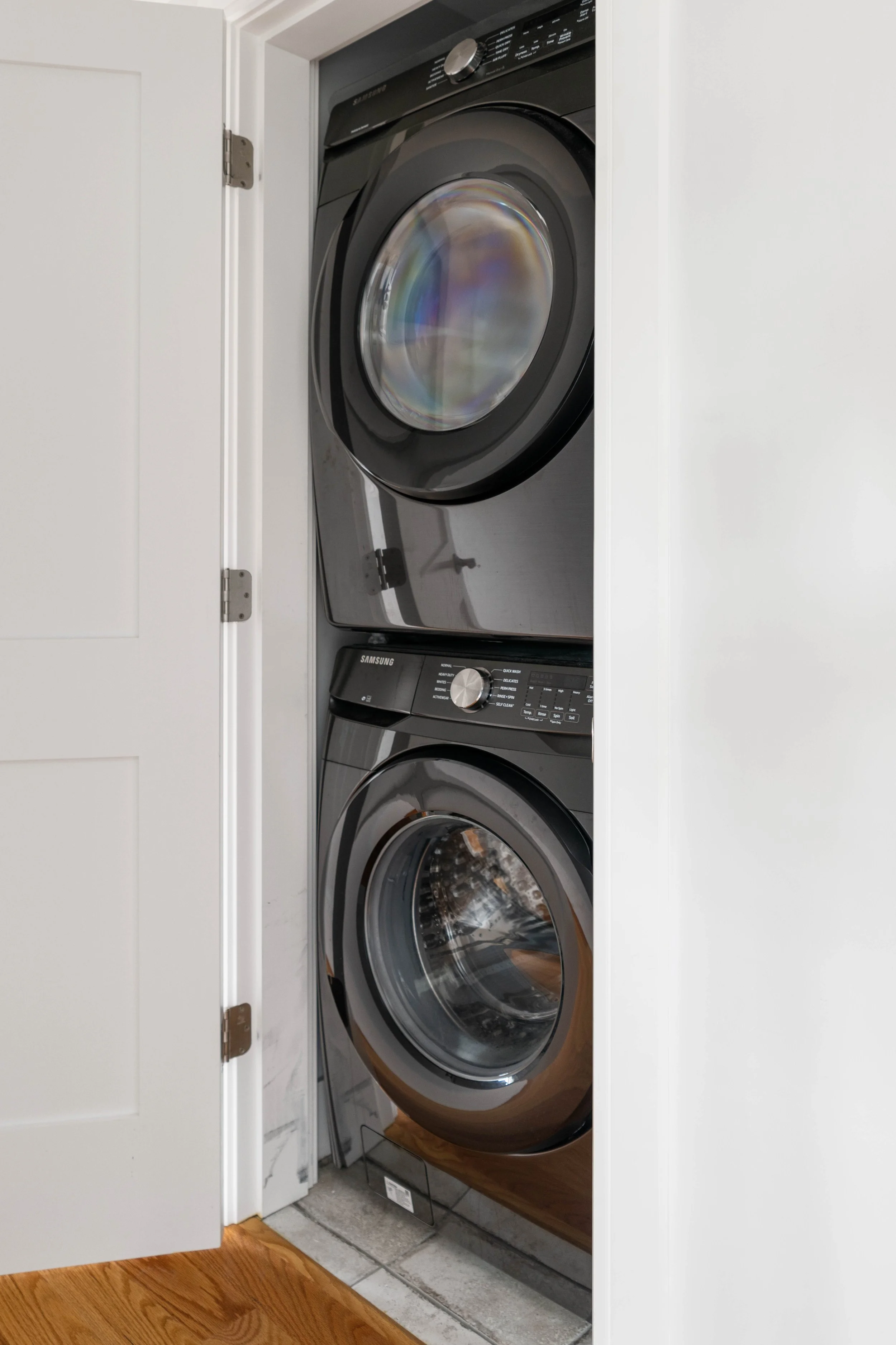 Laundry: In-unit stackable Samsung front loading washer and dryer.