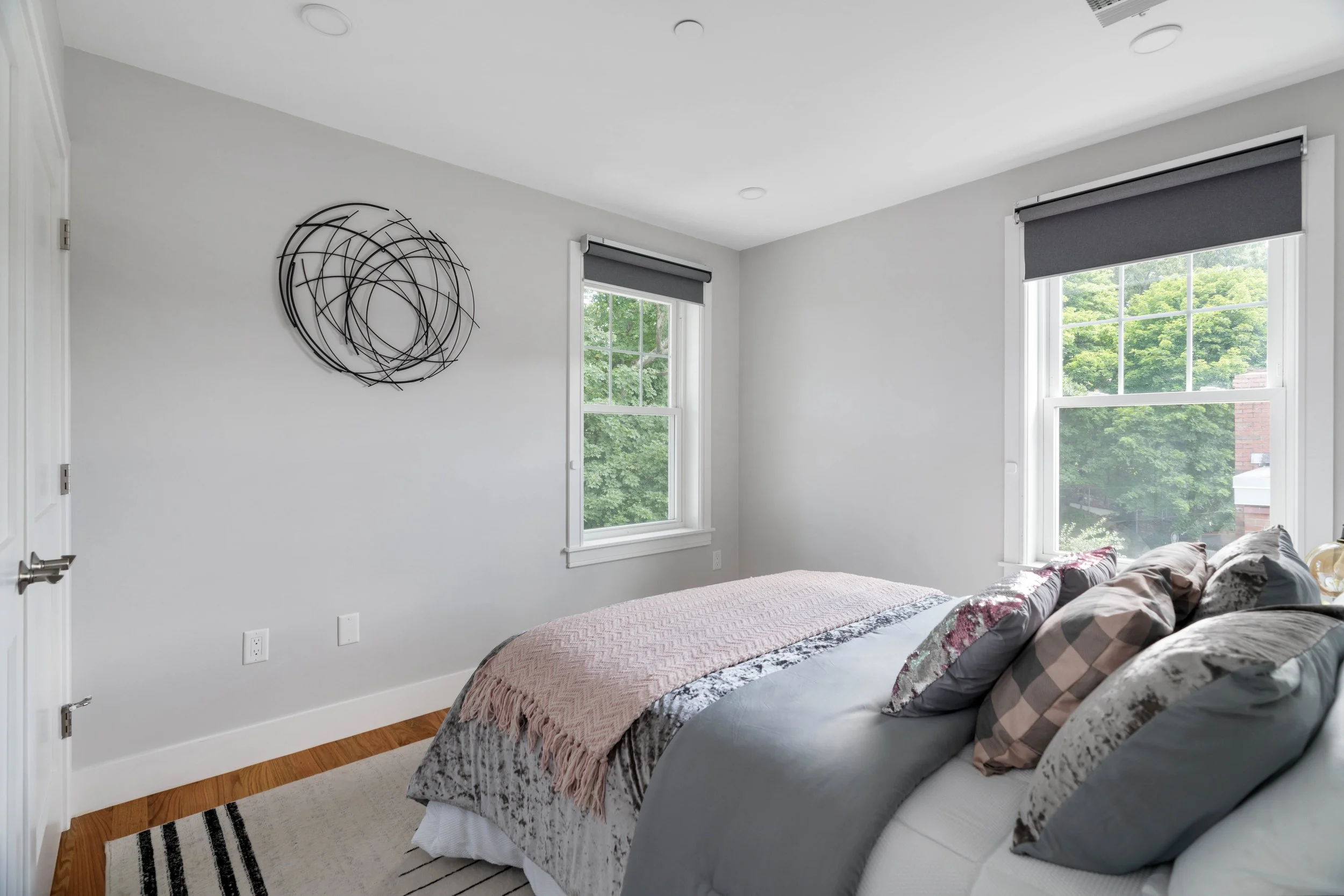 The main bedroom, which is located in the back on the right side of the unit, has two windows, recessed lighting, and a double- door closet.