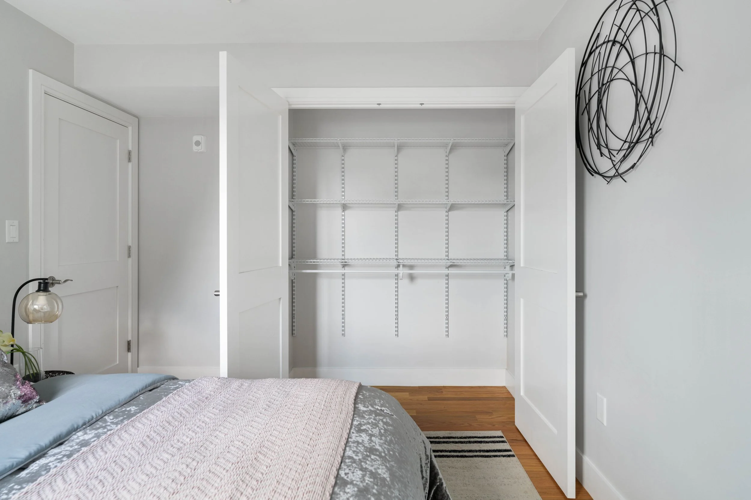 The secondary bedroom on the right side of the hallway has large windows, recessed lighting, and a double door closet. Perfect as a second bedroom or a home office.