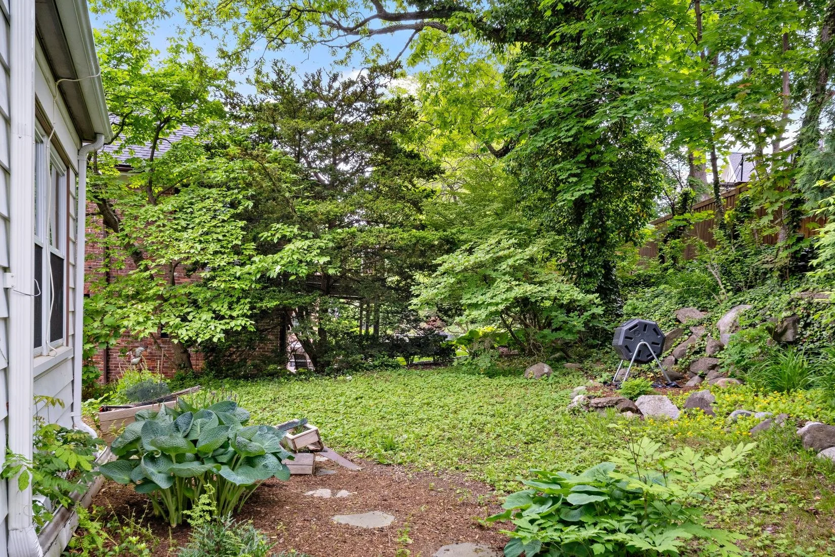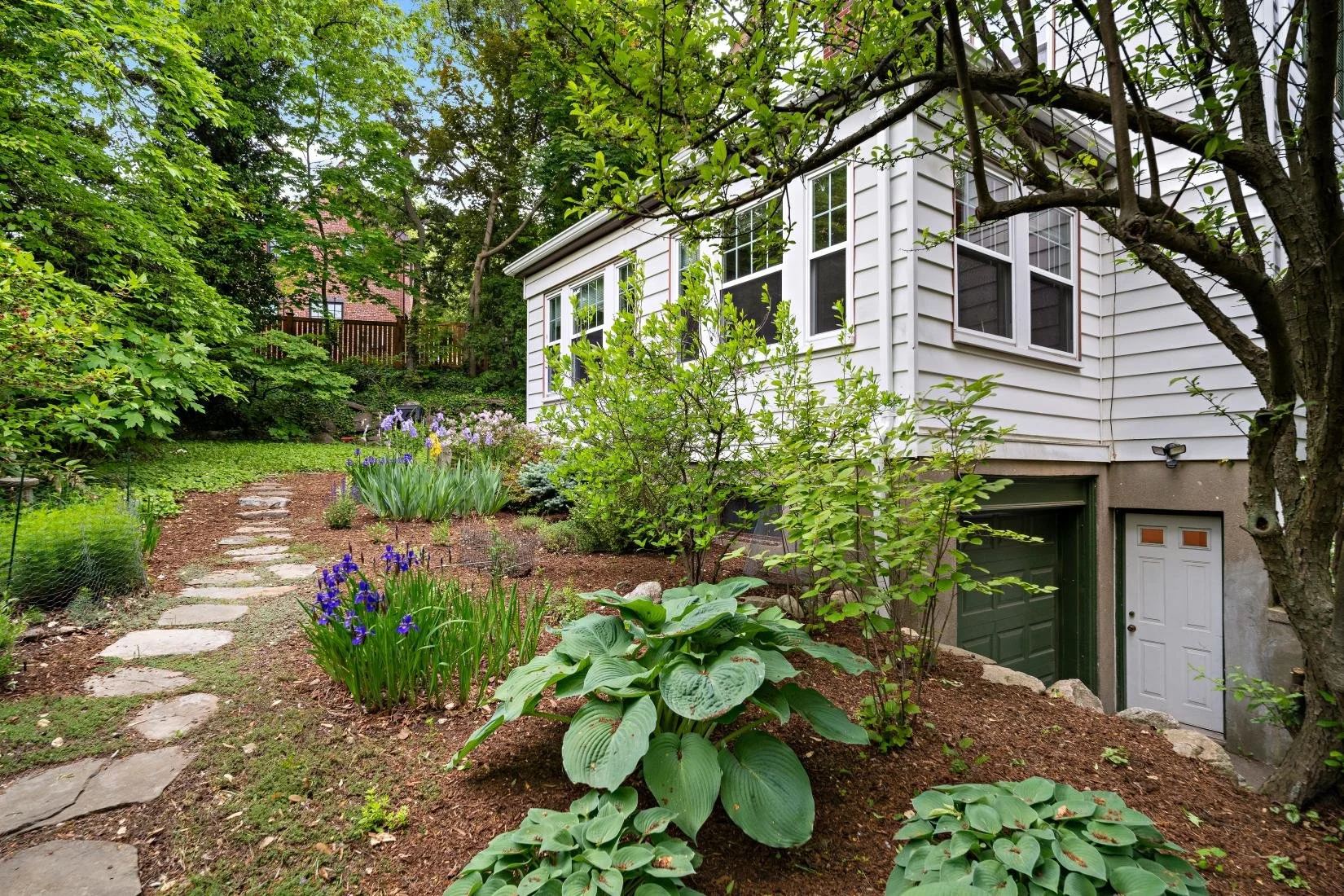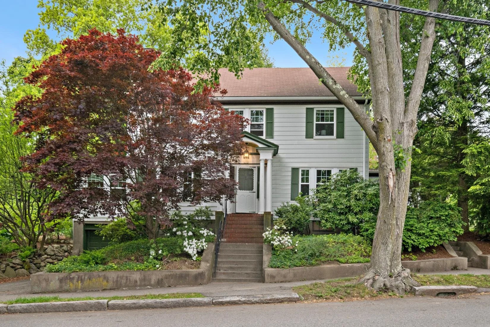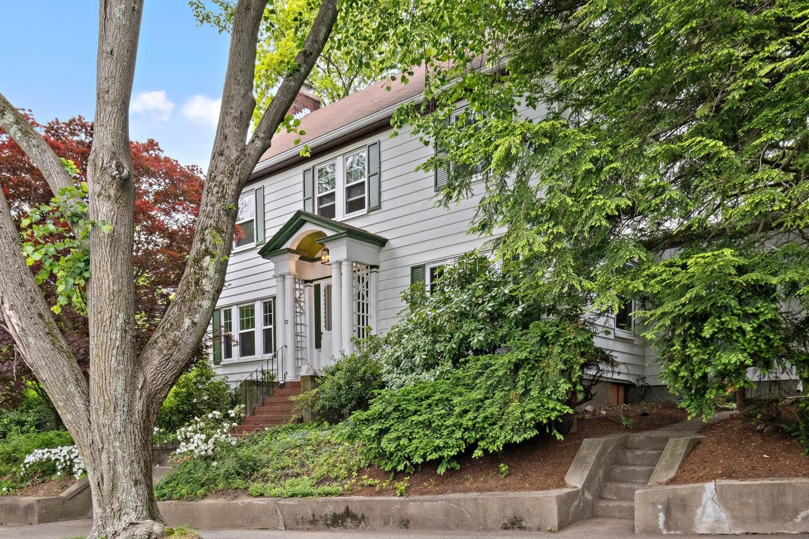 Front yard: Mature trees, bushes, and cement and brick stairs