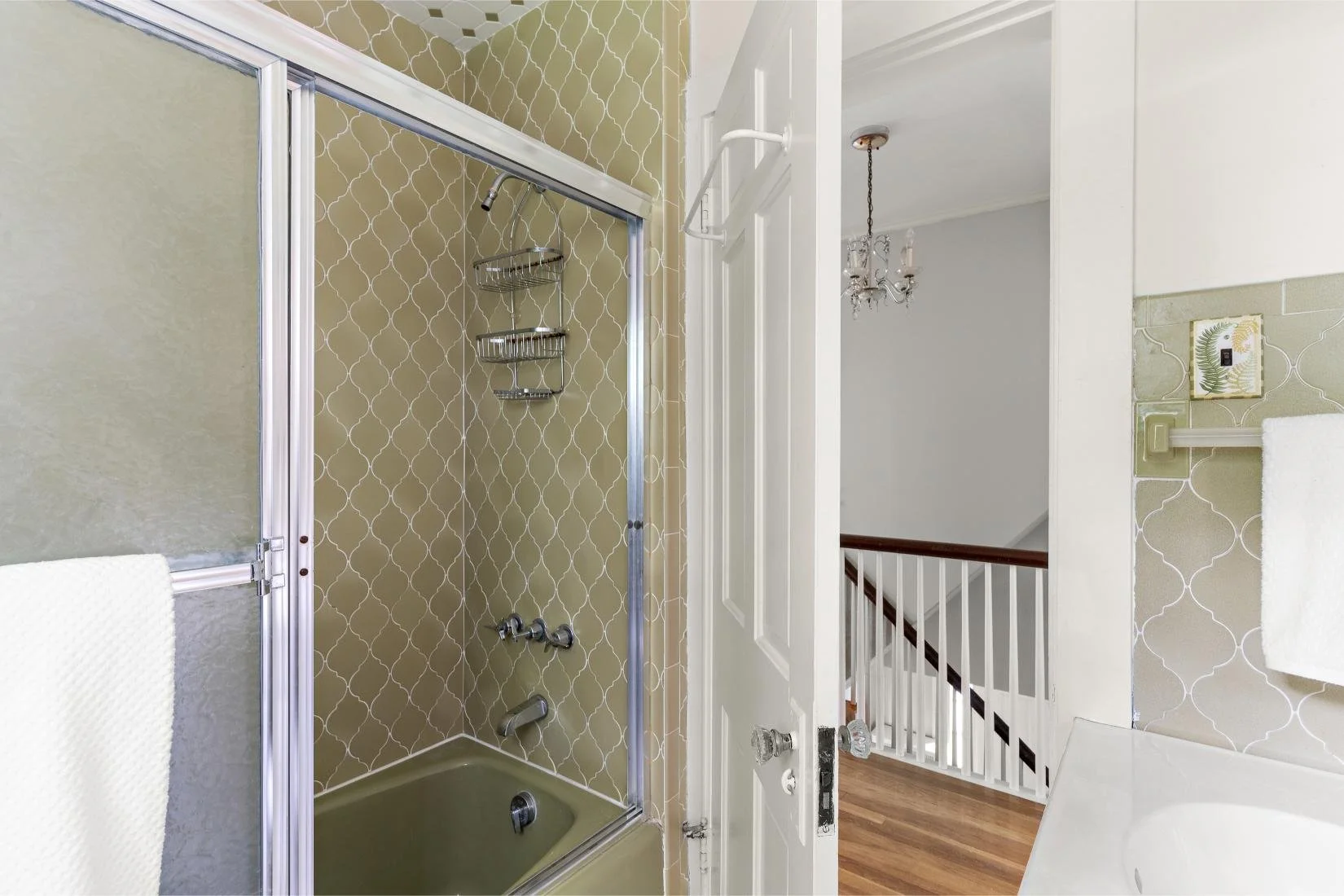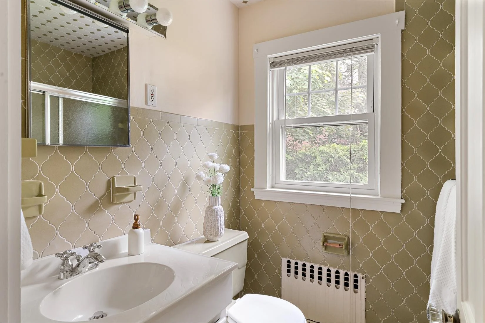 The full retro guest bathroom features a tiled floor and wall with green decorative patterns, a bathtub/shower combination, a vanity, and a window that lets in plenty of natural light.