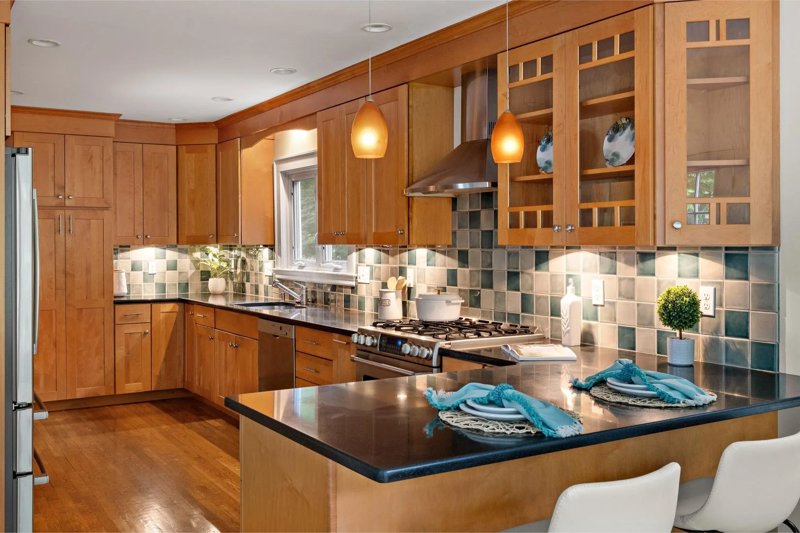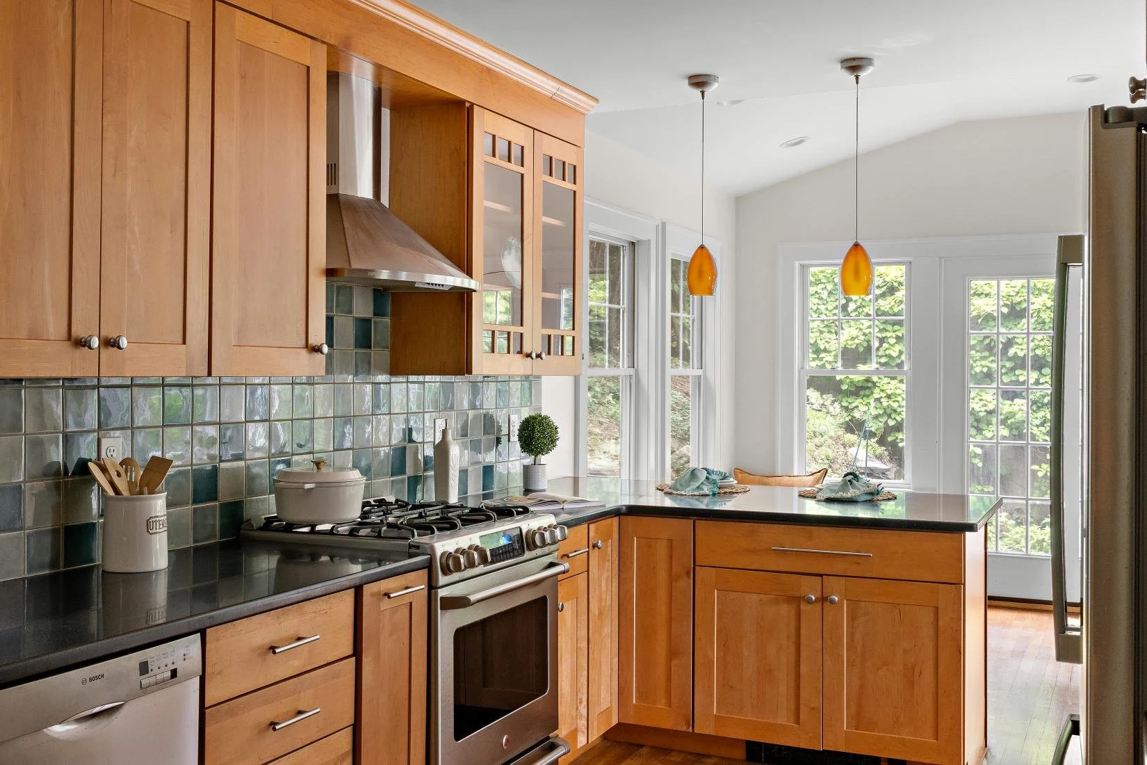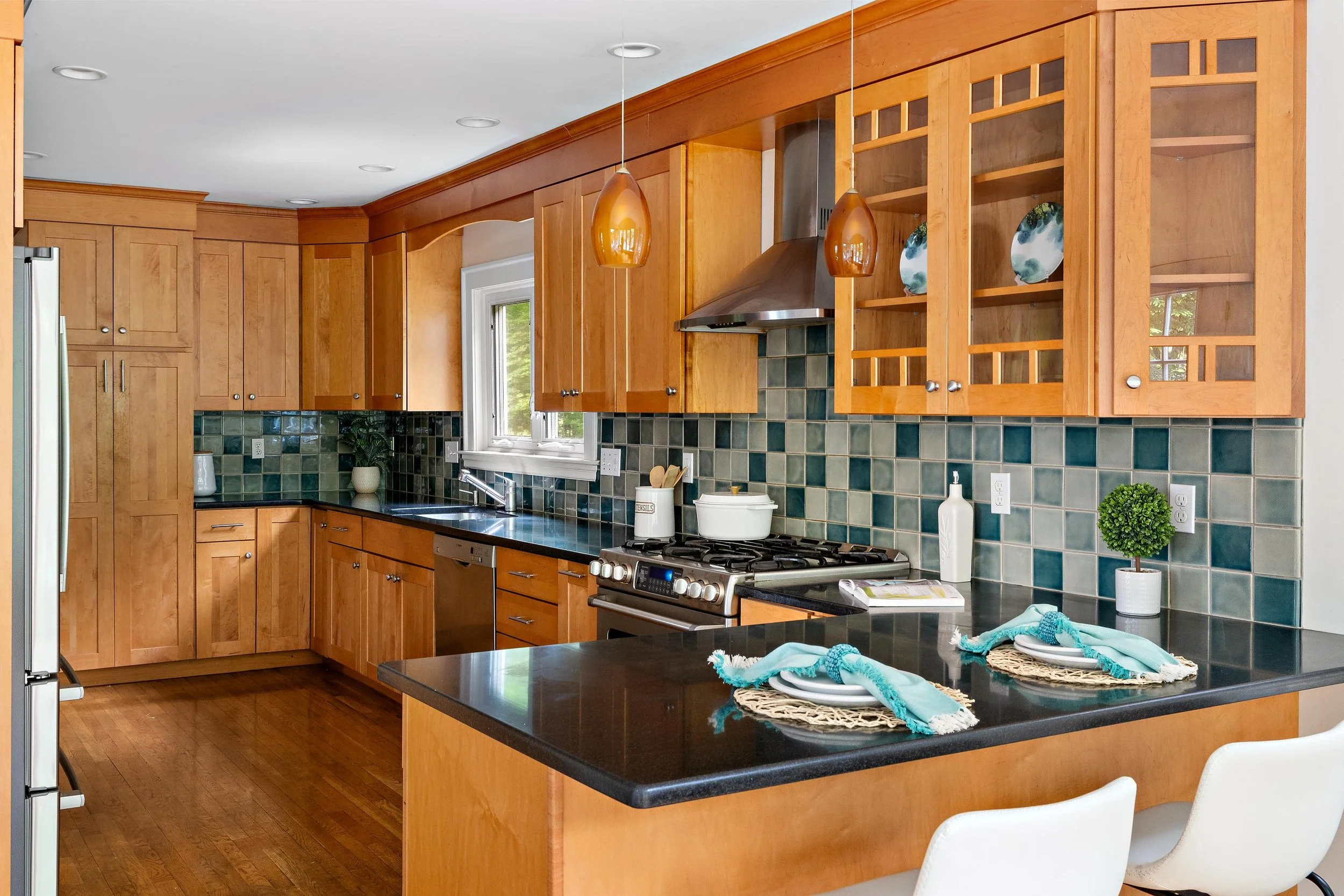 The updated, well-equipped kitchen boasts rich cherry wood cabinets, granite countertops, and a decorative tile backsplash in shades of blue, green, and grey. Stainless steel appliances include a refrigerator, gas range, stove hood, dishwasher, and a sink with garbage disposal. Two stylish orange pendant lights hang above the breakfast bar, which comfortably seats three. Additionally, there's a spacious area for an informal dining table that seats four, with direct access to the patio—perfect for everyday meals and easy indoor-outdoor living.