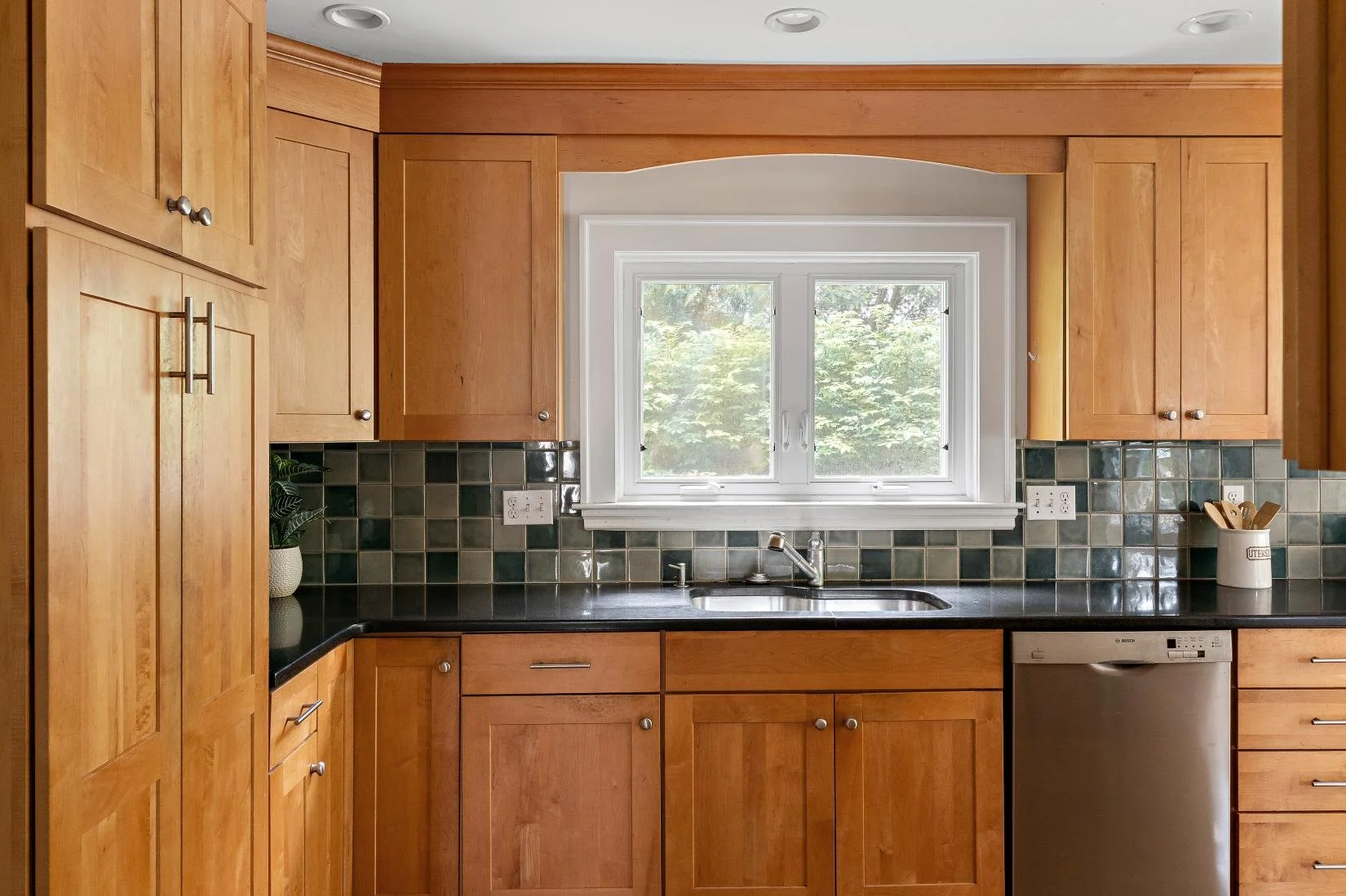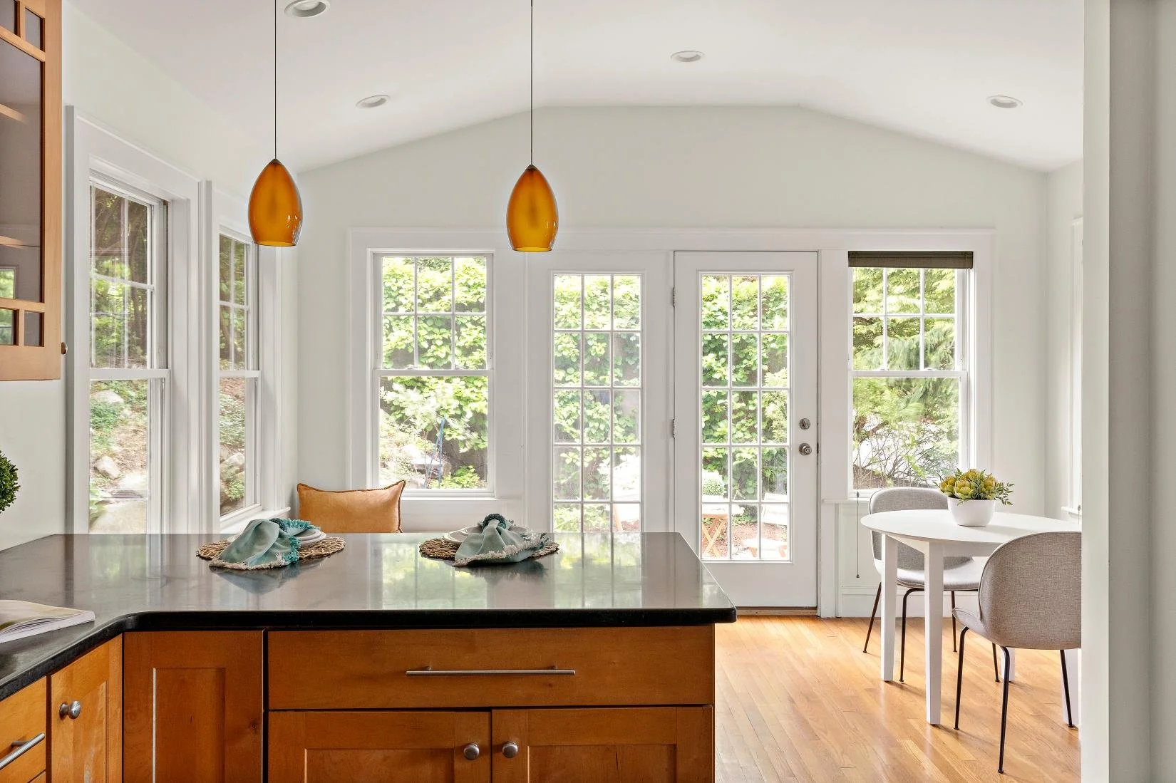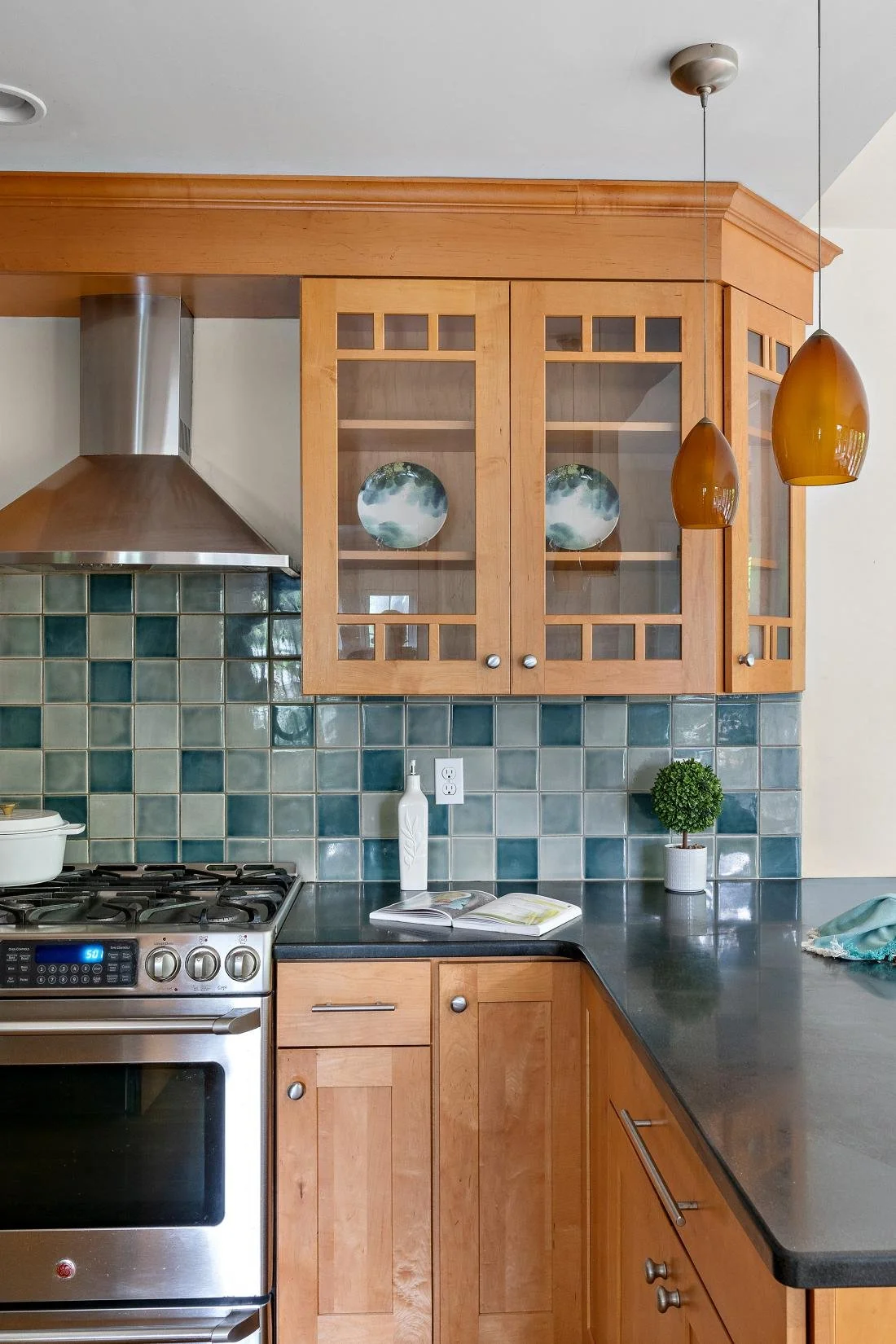 The updated, well-equipped kitchen boasts rich cherry wood cabinets, granite countertops, and a decorative tile backsplash in shades of blue, green, and grey. Stainless steel appliances include a refrigerator, gas range, stove hood, dishwasher, and a sink with garbage disposal. Two stylish orange pendant lights hang above the breakfast bar, which comfortably seats three. Additionally, there's a spacious area for an informal dining table that seats four, with direct access to the patio—perfect for everyday meals and easy indoor-outdoor living.