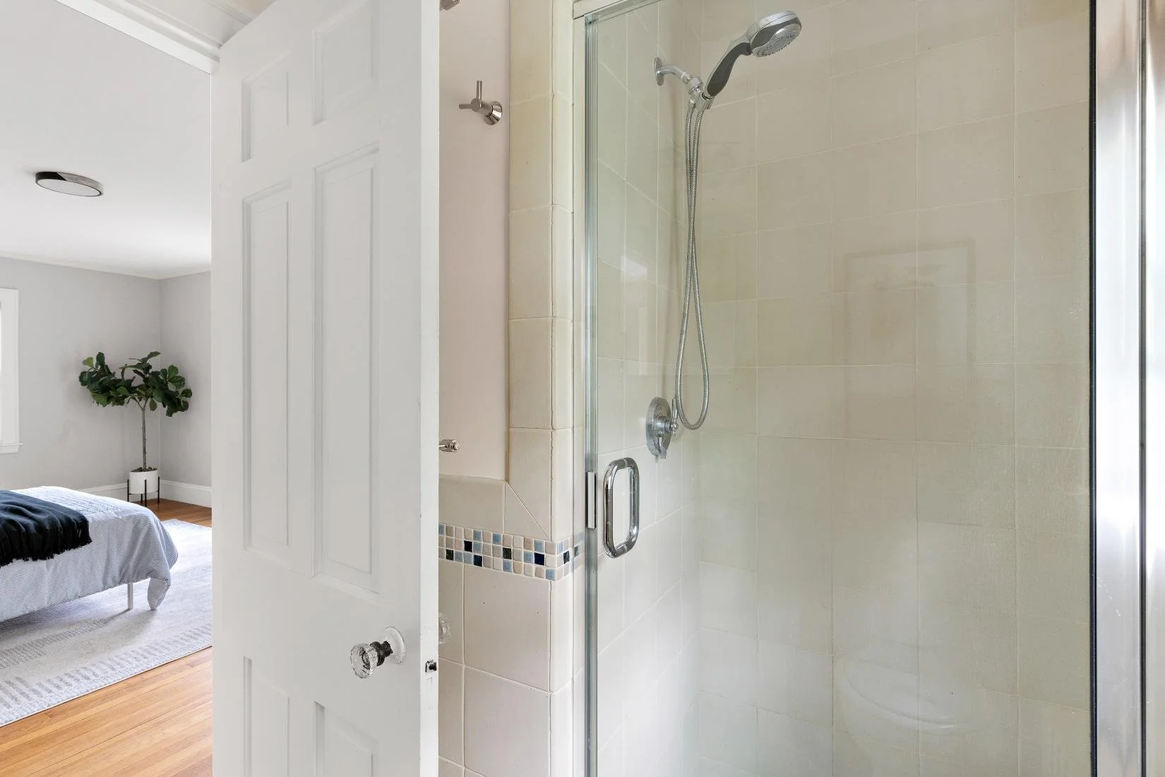 The primary bedroom includes a spacious closet, a full bathroom with a tiled walk-in shower, and direct door access to the roof above the sunroom—offering the potential to be refinished into a permanent roof deck.