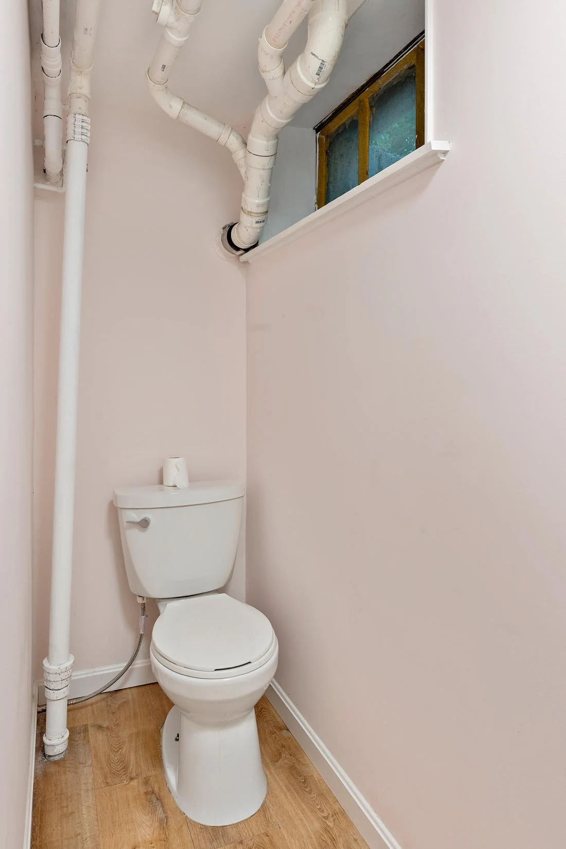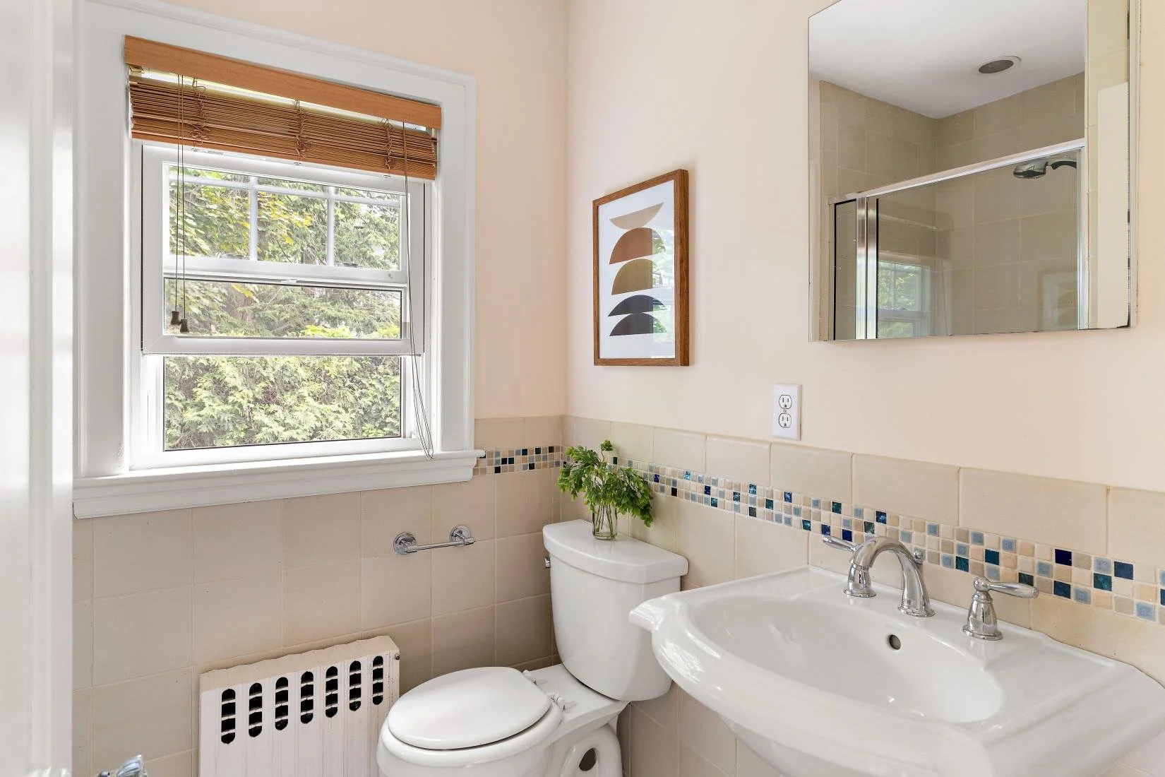 Just off the living room, you'll find a conveniently located half bathroom, complete with a pedestal sink and wood flooring.