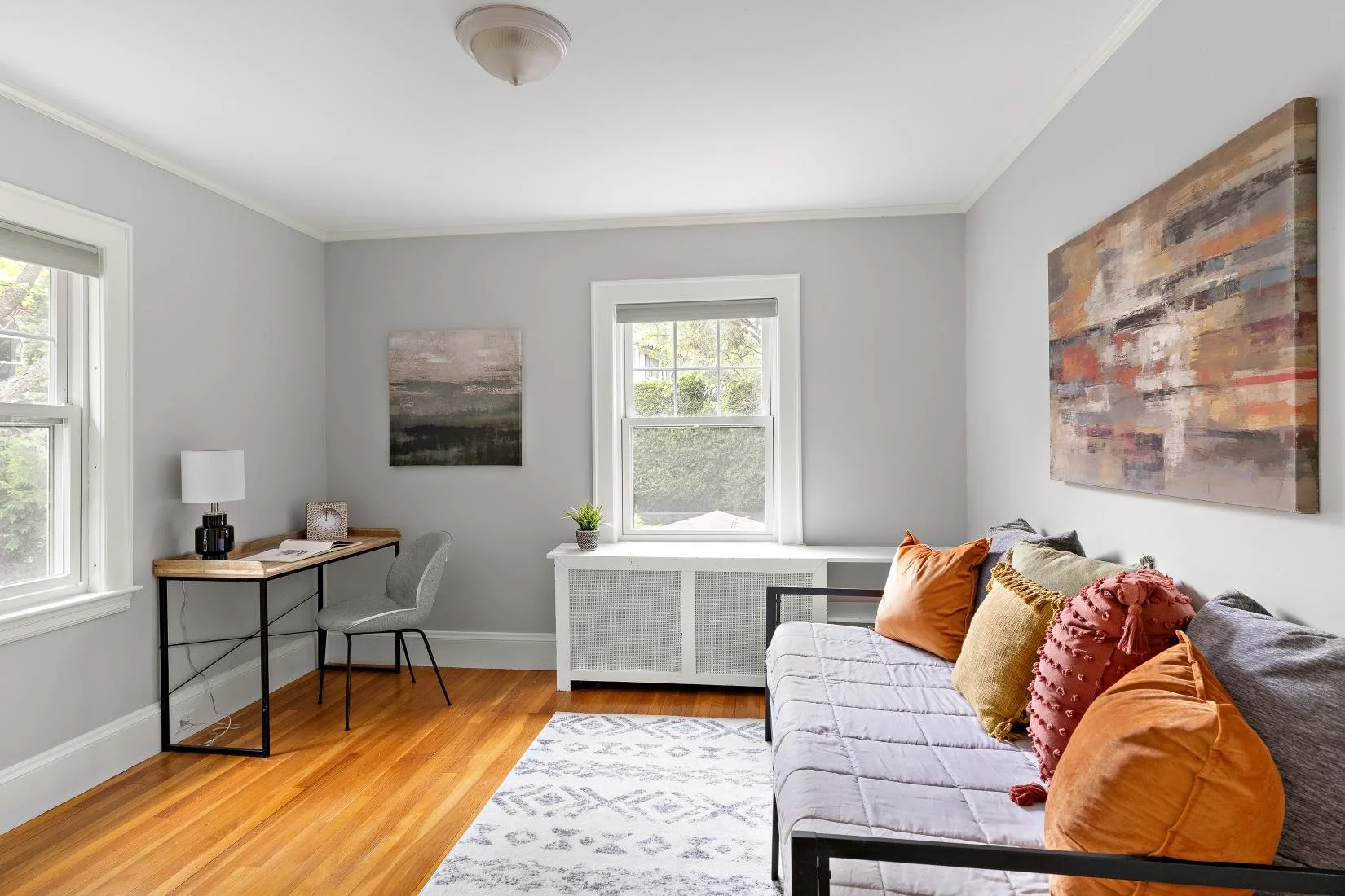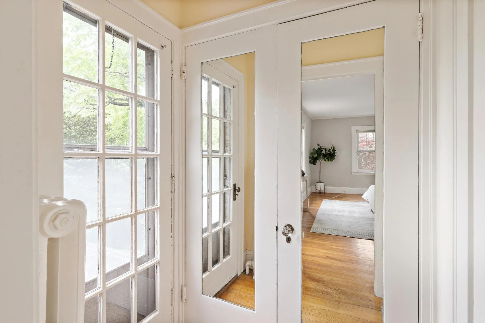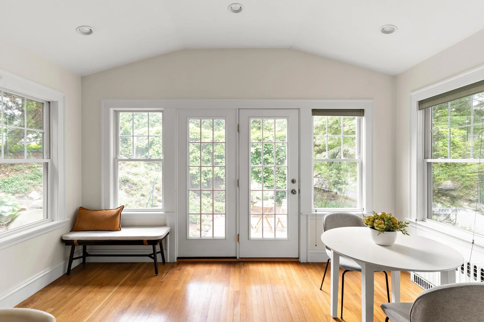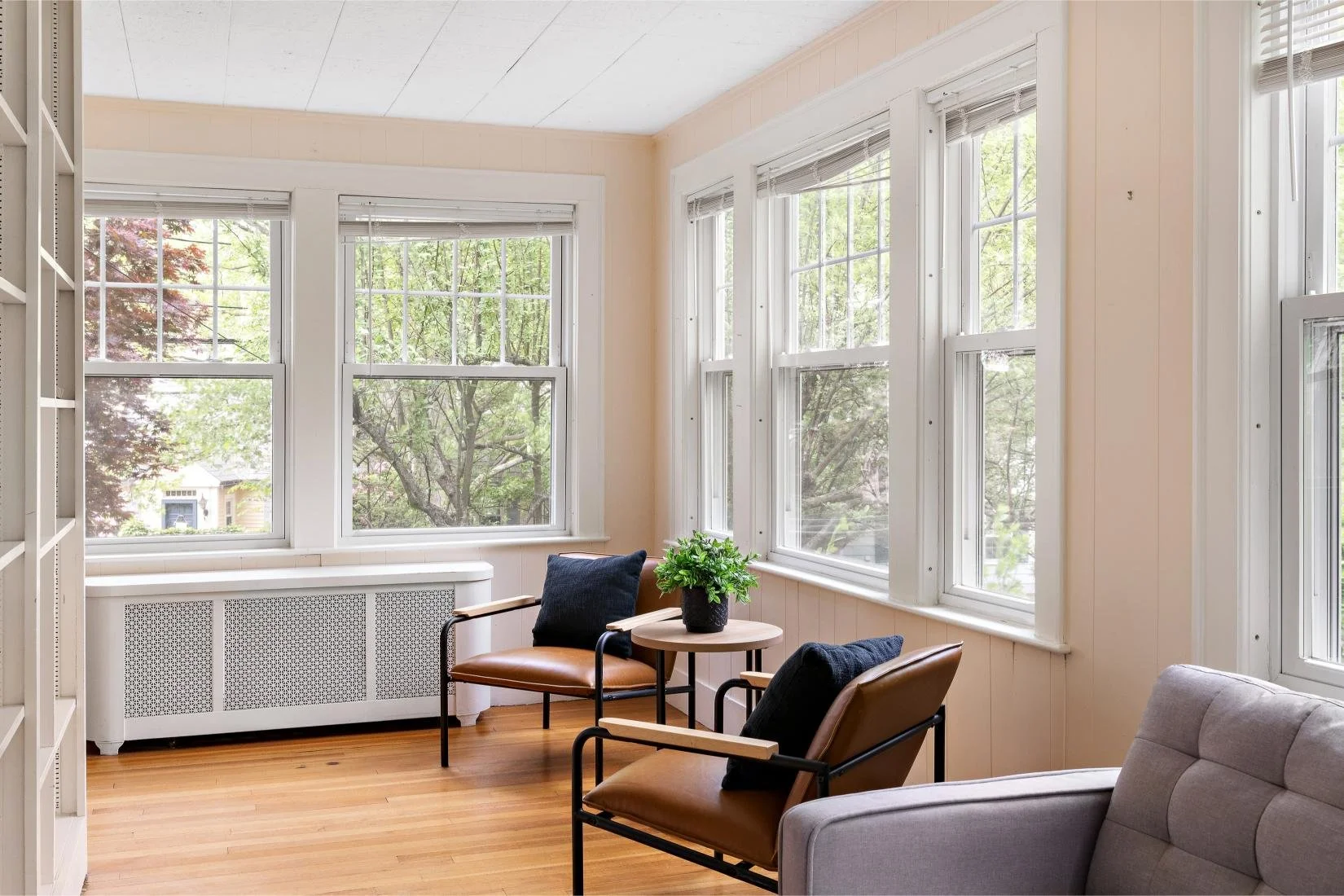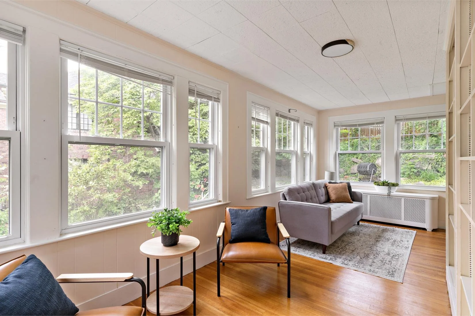 Situated on the other side of the living room is a sunroom bathed in natural light on all sides, offering a bright and inviting space. Featuring built-in shelves, it's the perfect spot to read a book, enjoy your morning coffee, or simply relax.
