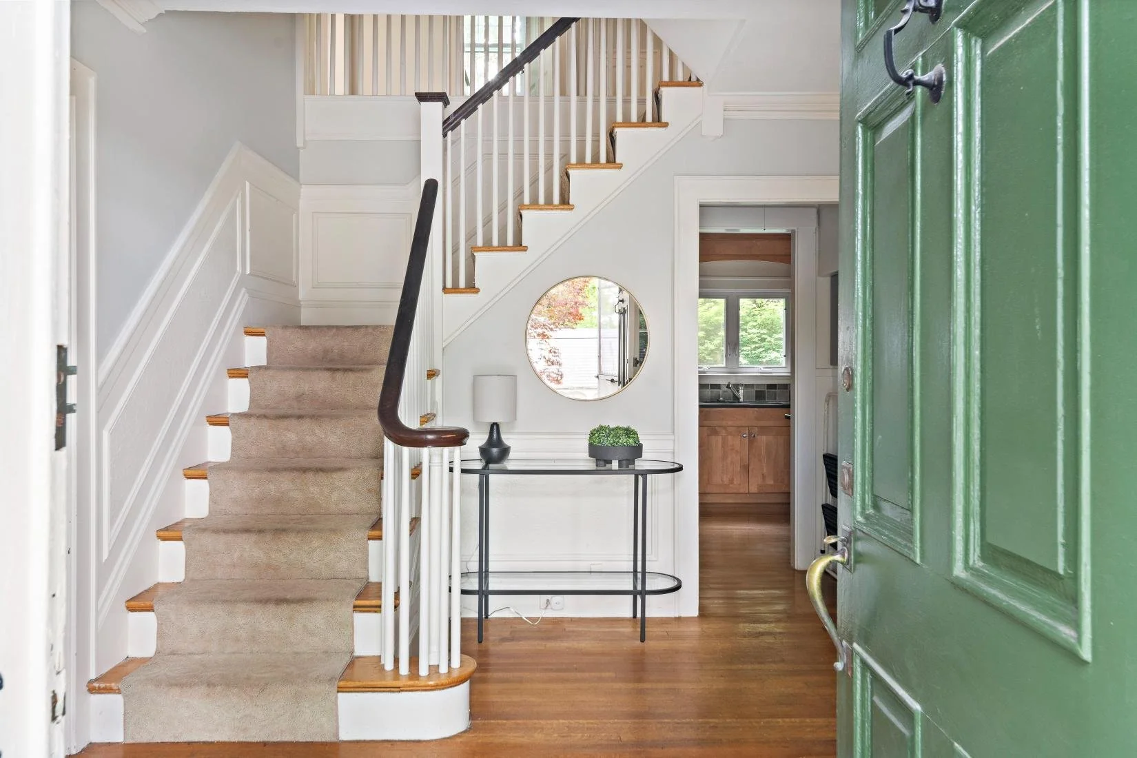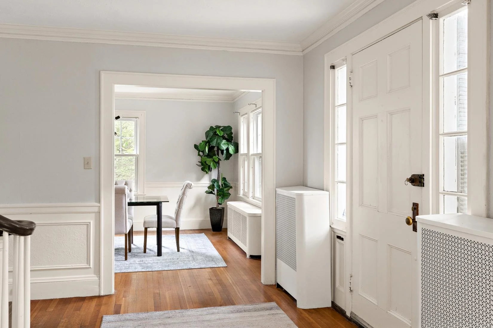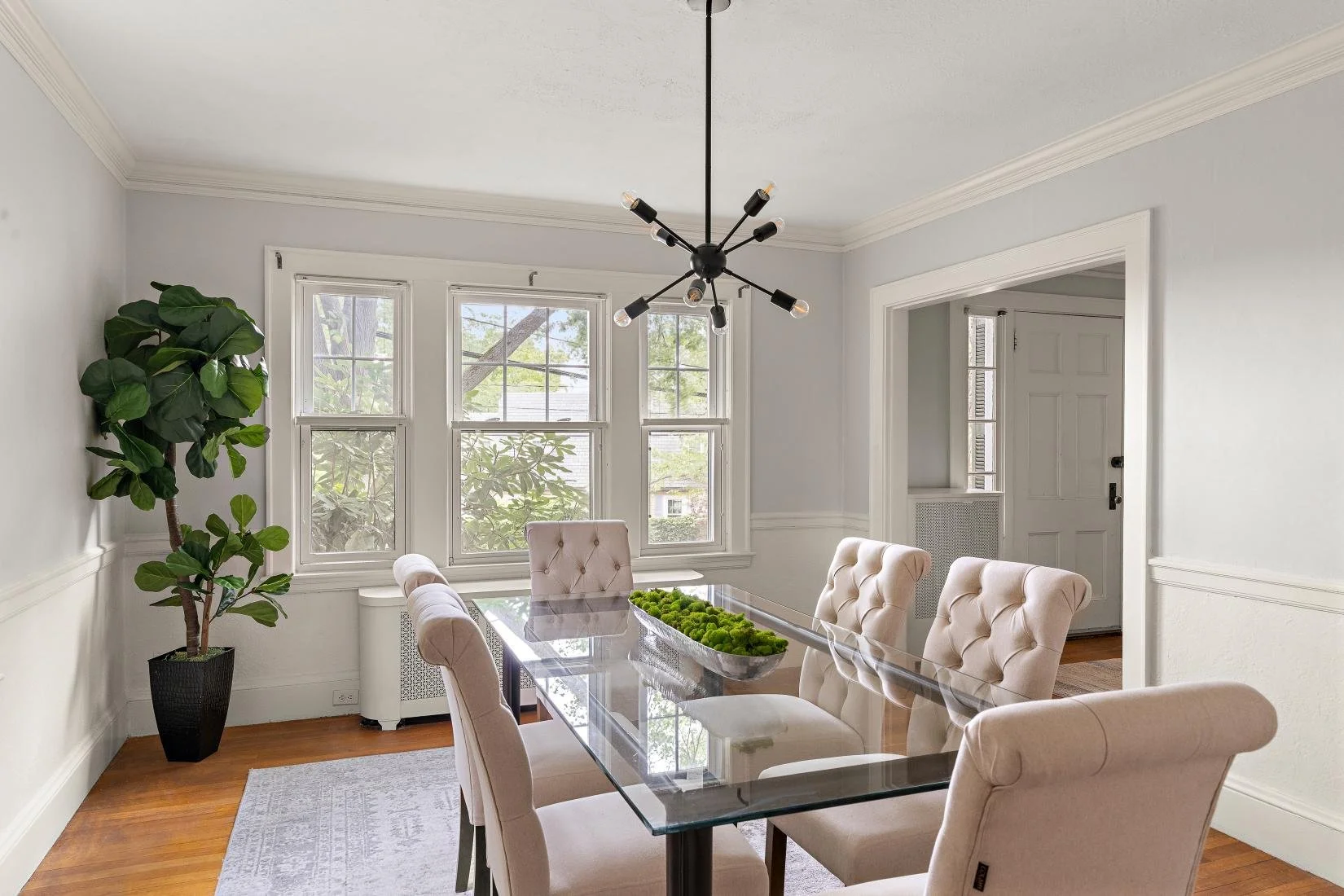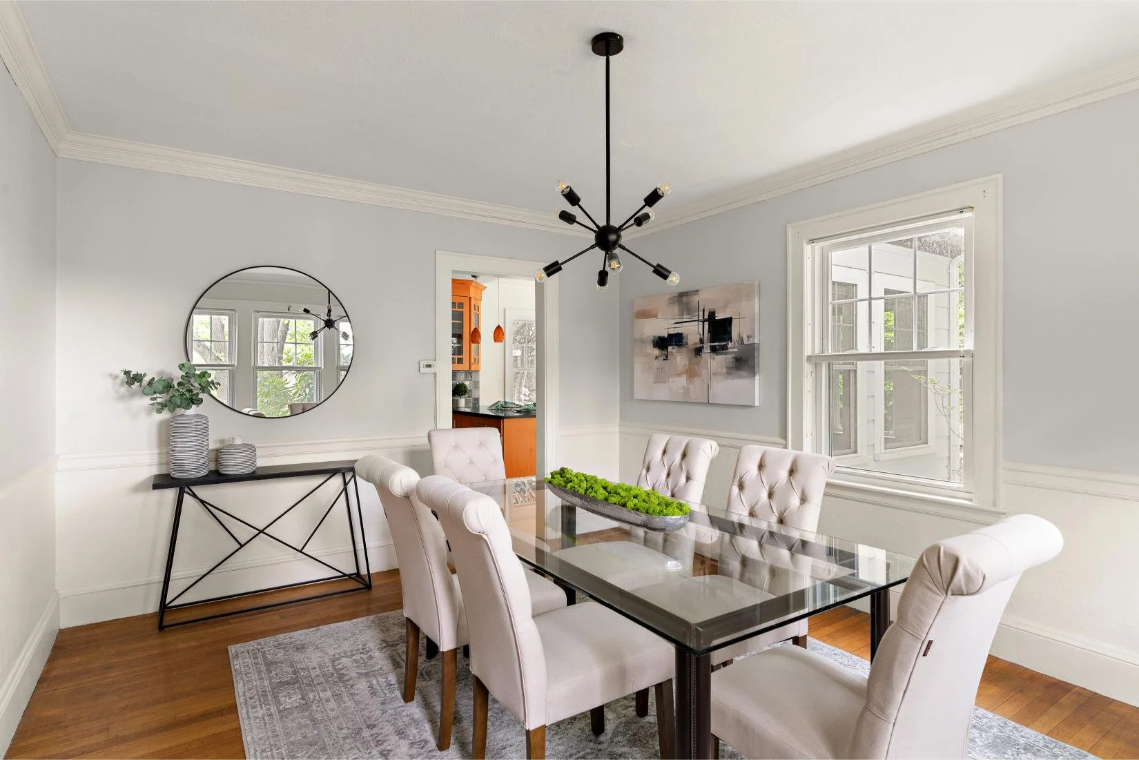 The formal dining room is located to the right of the foyer and just off the kitchen. It offers ample space for a table that comfortably seats eight to ten guests and features a classic chair rail—perfect for entertaining.