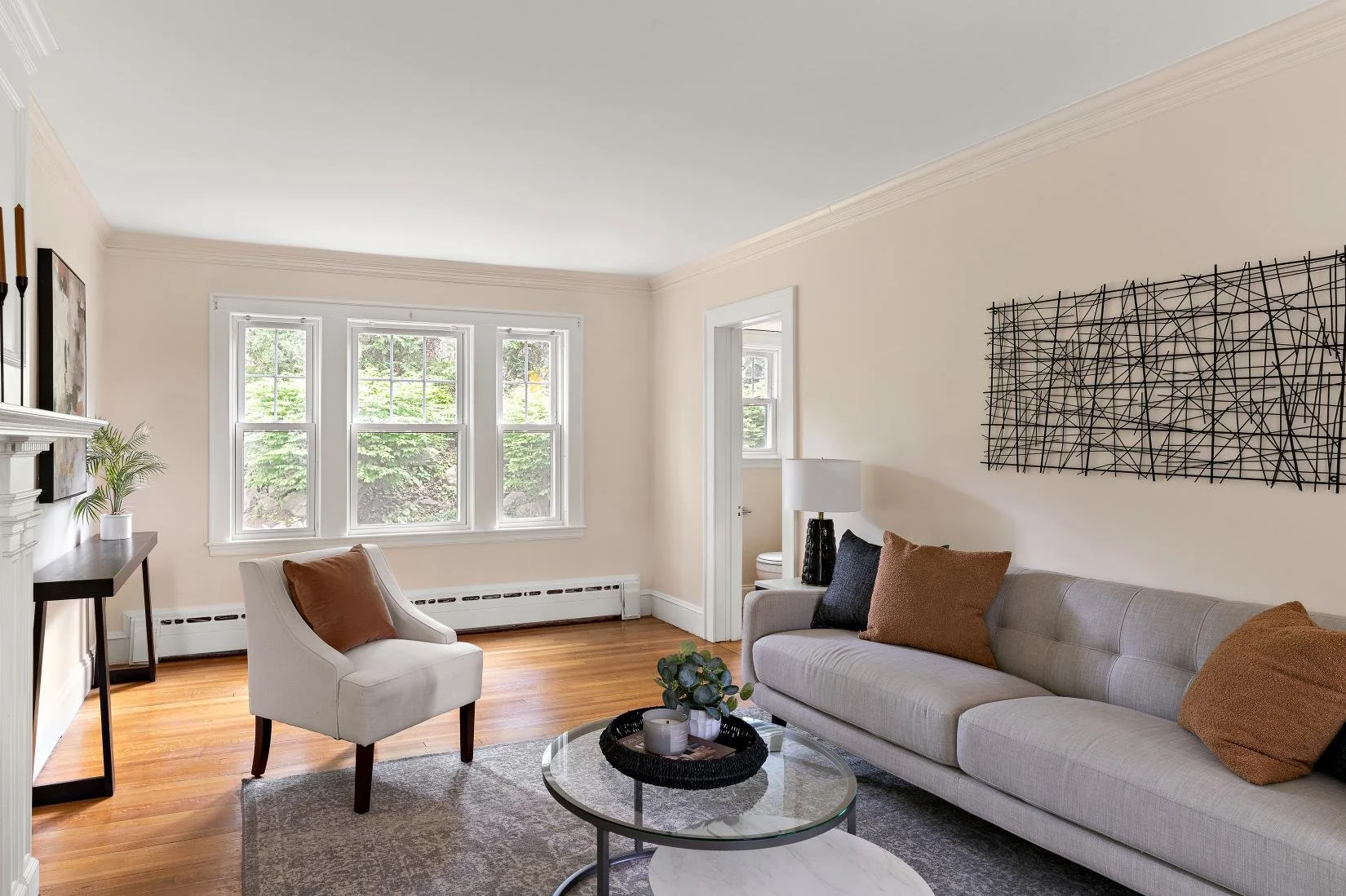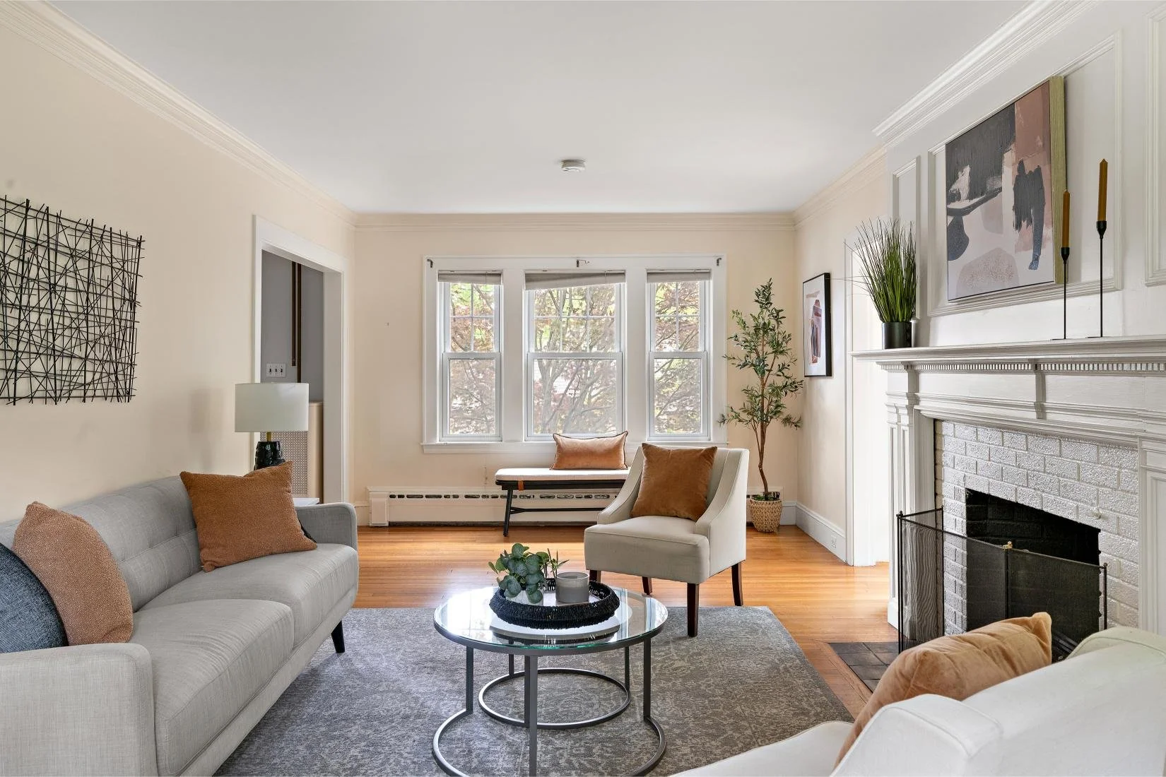 To the left of the foyer is a welcoming front-to-back living room, featuring a wood-burning fireplace framed by white brick and a decorative white mantel. Large windows offer views of the lush front and backyards, filling the space with natural light.