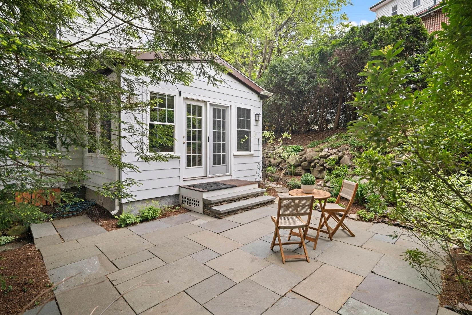 The serene bluestone patio off of the kitchen offers a natural, elegant outdoor retreat surrounded by lush greenery and charming stonework. It offers plenty of space for an outdoor dining set as well as comfortable patio furniture for relaxing and entertaining.
