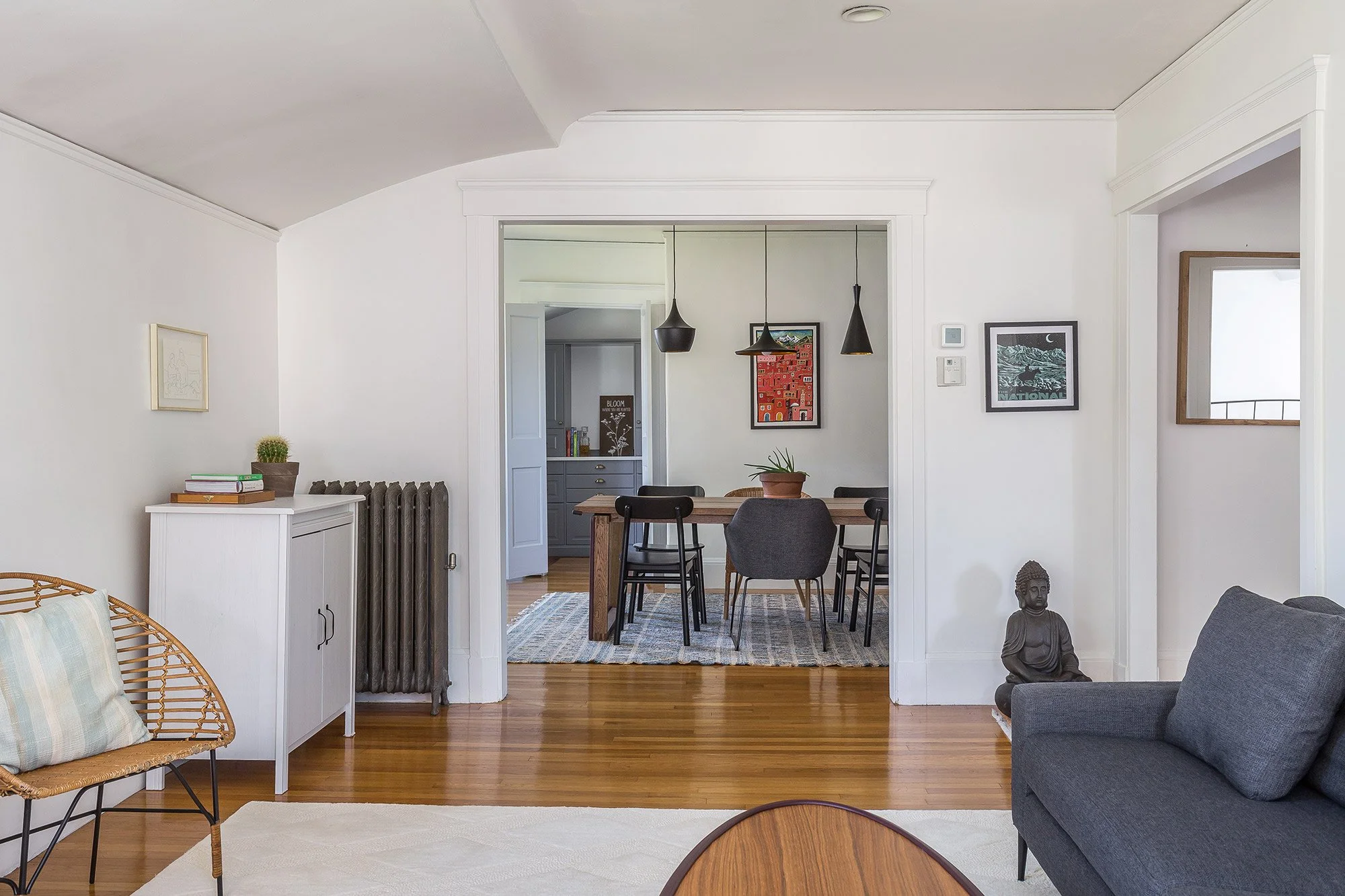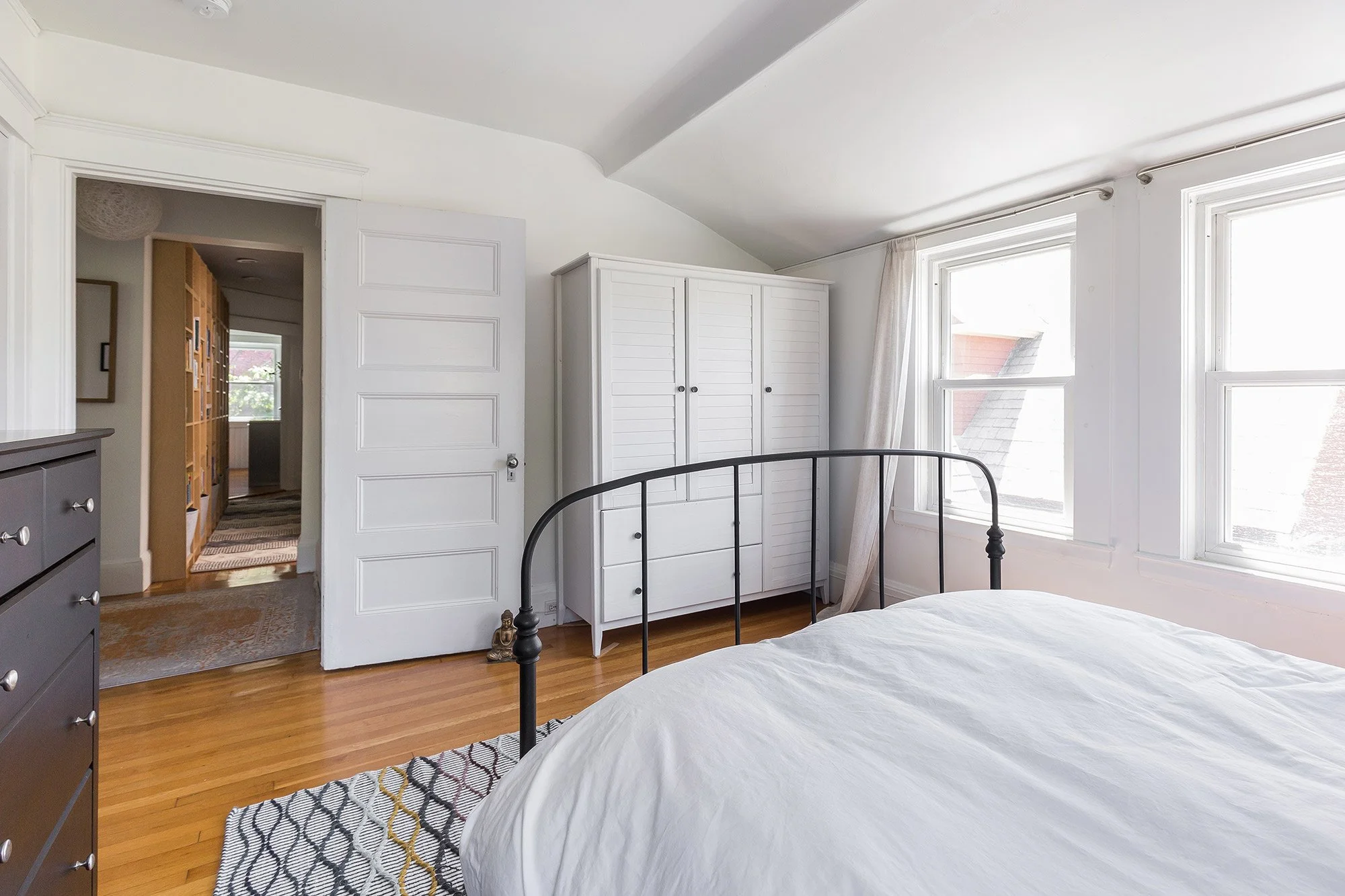 Down the hallway, lined with floor-to-ceiling book shelving, you will find the second bedroom, the full bath, an intercom system, the second entrance to the kitchen, and the rear egress down to the basement and exterior.