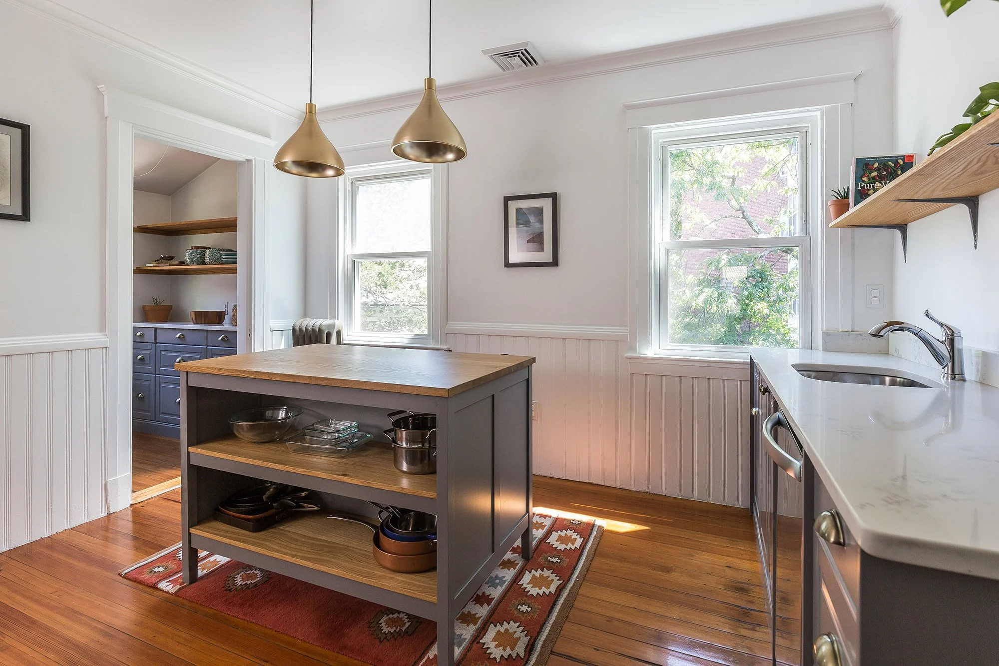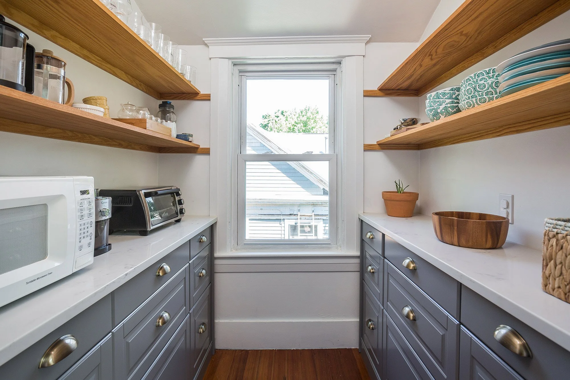 The bright and recently renovated kitchen (2018) offers stylish quartz countertops, gray cabinetry, stainless appliances, open shelving, fir hardwood flooring, a 2-seat wooden center island and two custom pantries. Appliances include a two-door refrigerator, a Frigidaire Dishwasher, a GE Gas Range, and a hood vent (not vented to exterior).