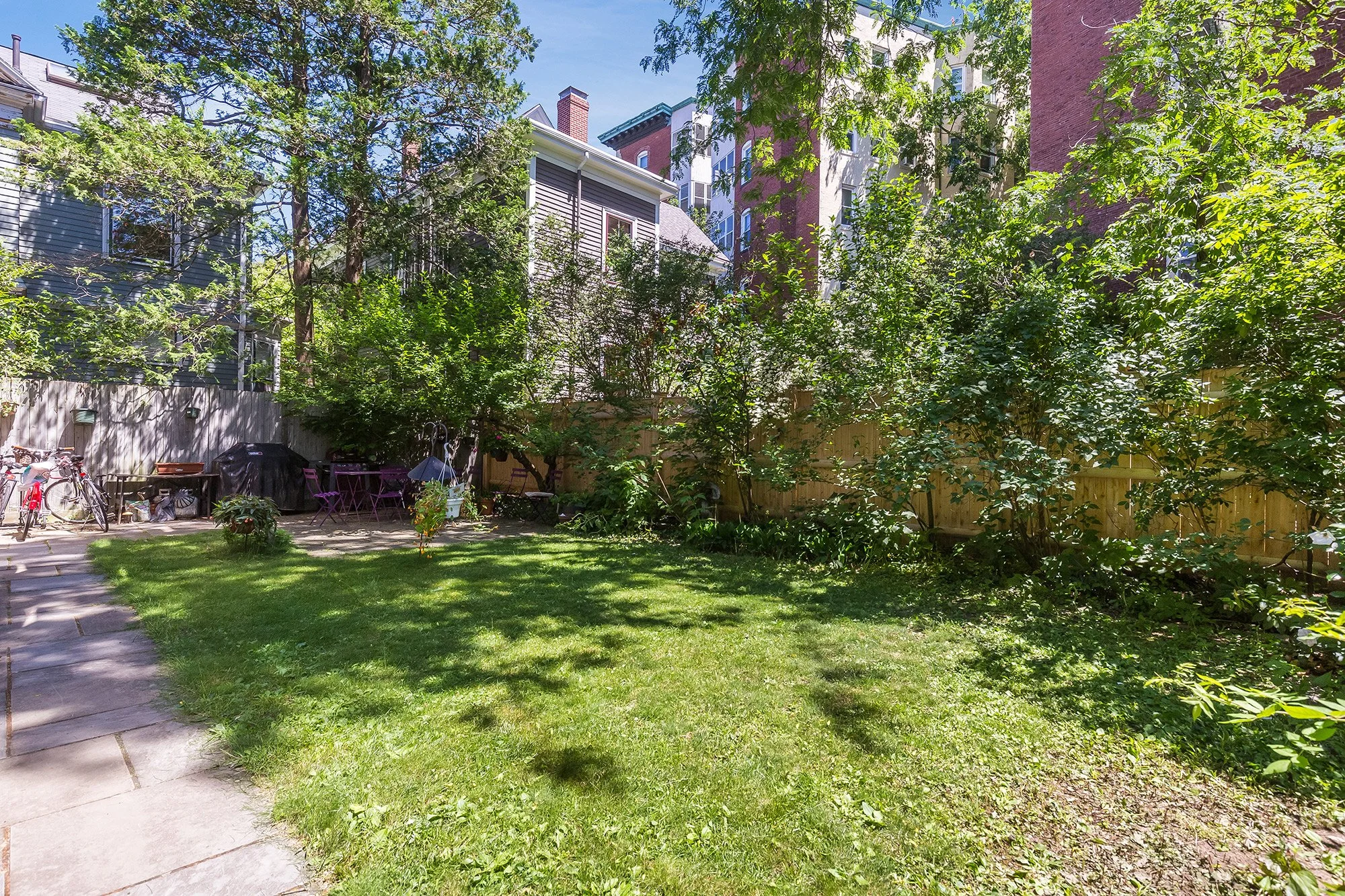The grounds offer mature landscaping, an asphalt walkway, an exceptionally large newly fenced-in backyard and a bluestone patio (shared).