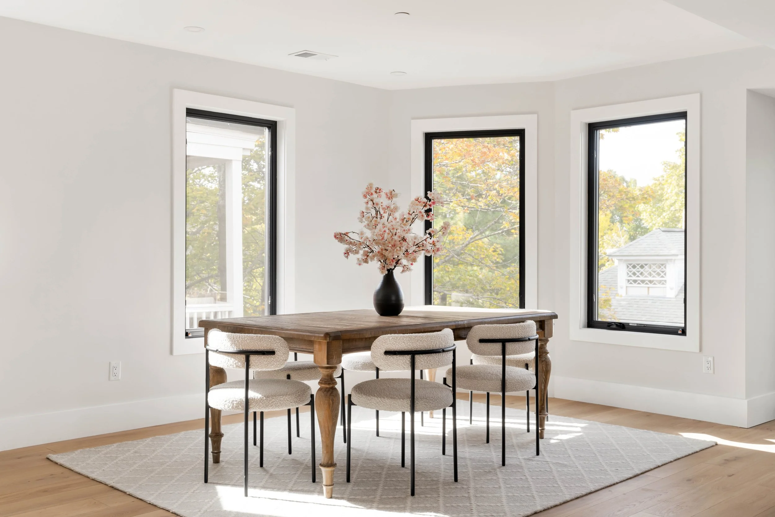 You are immediately greeted by a spacious open-concept kitchen, living, and dining space framed by oversized black Andersen windows, prefinished engineered white oak hardwoods, high ceilings, and contemporary lighting making a perfect space for entertaining. A convenient coat closet is located at the top of the stairs.