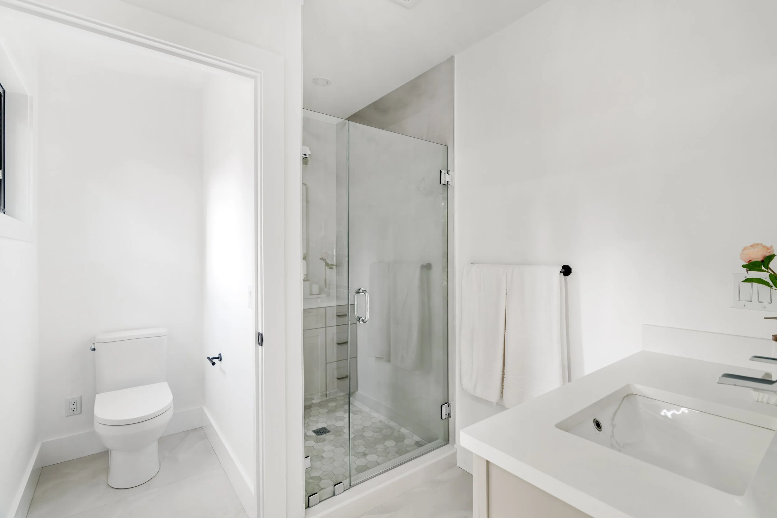 The stunning principal suite features high ceilings, black windows, two custom closets, and an impeccable ensuite bath. The ensuite has radiant electric heated flooring, chic porcelain flooring, a stylish vanity, a stand-up shower, and a water closet.