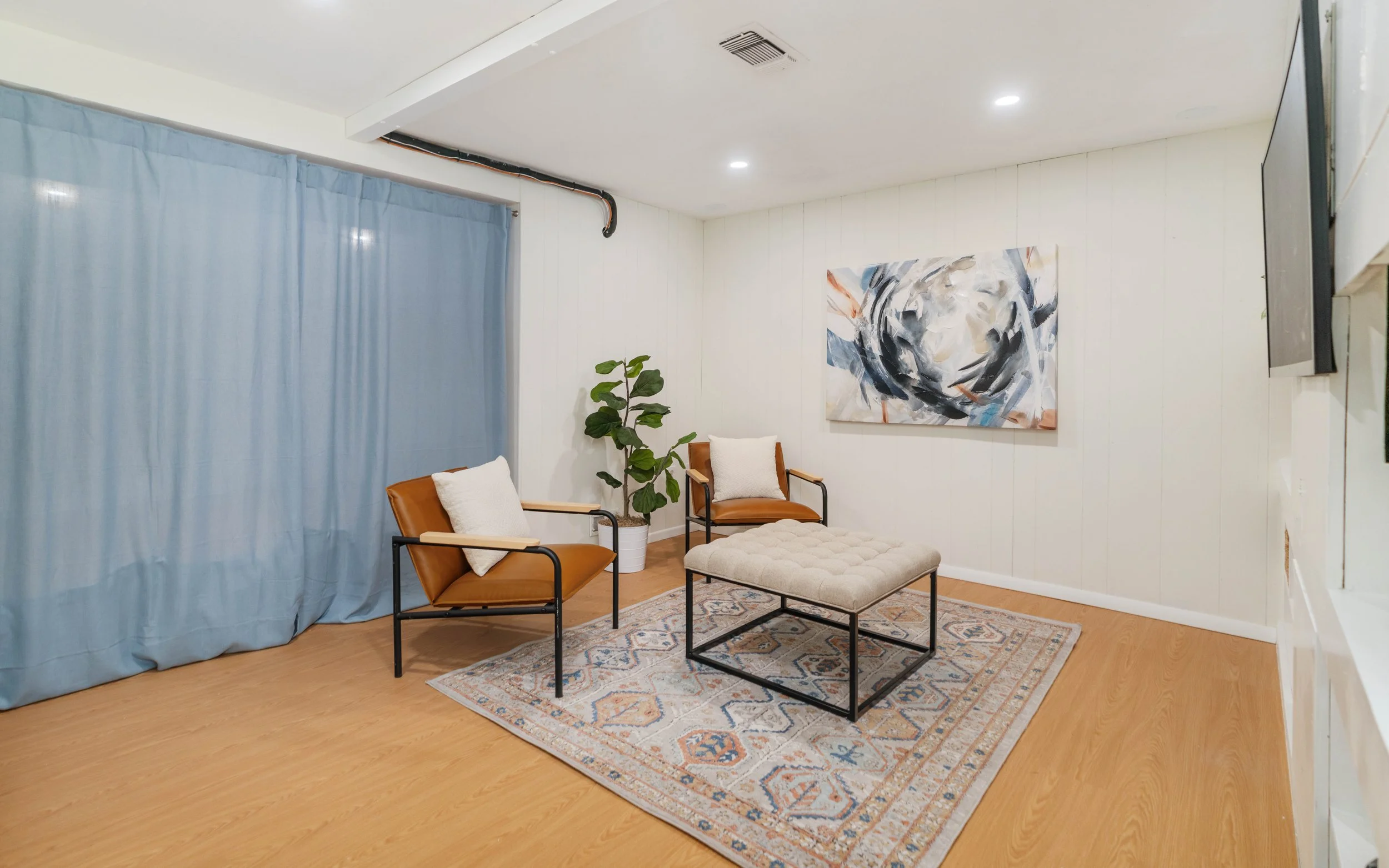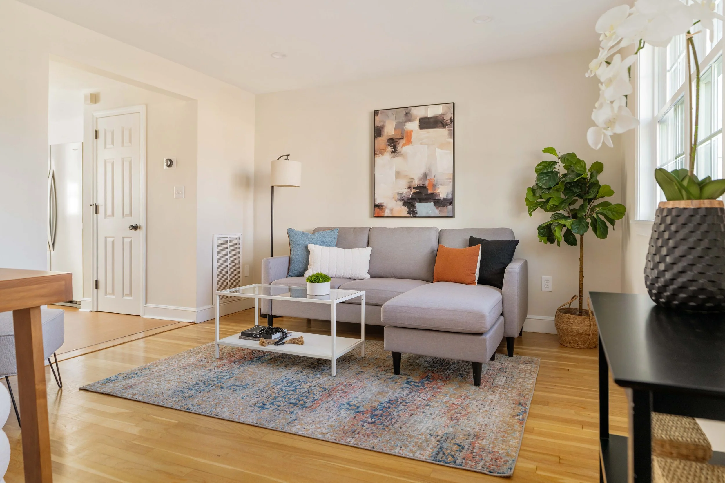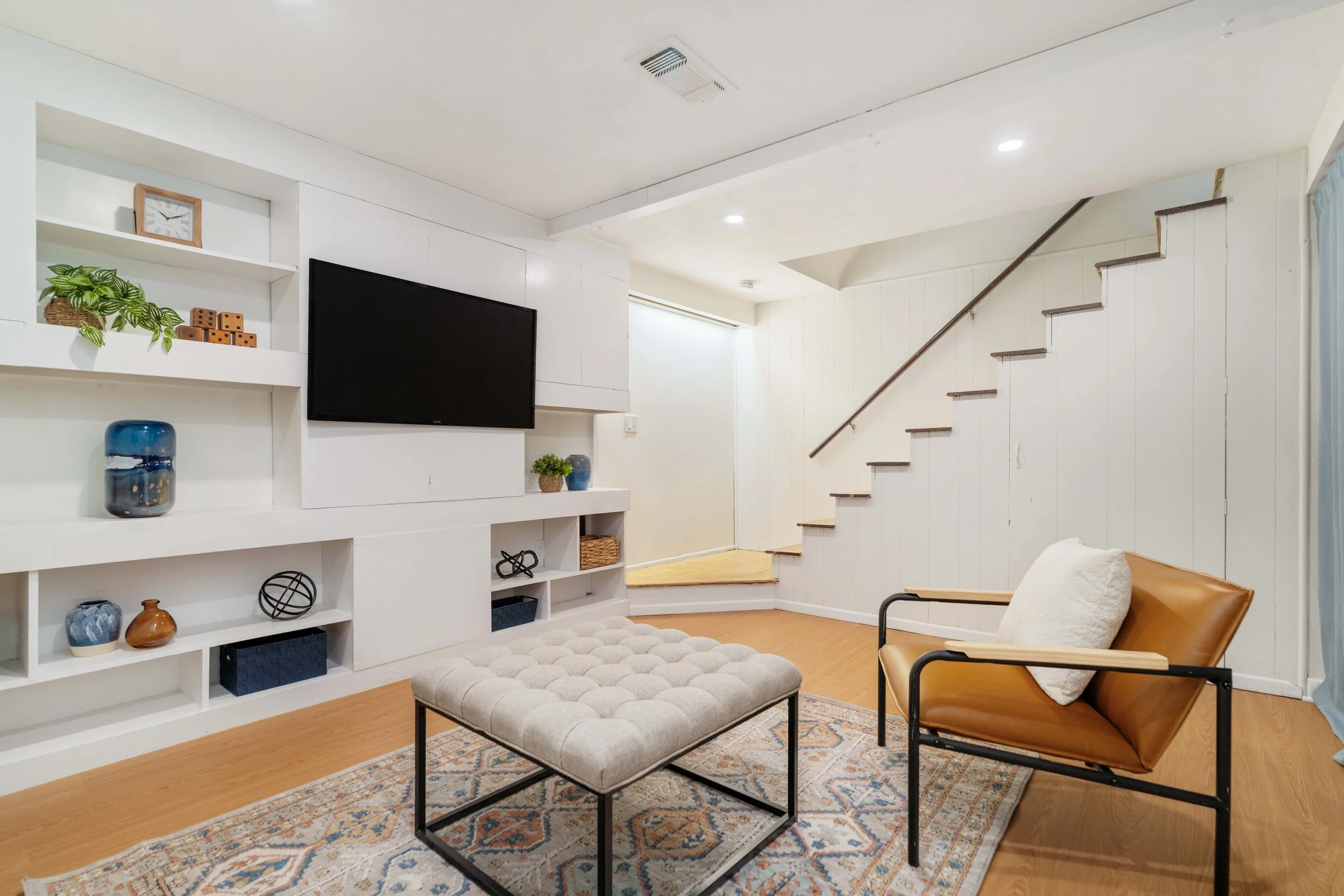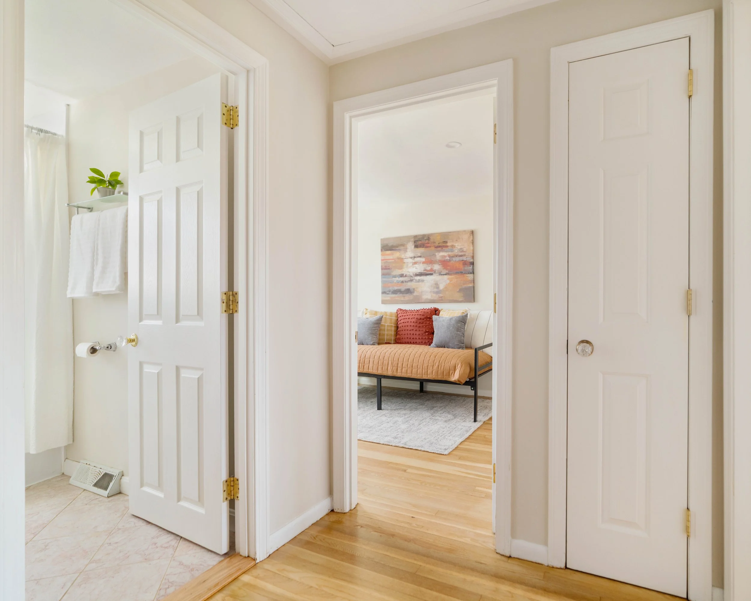Upon entering through the front door, you're greeted by a sunny, spacious living room with newly refinished white oak hardwood flooring. Adjacent to the living room and entryway, a staircase leads to the upper level.