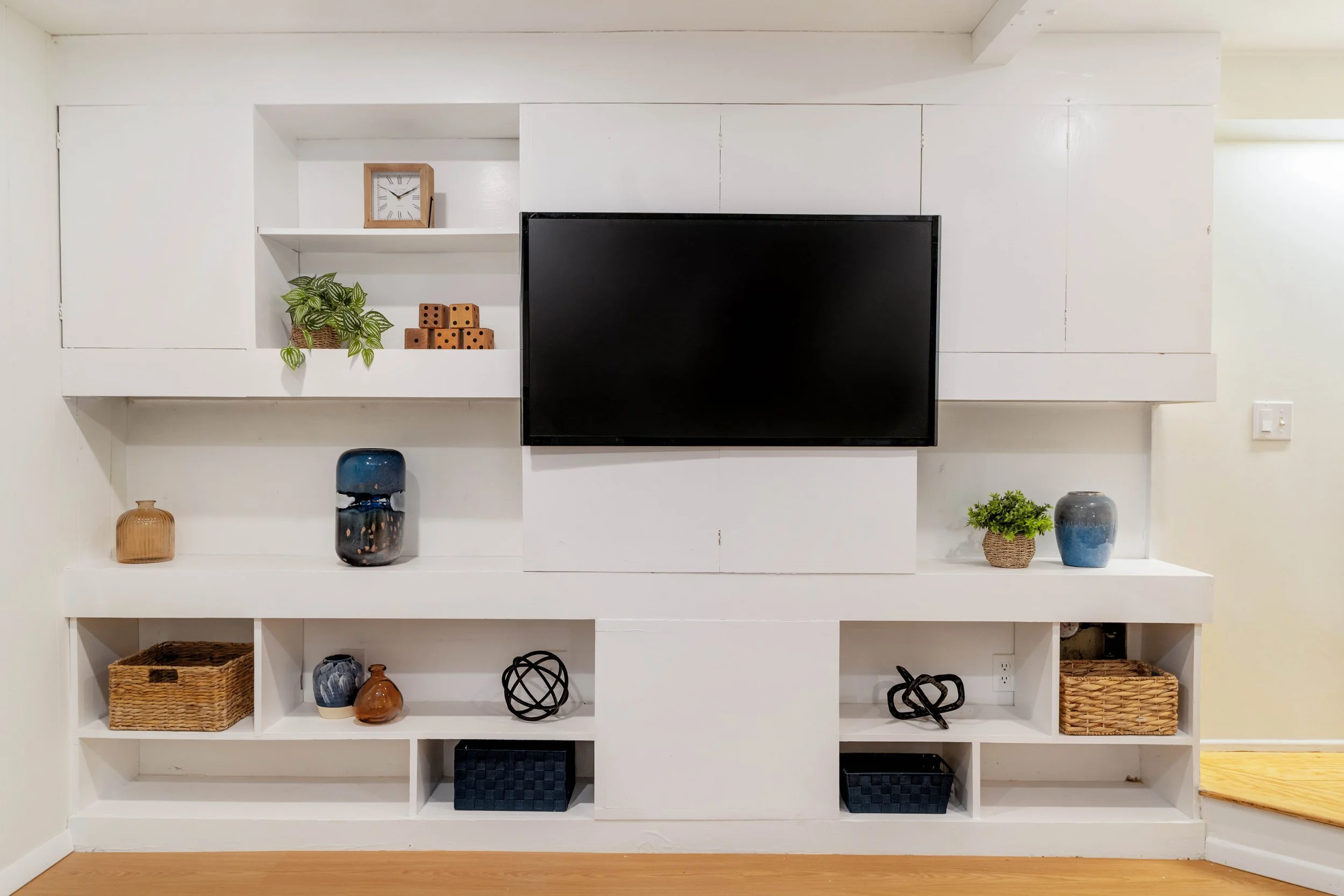 Back downstairs, a French door off the kitchen opens to a stairway leading to the finished basement. At the base of the stairs, you'll find a spacious family room with laminate flooring, anchored by built-in shelves ideal for storage or displaying décor.