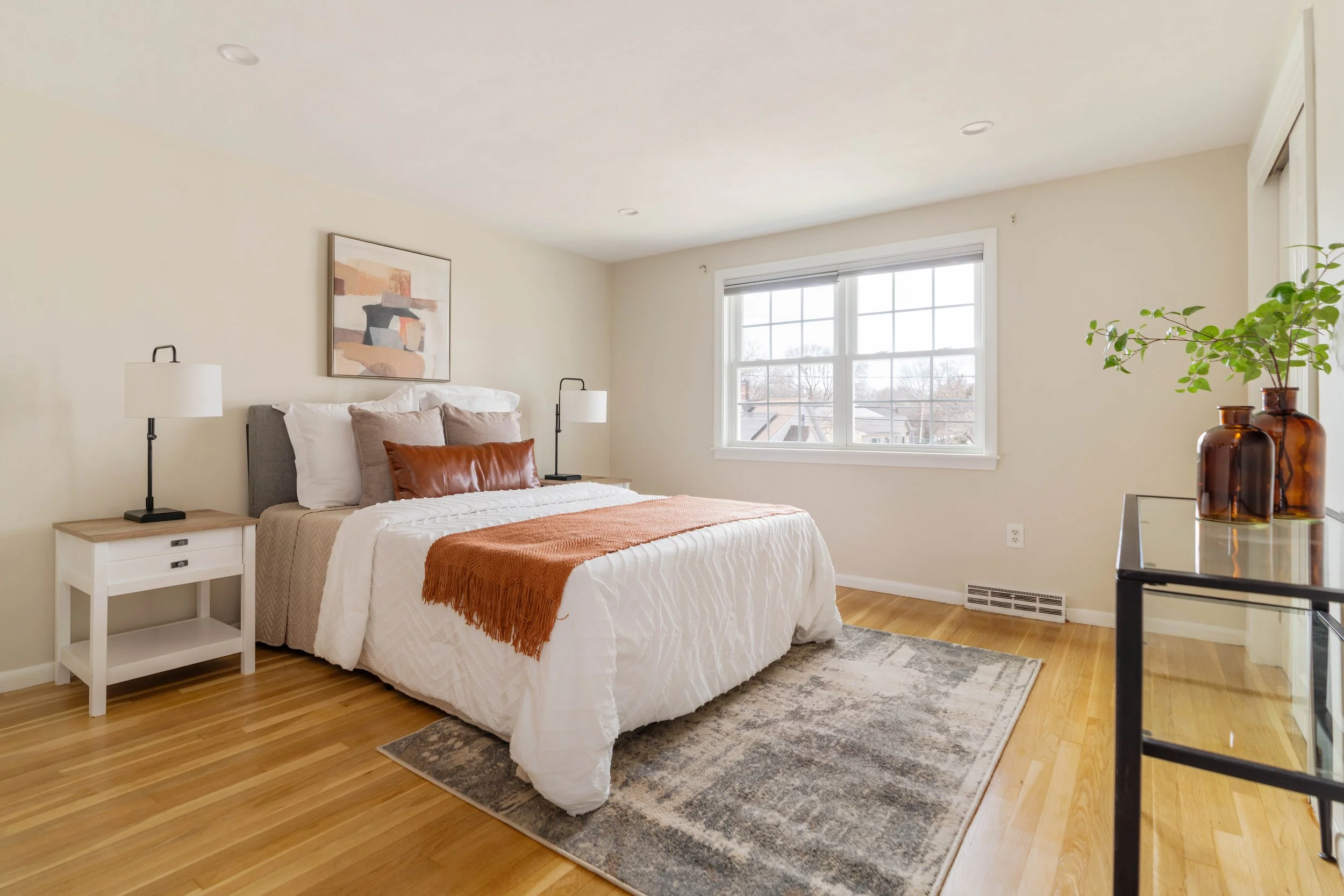 The large primary bedroom, situated to the right of the landing, features two windows overlooking the quiet street and a large closet.
