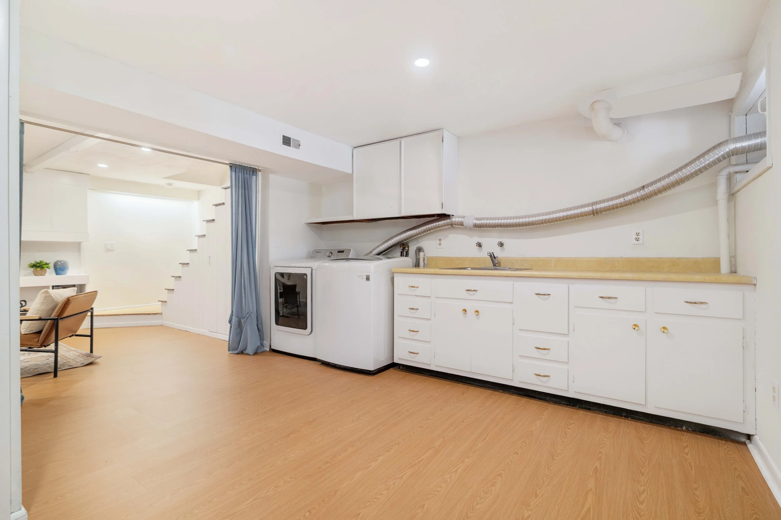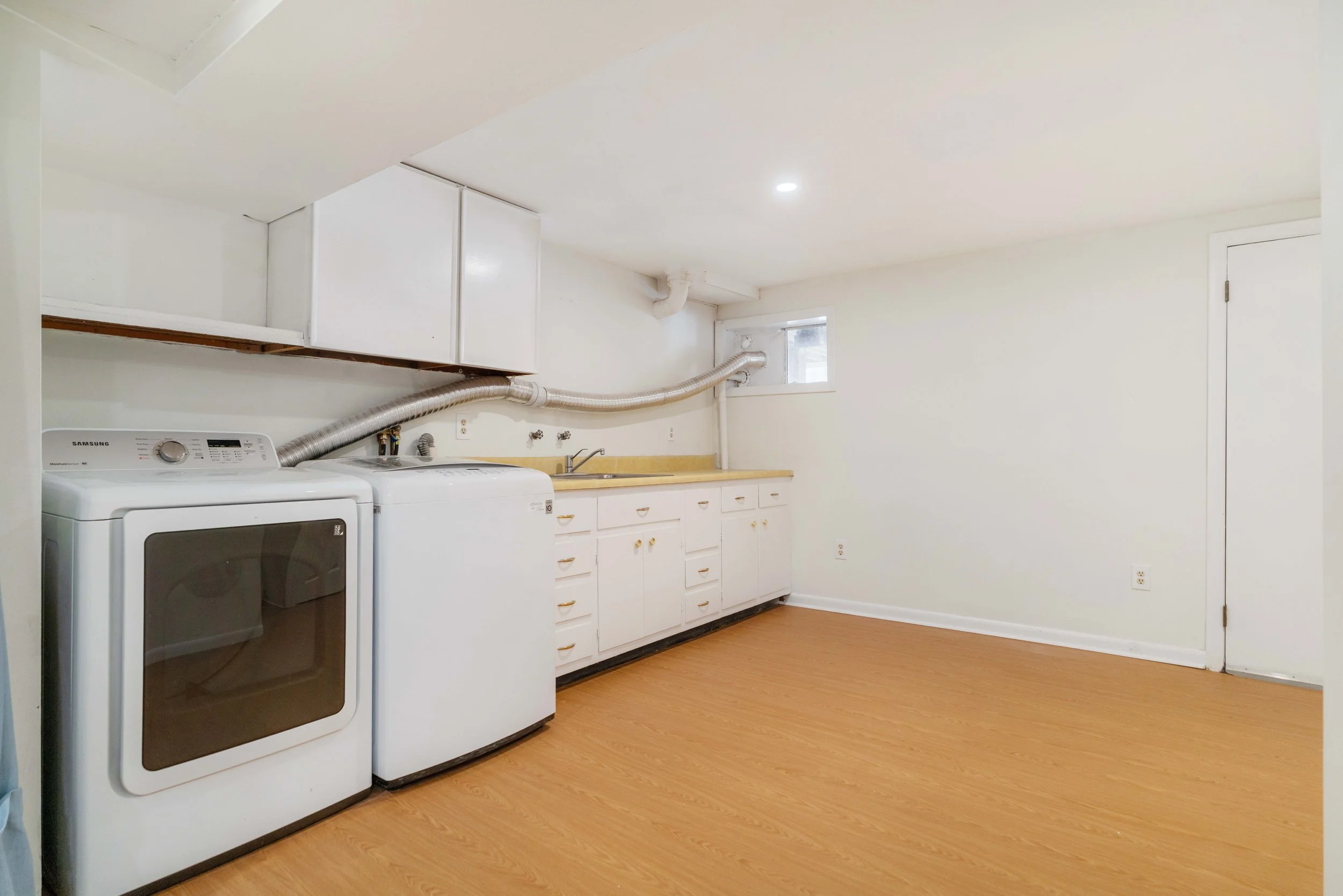 Toward the rear of the basement, there’s a washer and dryer, laundry sink, storage cabinetry, and open countertops that can be utilized for home projects. Additional storage includes a closet and a utility closet housing the hot water heater and HVAC system.