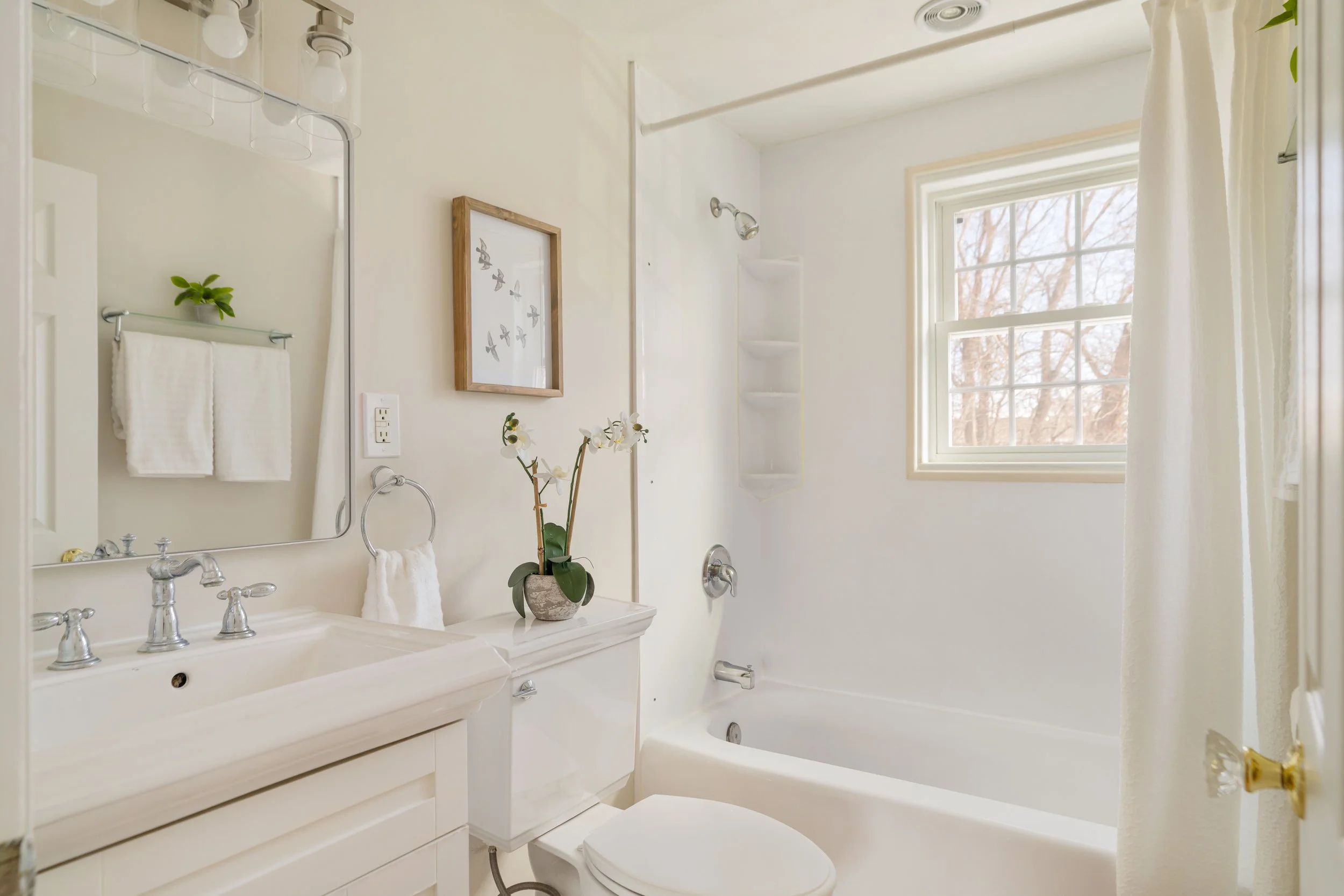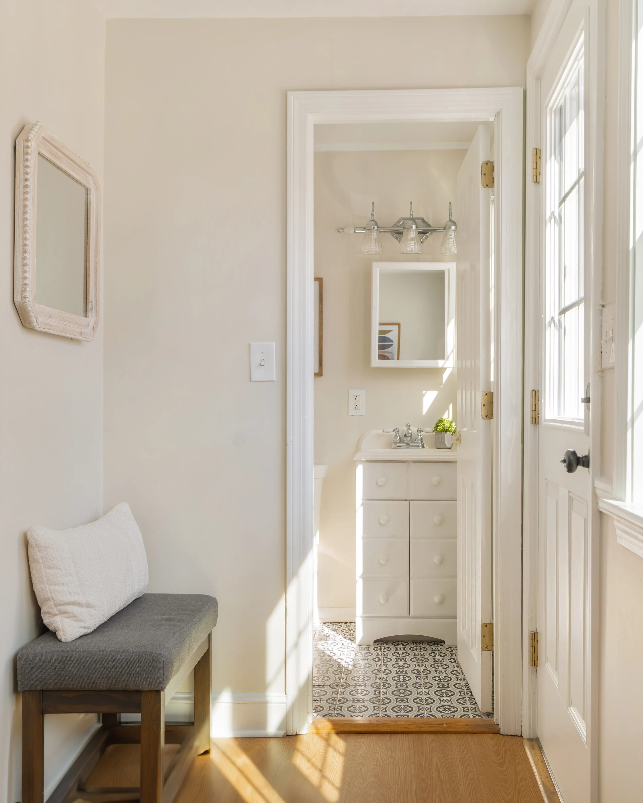 Just outside the second bedroom, the full bathroom boasts a new vanity light and mirror, tiled flooring, and a tub with a shower.