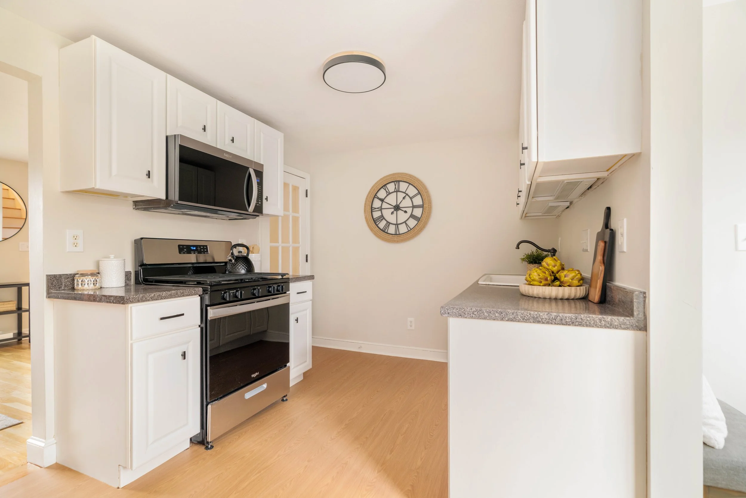 The living room flows seamlessly into the eat-in kitchen in this flexible floor plan, which has been renovated with a new stainless steel double-door refrigerator, dishwasher, microwave, gas range, new laminate flooring and crisp white cabinetry.
